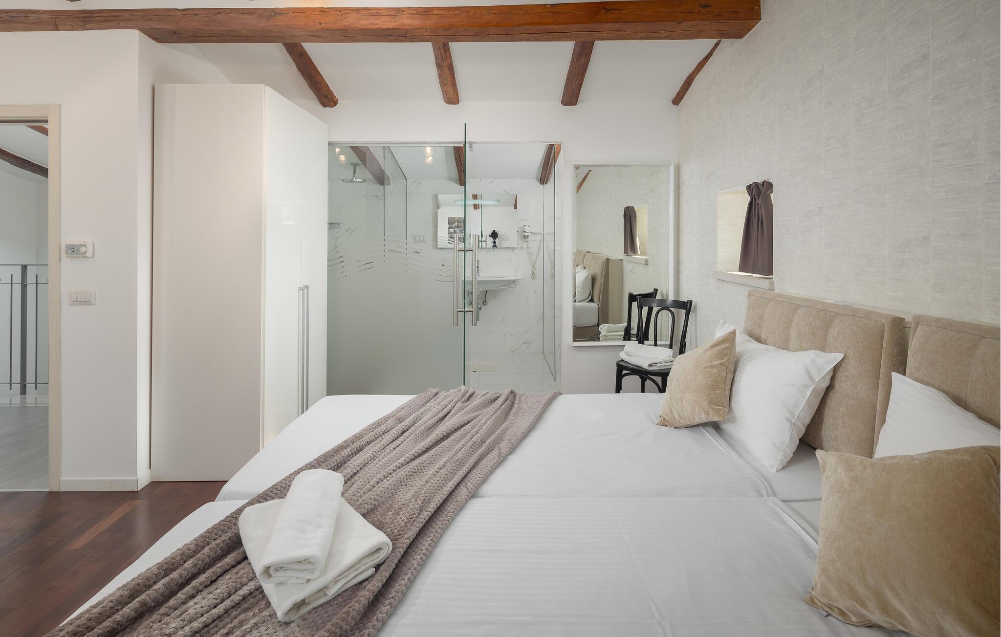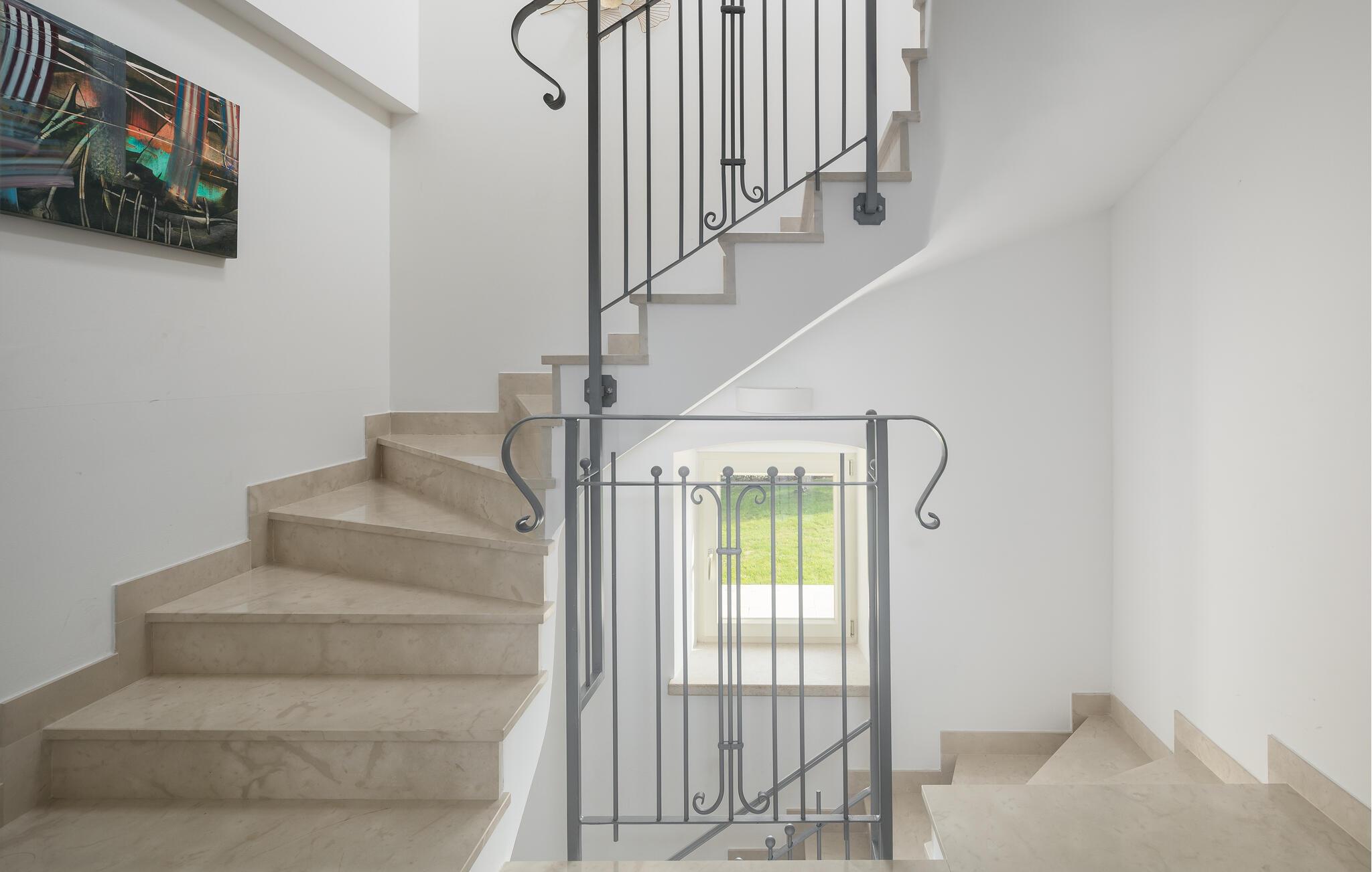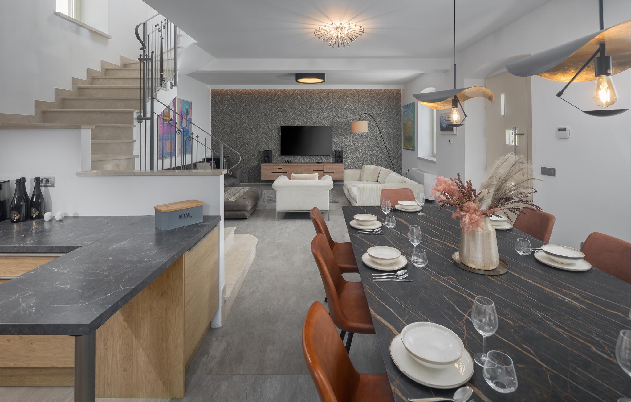 Die Villa Bruna liegt in der Stadt Porec, die für Ihr reiches Kulturerbe bekannt und ideal für einen entspannenden Urlaub ist. Diese Villa wurde in einer modernen Stillrichtung restauriert mit vielen handverlesenen Details und Möbelstücken, die für eine warme und einladende Atmosphäre sorgen. Das Anwesen besteht aus 3 Häusern und kann bis zu 10+2 Personen beherbergen. Das Haupthaus besteht aus 2 Etagen. Im Erdgeschoss finden Sie ein geräumiges Wohnzimmer, ein Esszimmer und eine komplett ausgestattete Küche. Die Schlafzimmer sind über 2 Etagen verteilt. Auf der ersten Etage befinden sich 2 Schlafzimmer mit jeweils einem Doppelbett und auf der zweiten Etage 2 Schlafzimmer mit jeweils 2 Einzelbetten, die zum Doppelbett zusammengeschoben werden können.