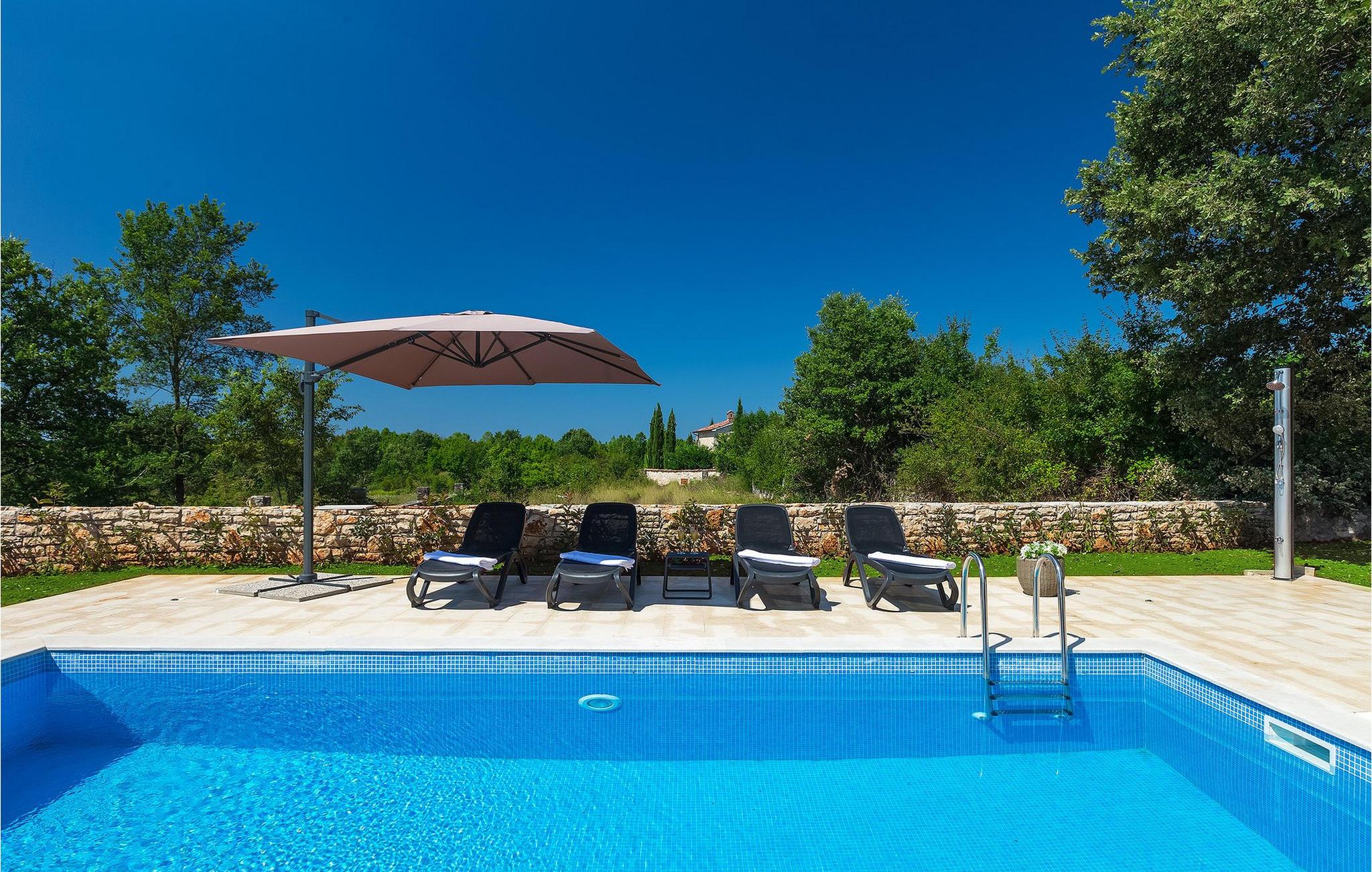 Ein paar Stufen führen vom Erdgeschoß der Villa zum Poolbereich, wo bequeme Sonnenliegen auf Sie warten. Nehmen Sie ein erfrischendes Getränk mit und genießen Sie die Sonne am Pool. Der Außenbereich verfügt auch über einen schönen Garten mit mehreren Sitzecken. Bereiten Sie leckere Spezialitäten auf dem Steingrill und genießen Sie diese im Freien. Die Villa ist klimatisiert. hat WiFi und einen privaten Parkplatz.