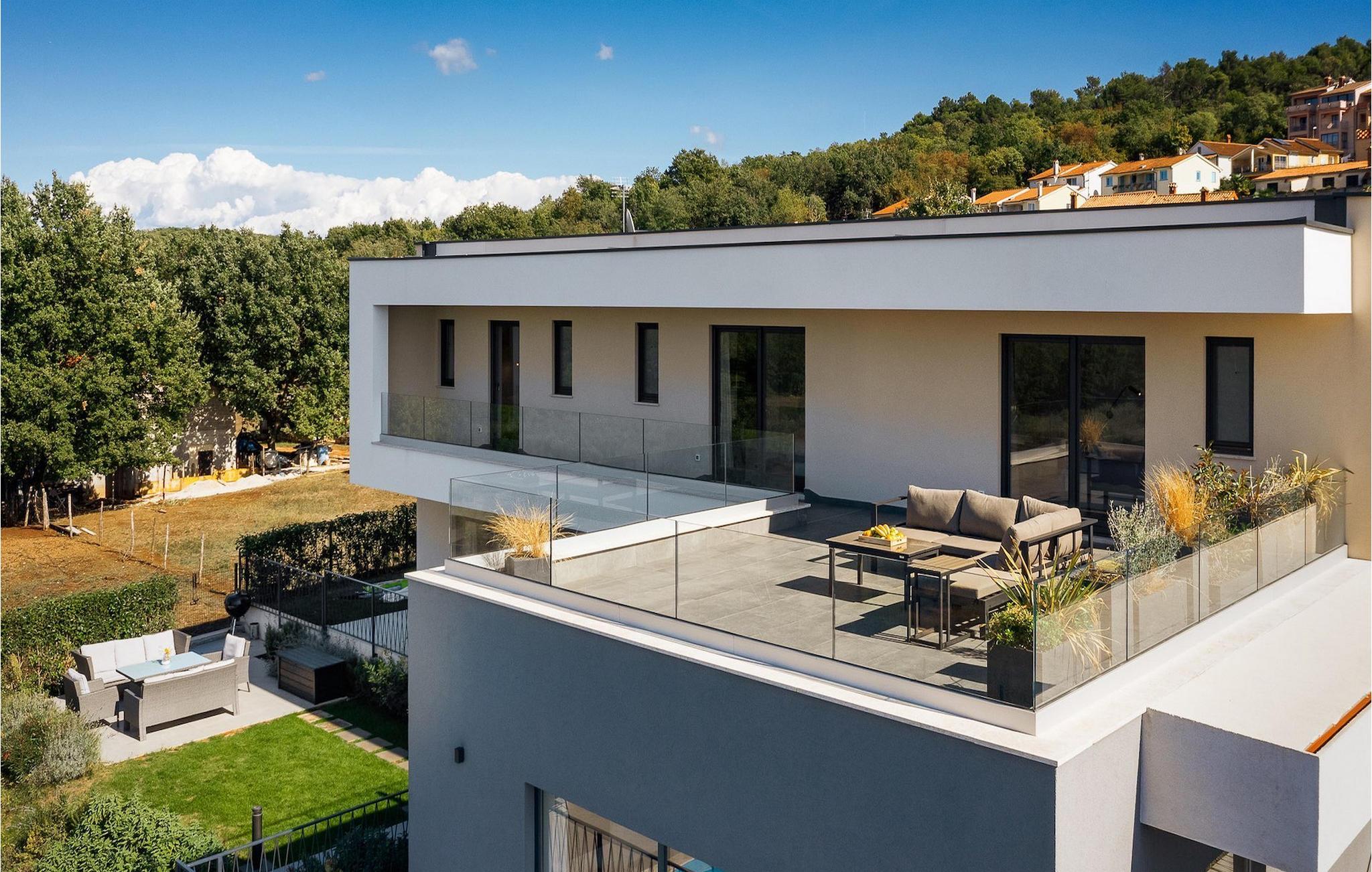 Beide Bereiche haben Zugang zur großen Veranda, die einen wunderschönen Blick auf den Außenbereich bietet. Eine Treppe führt zum privaten Pool mit Sonnenliegen, wo Sie Ihre Seele baumeln lassen können. In der Nähe finden Sie auch eine gemütliche Sitzecke mit Holzkohlegrill für leckere Mahlzeiten.