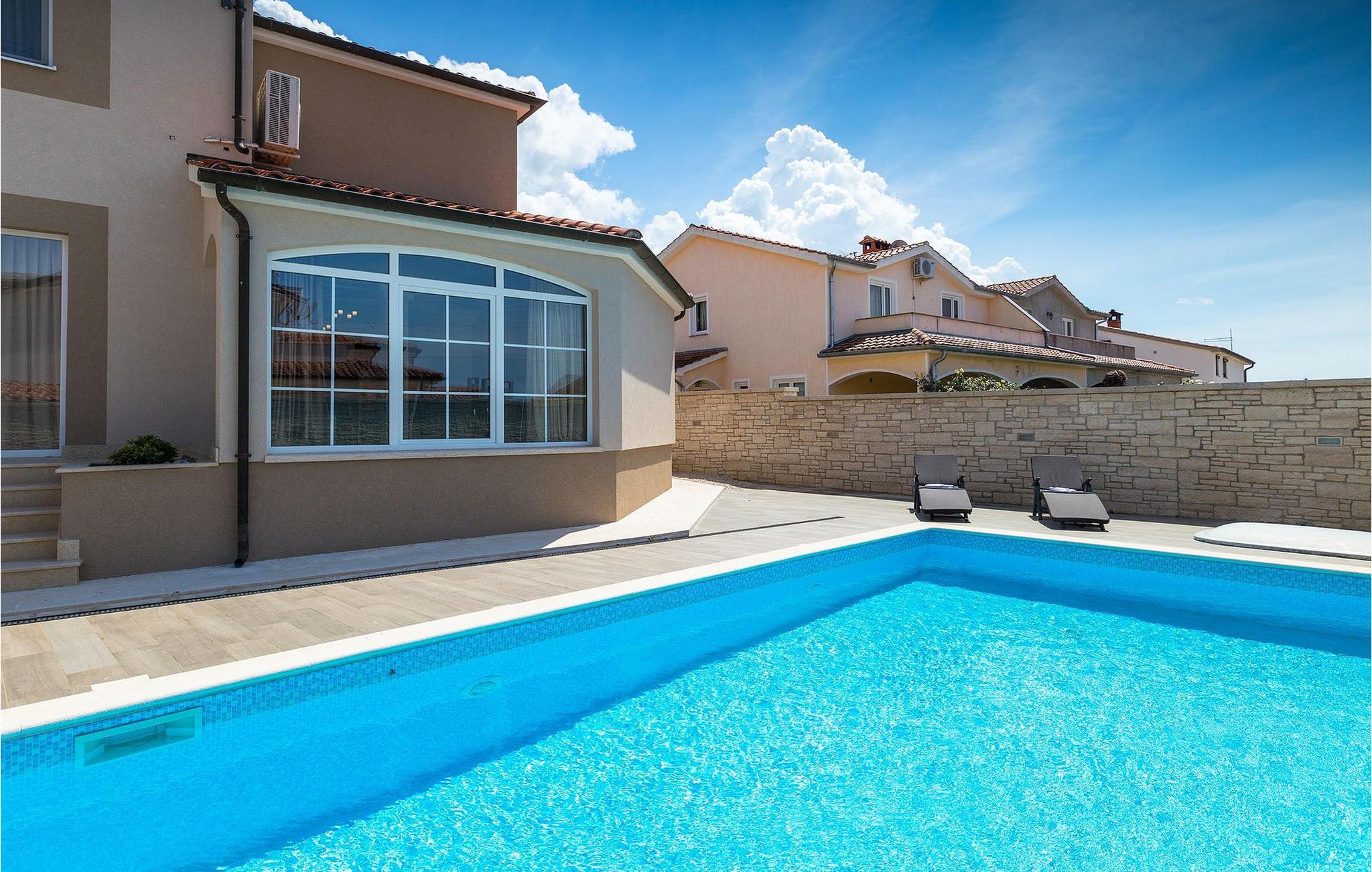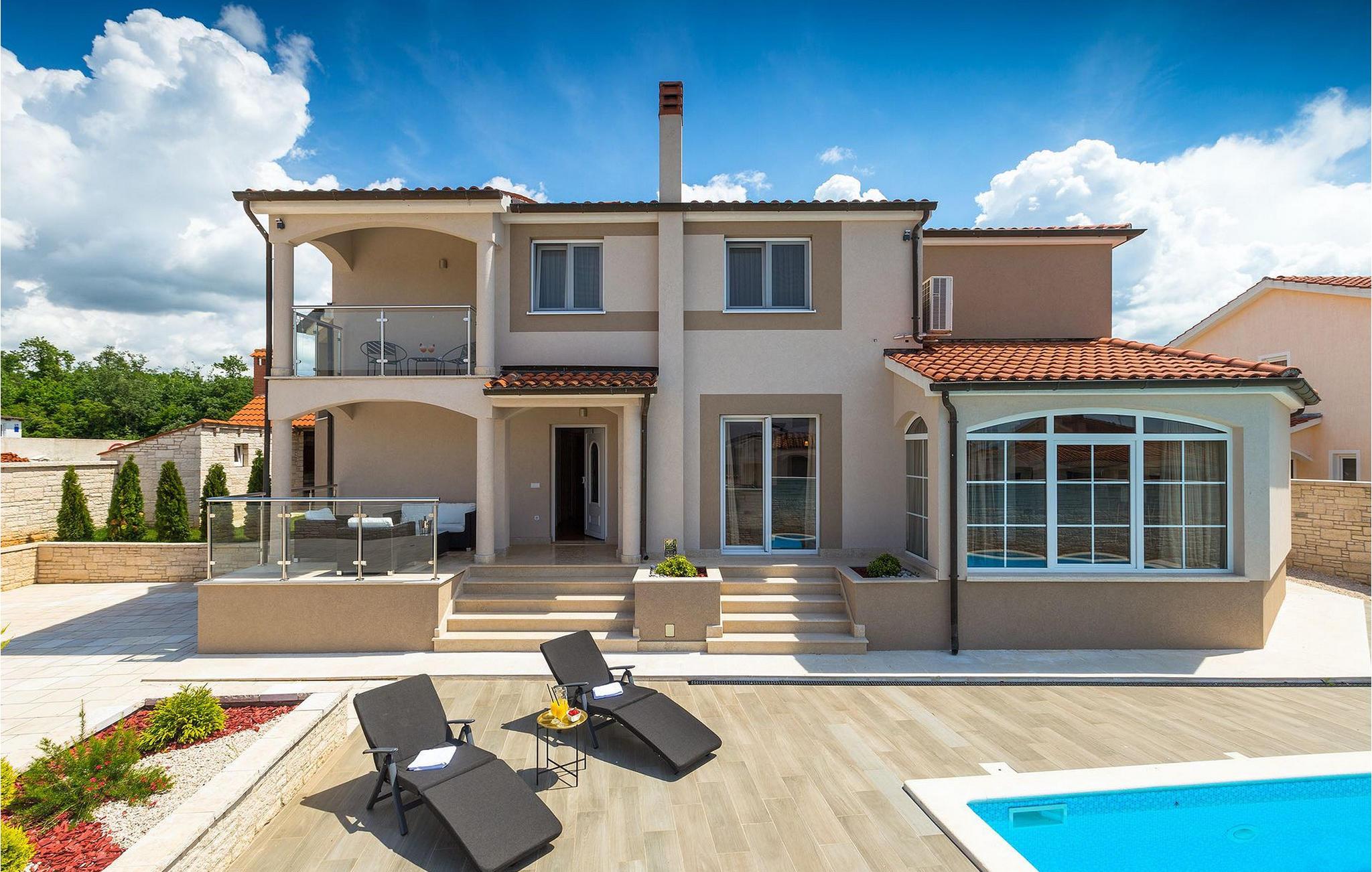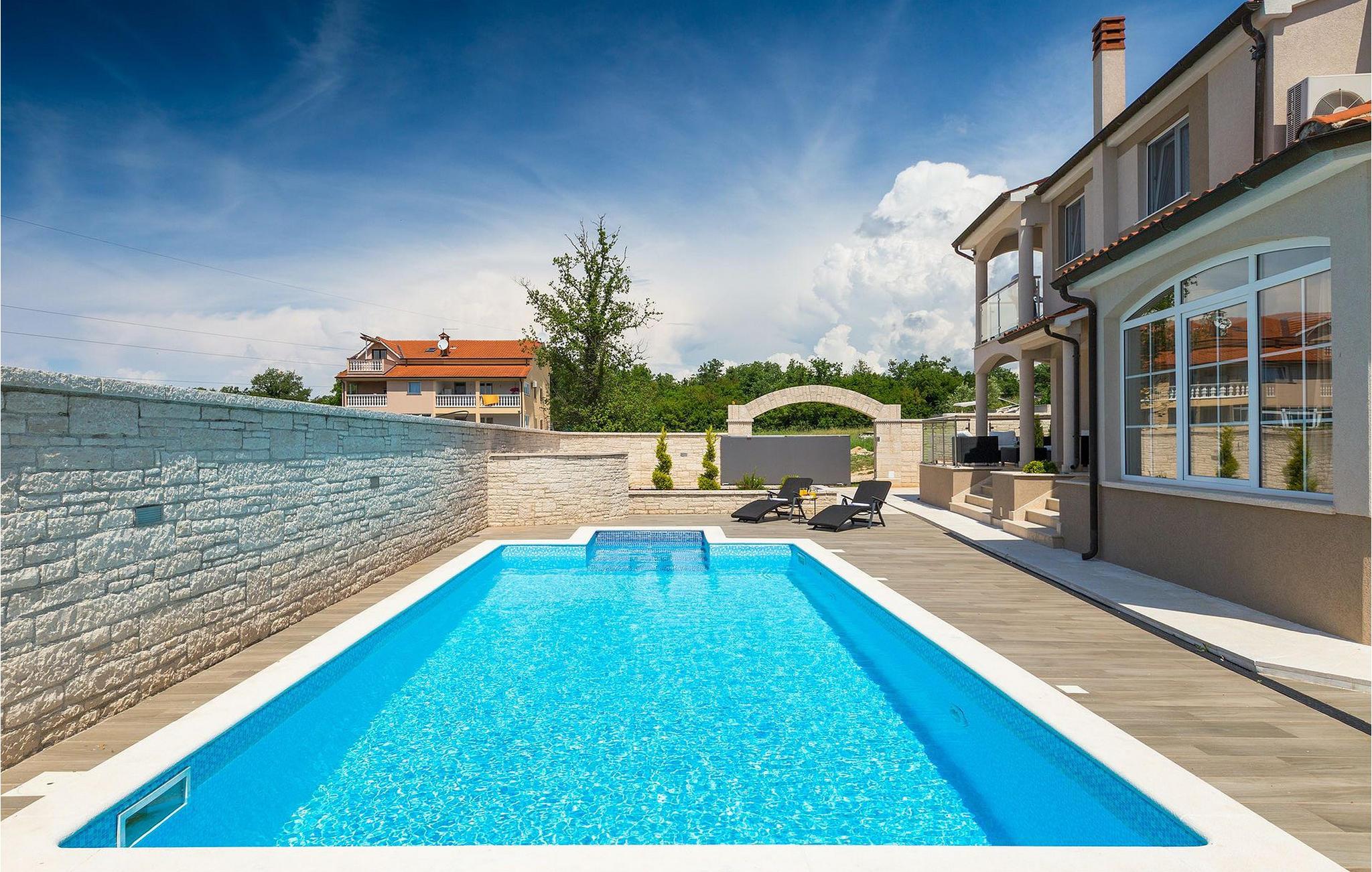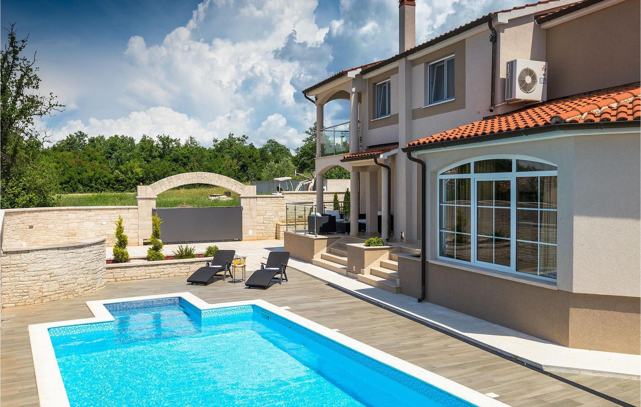 Villa Gordana, in der Nähe der Stadt Porec gelegen, sowie in der Nähe der Strände von Porec, ist für bis zu 8 Personen geeignet. Die obere Etage ist in 4 gemütliche Schlafzimmer unterteilt, von denen jedes klimatisiert ist, und eines auch Zugang zum schönen Balkon hat, von dem Sie die Aussicht auf die Umgebung genießen können. Das Erdgeschoss besteht aus dem geräumigen und sehr eleganten Wohnzimmer mit Kamin, das mit dem Essbereich und der völlig ausgestatteten Küche mit moderner Kochinsel und zusätzlichen Sitzplätzen verbunden ist. Die großen Glasflächen im Essbereich ermöglichen viel natürliches Licht in der Villa, ermöglichen Ihnen aber auch einen hervorragenden Blick auf den privaten Pool, den Sie auf einer der Sonnenliegen genießen können. Das Innenbereich dieser Villa ist sehr elegant und stilvoll eingerichtet und dekoriert, sowie sehr gut mit allen Annehmlichkeiten ausgestattet, die Sie benötigen könnten, damit Sie einen tatsächlich erholsamen Urlaub verbringen können. Jüngere Gruppen sind in der Villa nicht erlaubt.Porec ist ein wahres touristisches Hotspot, wo man alle Arten von Aktivitäten, Restaurants, Bars und Clubs finden kann. Die Stadt ist vor allem für ihr reiches kulturelles Erbe bekannt. Porec, früher eine römische Kolonie, erreichte seinen Höhepunkt während der Herrschaft des byzantinischen Kaiser Justinian. Die atemberaubende Euphrasius Basilika, die in der Mitte des 6. Jahrhunderts erbaut wurde und heute unter dem UNESCO- Schutz steht, ist definitiv ein “must see”.