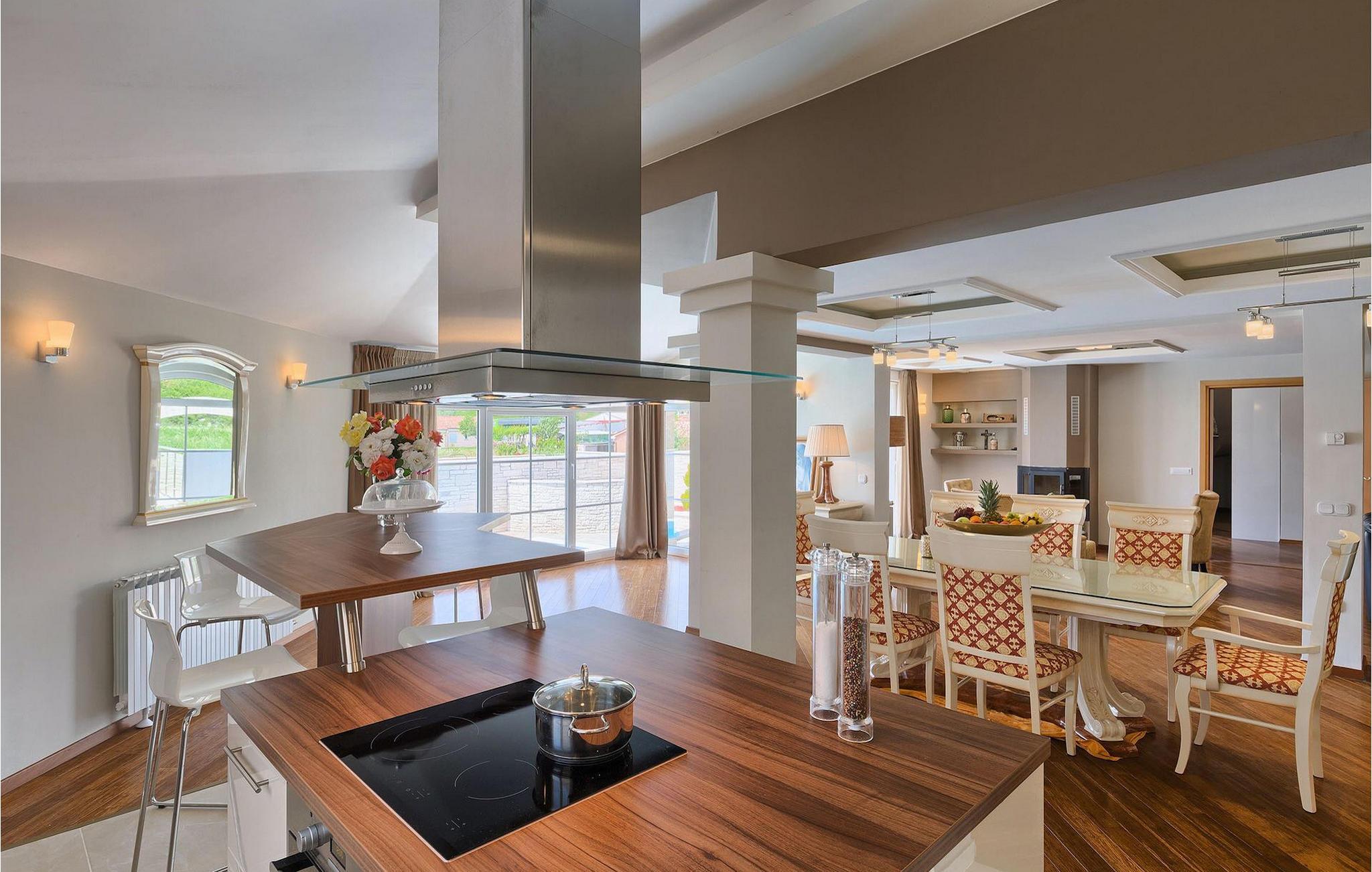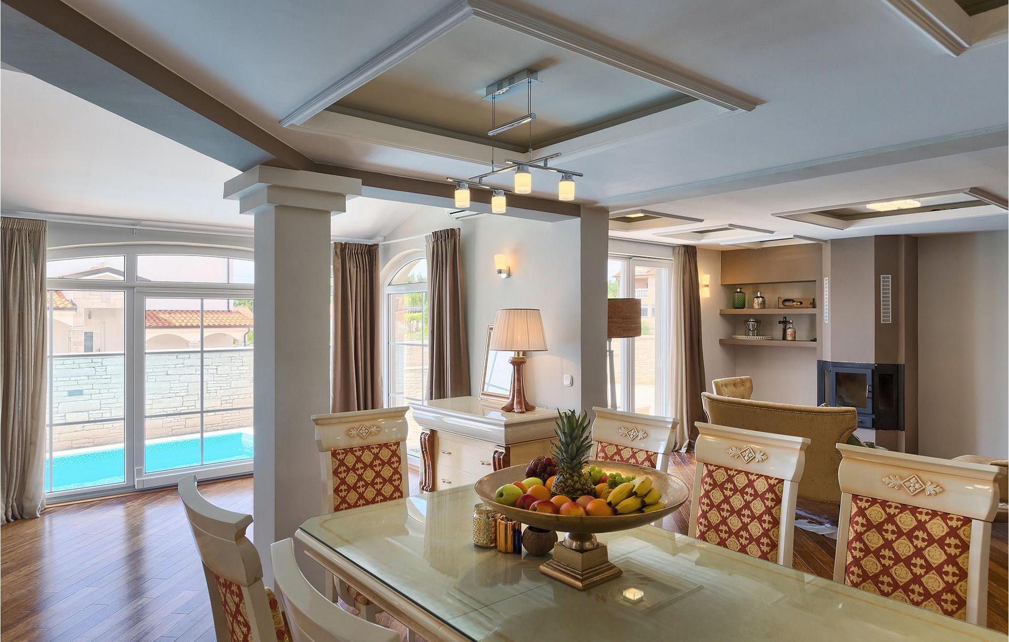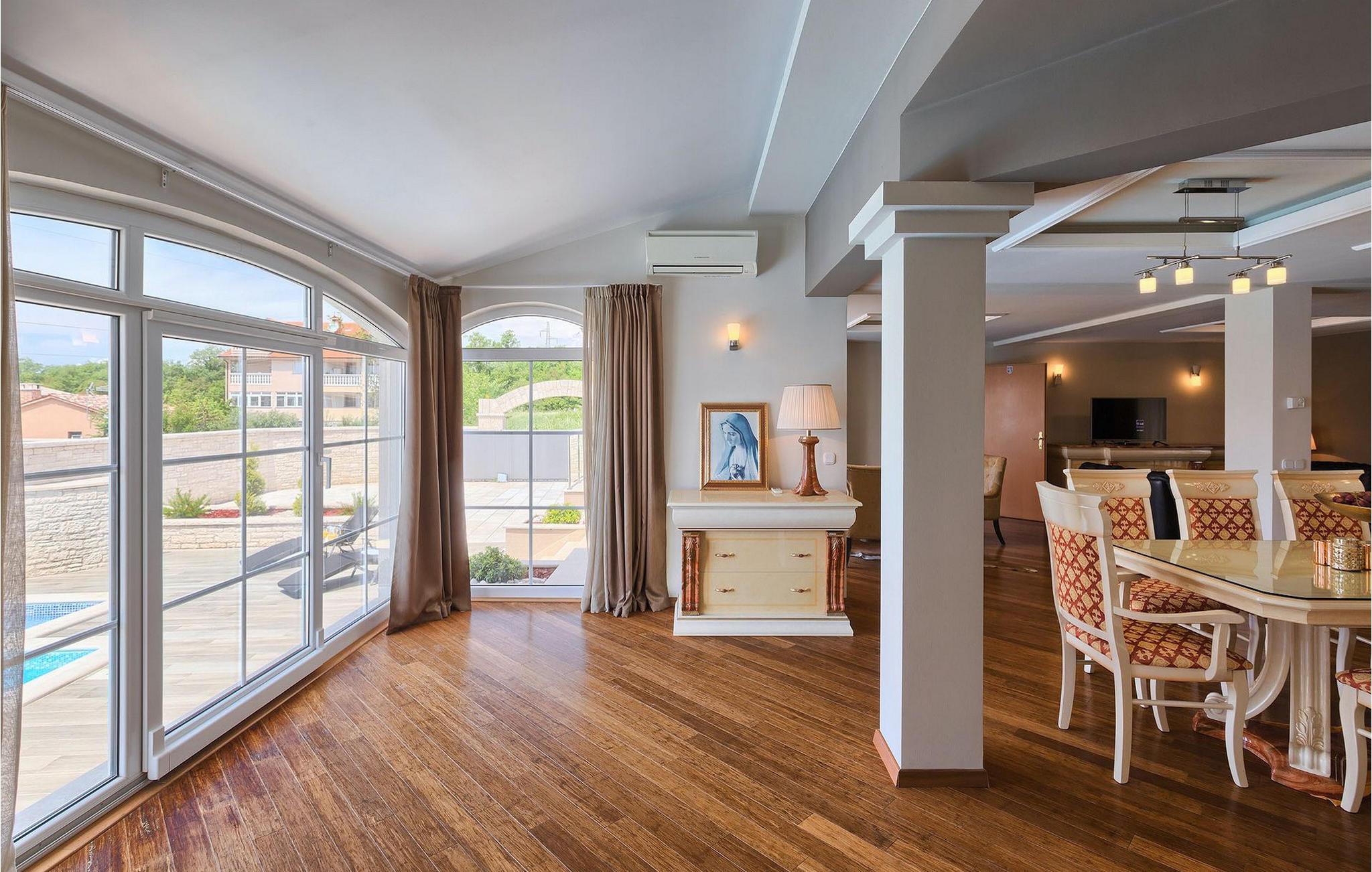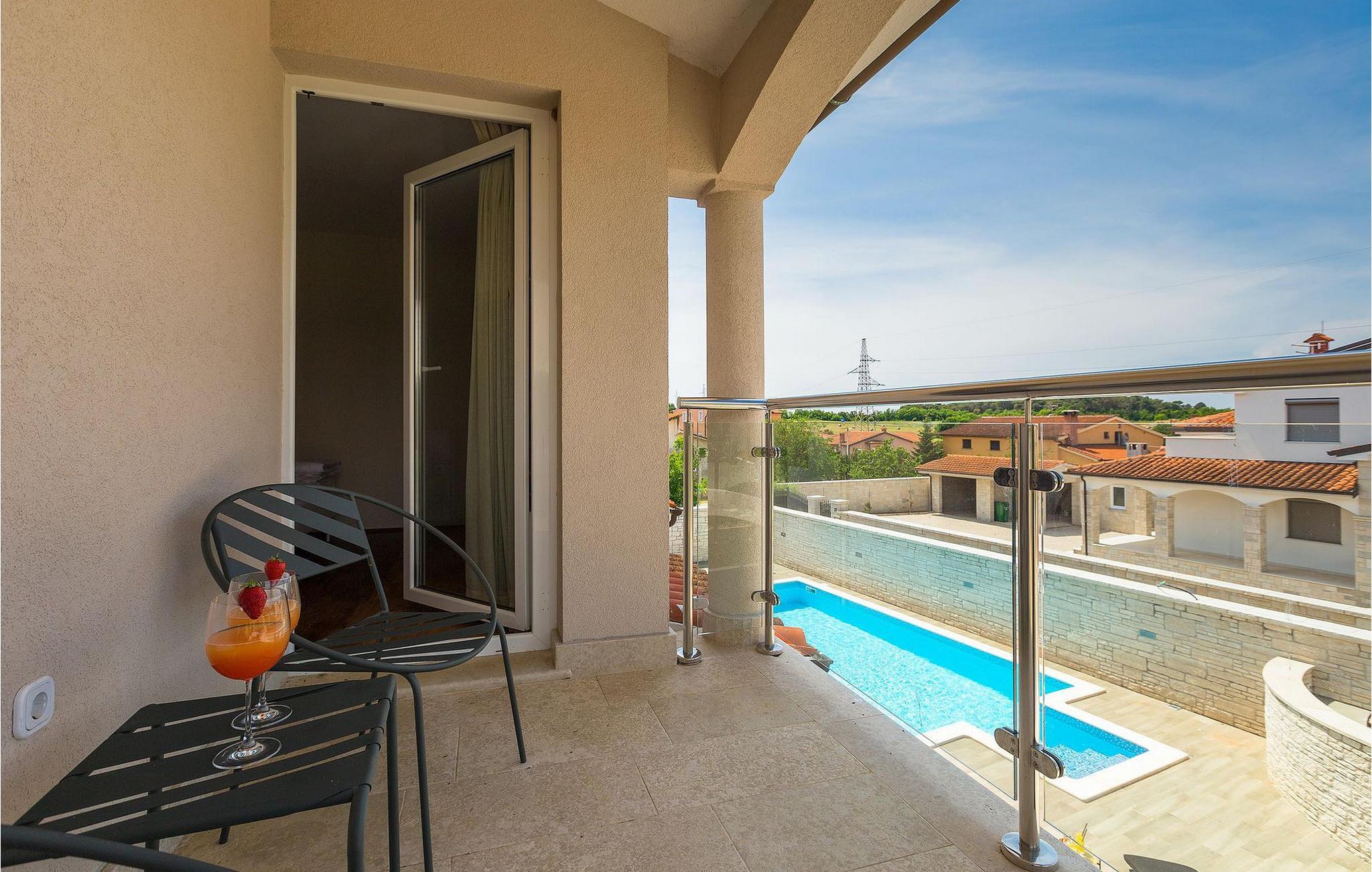 Villa Gordana, in der Nähe der Stadt Porec gelegen, sowie in der Nähe der Strände von Porec, ist für bis zu 8 Personen geeignet. Die obere Etage ist in 4 gemütliche Schlafzimmer unterteilt, von denen jedes klimatisiert ist, und eines auch Zugang zum schönen Balkon hat, von dem Sie die Aussicht auf die Umgebung genießen können. Das Erdgeschoss besteht aus dem geräumigen und sehr eleganten Wohnzimmer mit Kamin, das mit dem Essbereich und der völlig ausgestatteten Küche mit moderner Kochinsel und zusätzlichen Sitzplätzen verbunden ist. Die großen Glasflächen im Essbereich ermöglichen viel natürliches Licht in der Villa, ermöglichen Ihnen aber auch einen hervorragenden Blick auf den privaten Pool, den Sie auf einer der Sonnenliegen genießen können. Das Innenbereich dieser Villa ist sehr elegant und stilvoll eingerichtet und dekoriert, sowie sehr gut mit allen Annehmlichkeiten ausgestattet, die Sie benötigen könnten, damit Sie einen tatsächlich erholsamen Urlaub verbringen können. Jüngere Gruppen sind in der Villa nicht erlaubt.Porec ist ein wahres touristisches Hotspot, wo man alle Arten von Aktivitäten, Restaurants, Bars und Clubs finden kann. Die Stadt ist vor allem für ihr reiches kulturelles Erbe bekannt. Porec, früher eine römische Kolonie, erreichte seinen Höhepunkt während der Herrschaft des byzantinischen Kaiser Justinian. Die atemberaubende Euphrasius Basilika, die in der Mitte des 6. Jahrhunderts erbaut wurde und heute unter dem UNESCO- Schutz steht, ist definitiv ein “must see”.