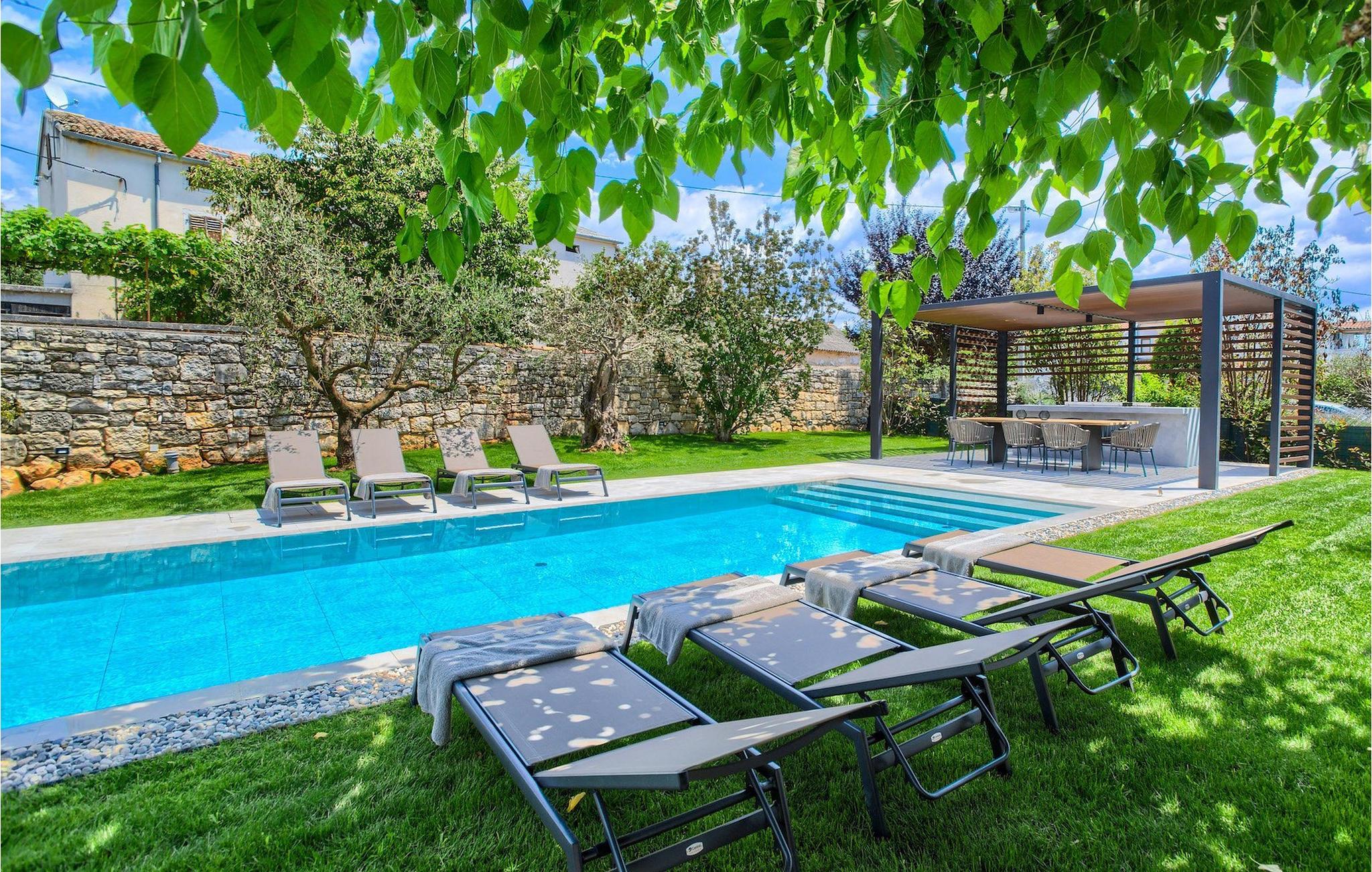 Dieses wunderbare Prachtstück, die Villa Melon, befindet sich in einem kleinen Dorf auf der Halbinsel Istrien, nicht weit von Porec entfernt. Die Villa ist ein luxuriöses, restauriertes Steinhaus und verfügt über einen privaten Pool, einen schönen gepflegten Garten und einen Wellnessbereich mit einer Sauna und einem Whirlpool. Die Villa wurde mit viel Liebe zum Detail und mit hochwertigen Materialien restauriert und eingerichtet. Der geräumige Wohnbereich mit Balkontüren sowie die Küche und der Essbereich befinden sich im Erdgeschoss. Hier werden Sie auch ein geräumiges Schlafzimmer mit en-suite Badezimmer vorfinden. Der Wellnessbereich befindet sich ebenfalls im Erdgeschoss, verfügt jedoch über einen separaten Eingang. Die anderen 4 Schlafzimmer, alle mit einem en-suite Badezimmer, befinden sich auf der ersten Etage.