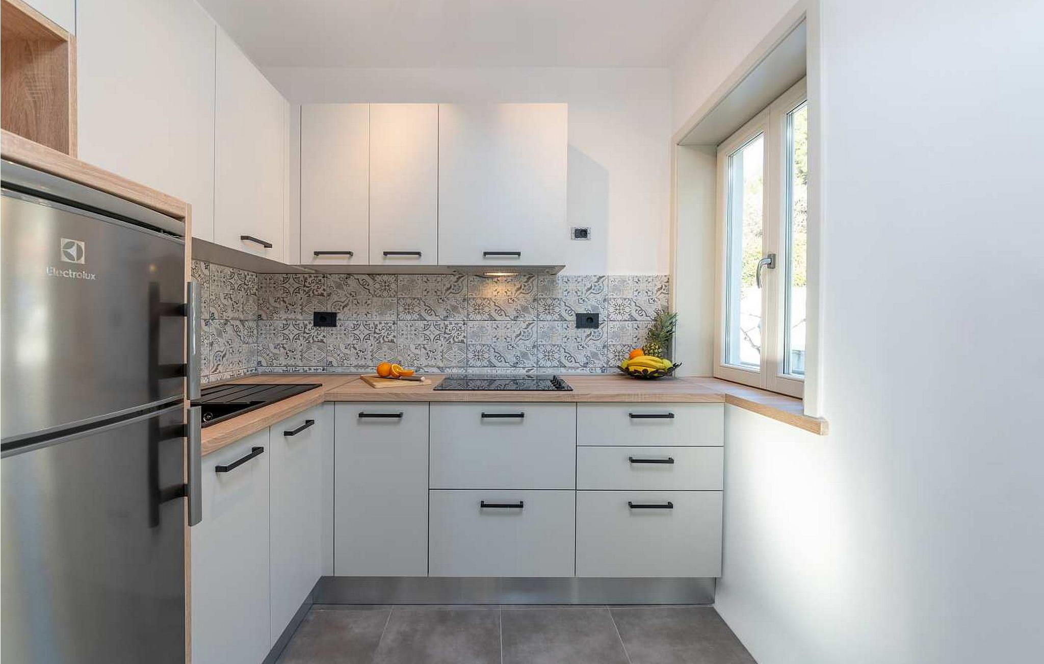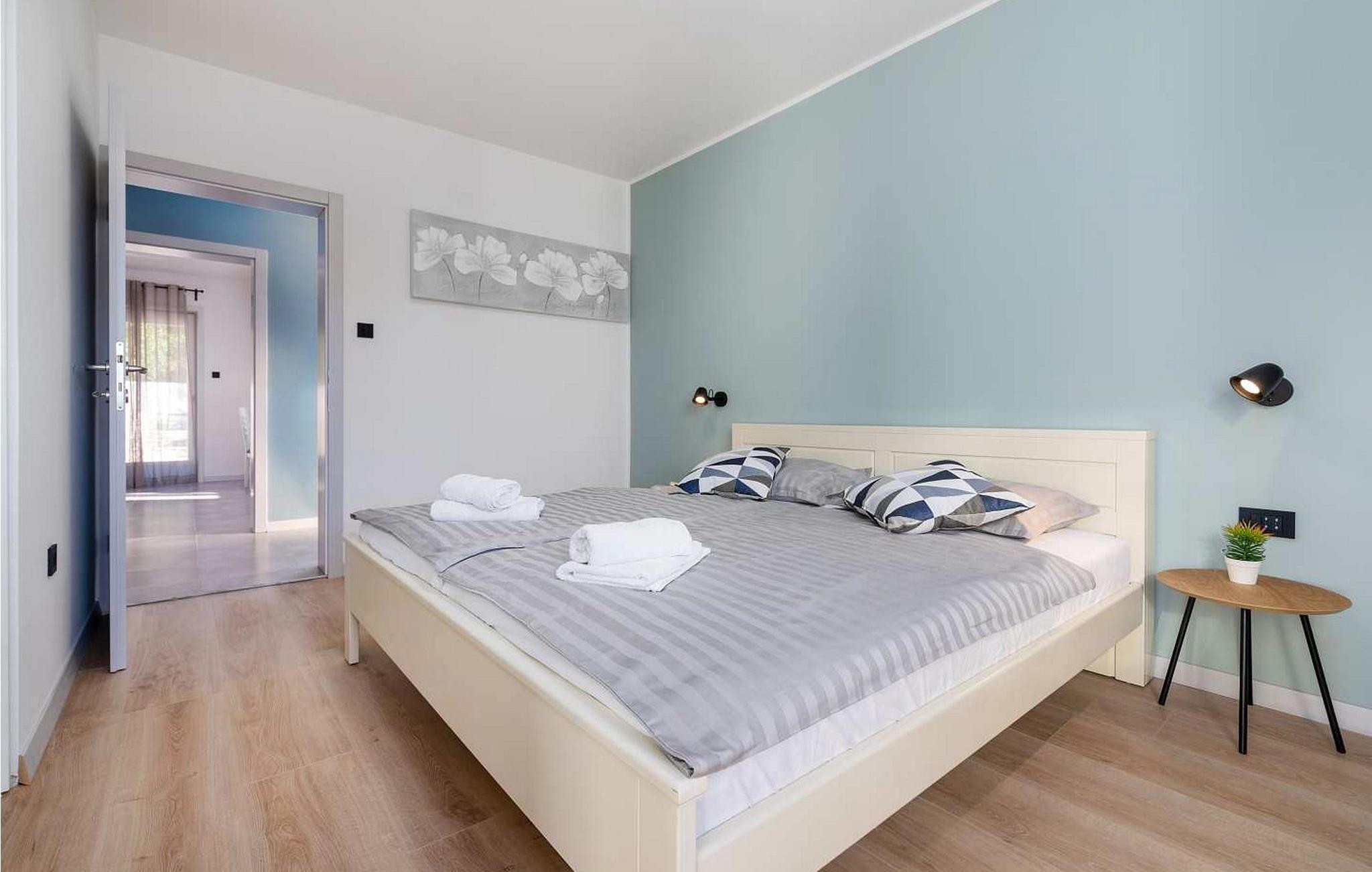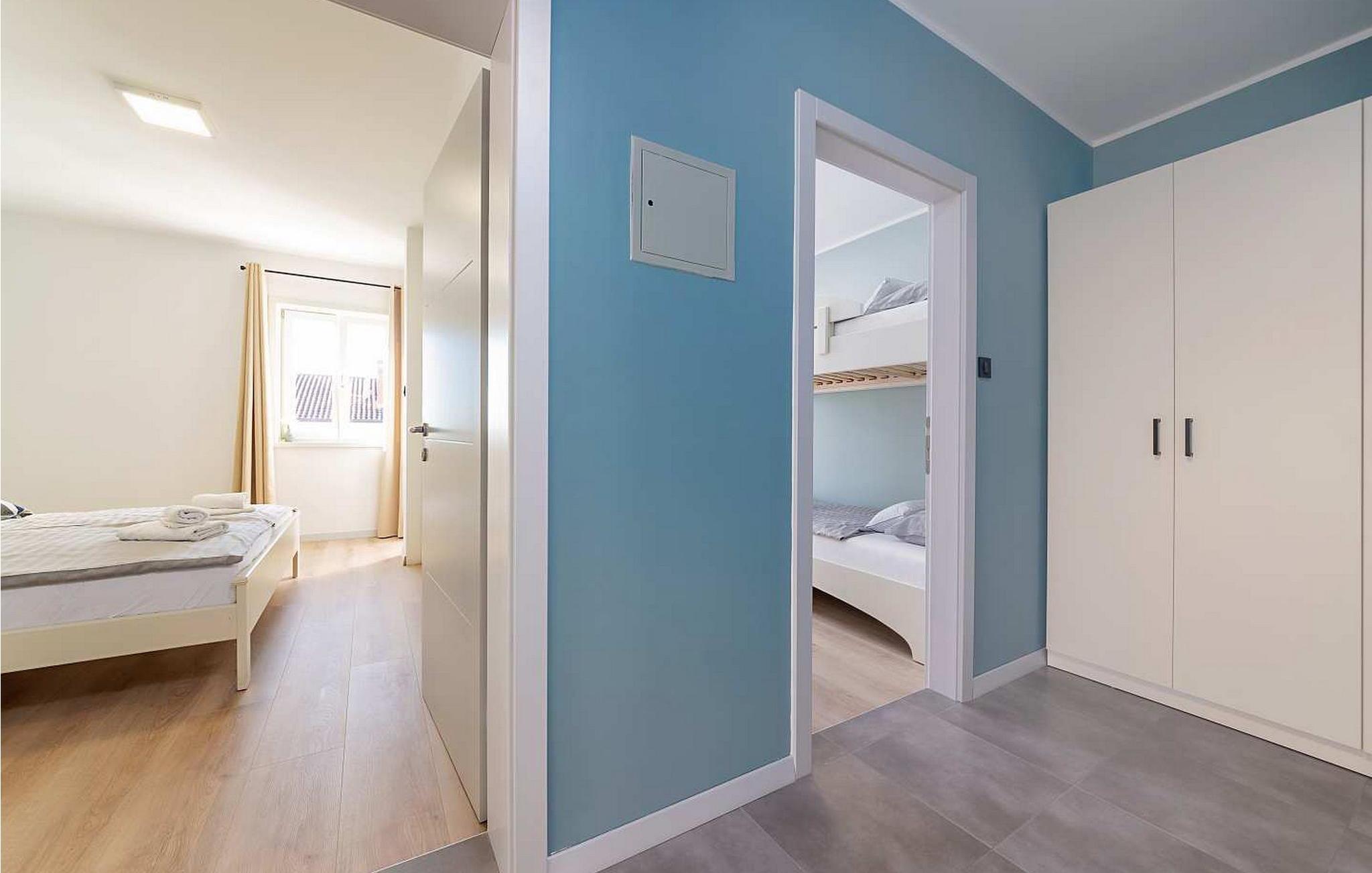 Ferienwohnung Marina 3 liegt auf dem ersten Stock des Hauses (im Niveau des Pools), hat eine Wohnfläche von ca. 50 qm, ist für 4 Personen und besteht aus Wohnraum mit Sitzpolster, ausgestatteter Küche und Esstisch, zwei Doppelzimmer, von denen eine mit Doppelbett und eine mit Etagenbetten, Dusche/WC. Die Ferienwohnung verfügt über eigene Terrasse mit Esstisch für Mahlzeiten im Freien.