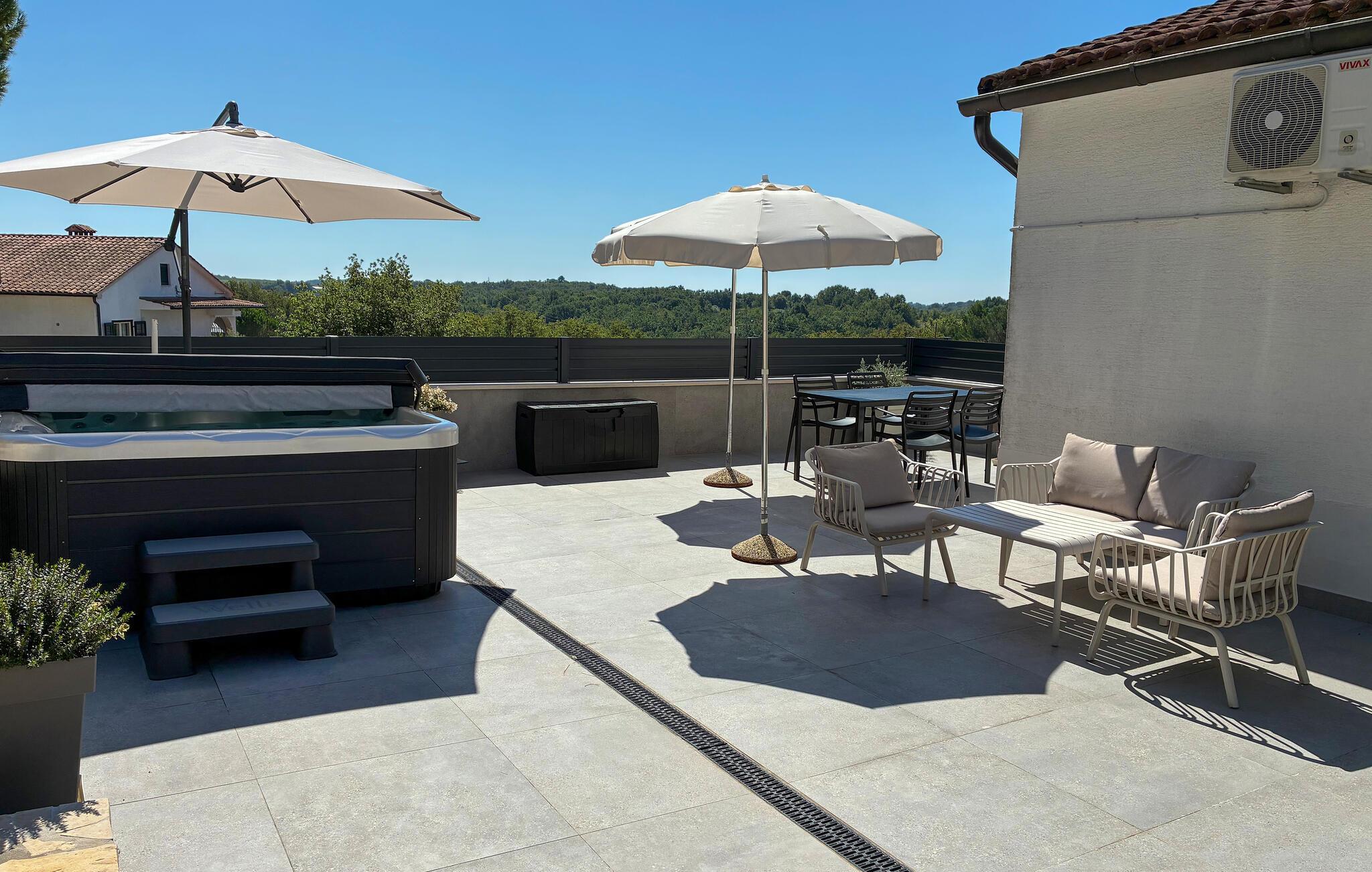Das Haus verfügt über gemeinsamen Pool von 36 qm, großer überdachten Terrasse mit Grill und Esstisch und einem Parkplatz für jede Ferienwohnung.