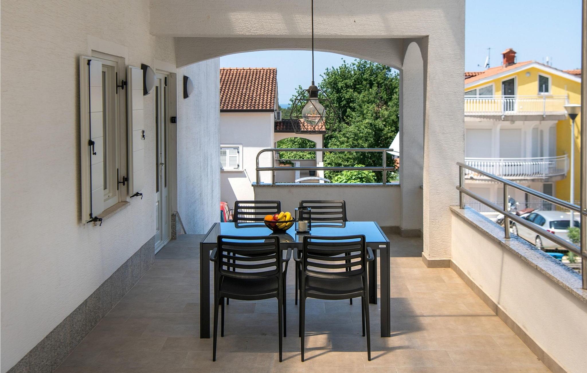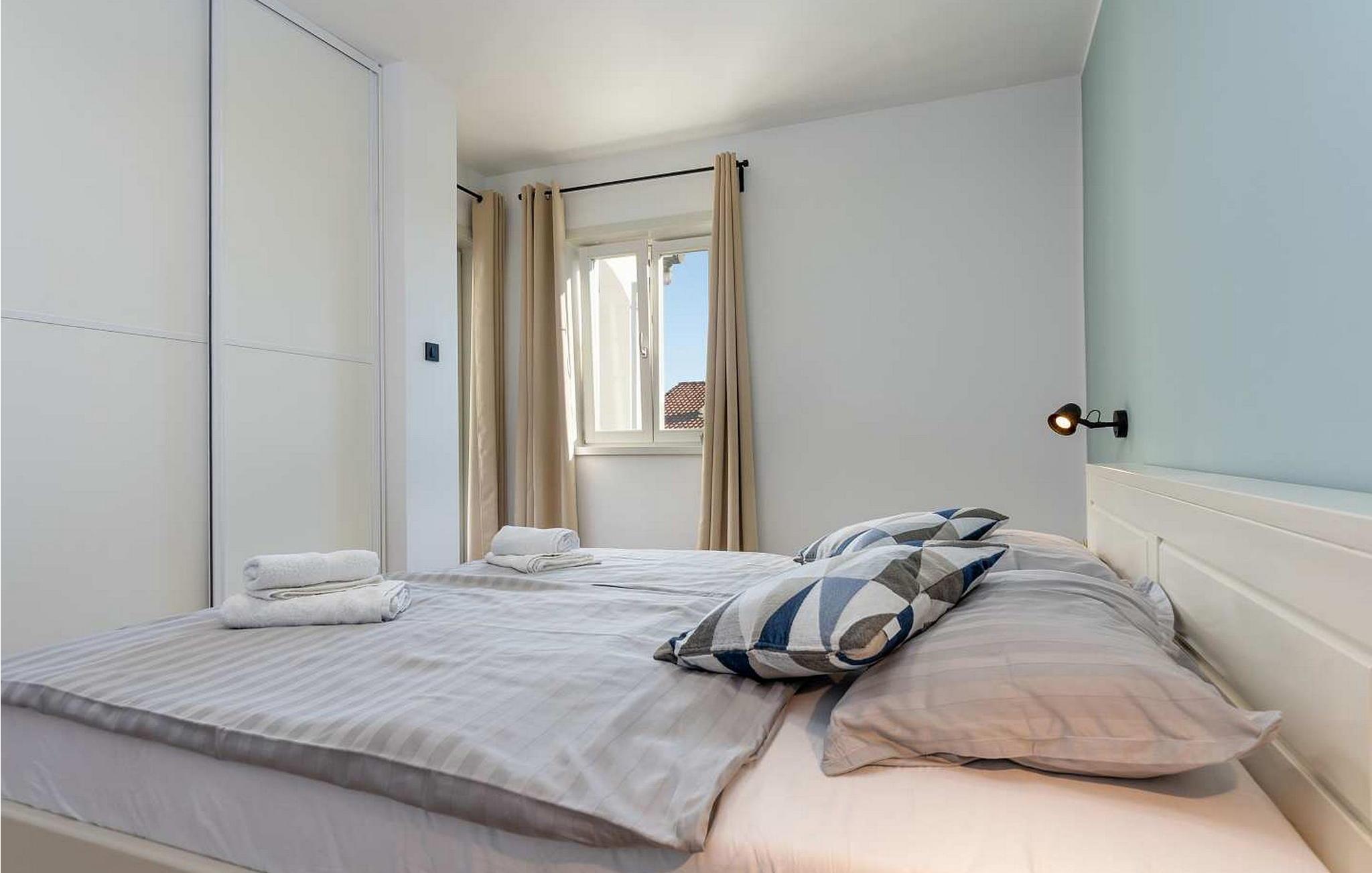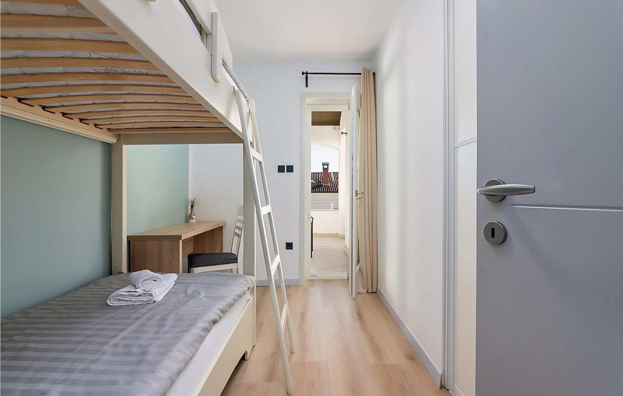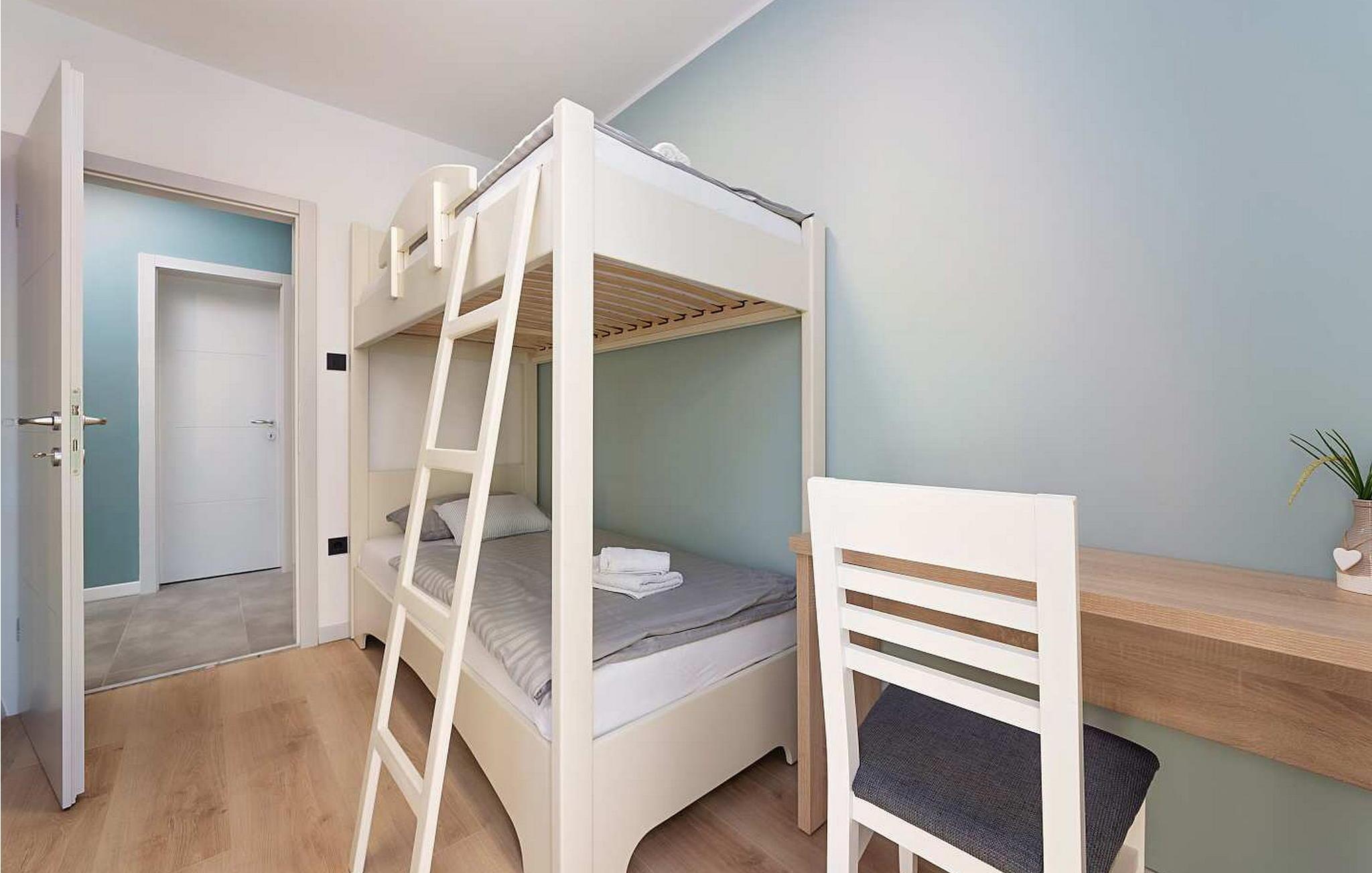 Ferienwohnung Marina 4 liegt auf dem ersten Stock des Hauses (im Niveau des Pools), hat eine Wohnfläche von ca. 50 qm, ist für 4 Personen und besteht aus Wohnraum mit Sitzpolster, ausgestatteter Küche und Esstisch, zwei Doppelzimmer, von denen eine mit Doppelbett und eine mit Etagenbetten, Dusche/WC. Die Ferienwohnung verfügt über große Terrasse mit Esstisch für Mahlzeiten im Freien.