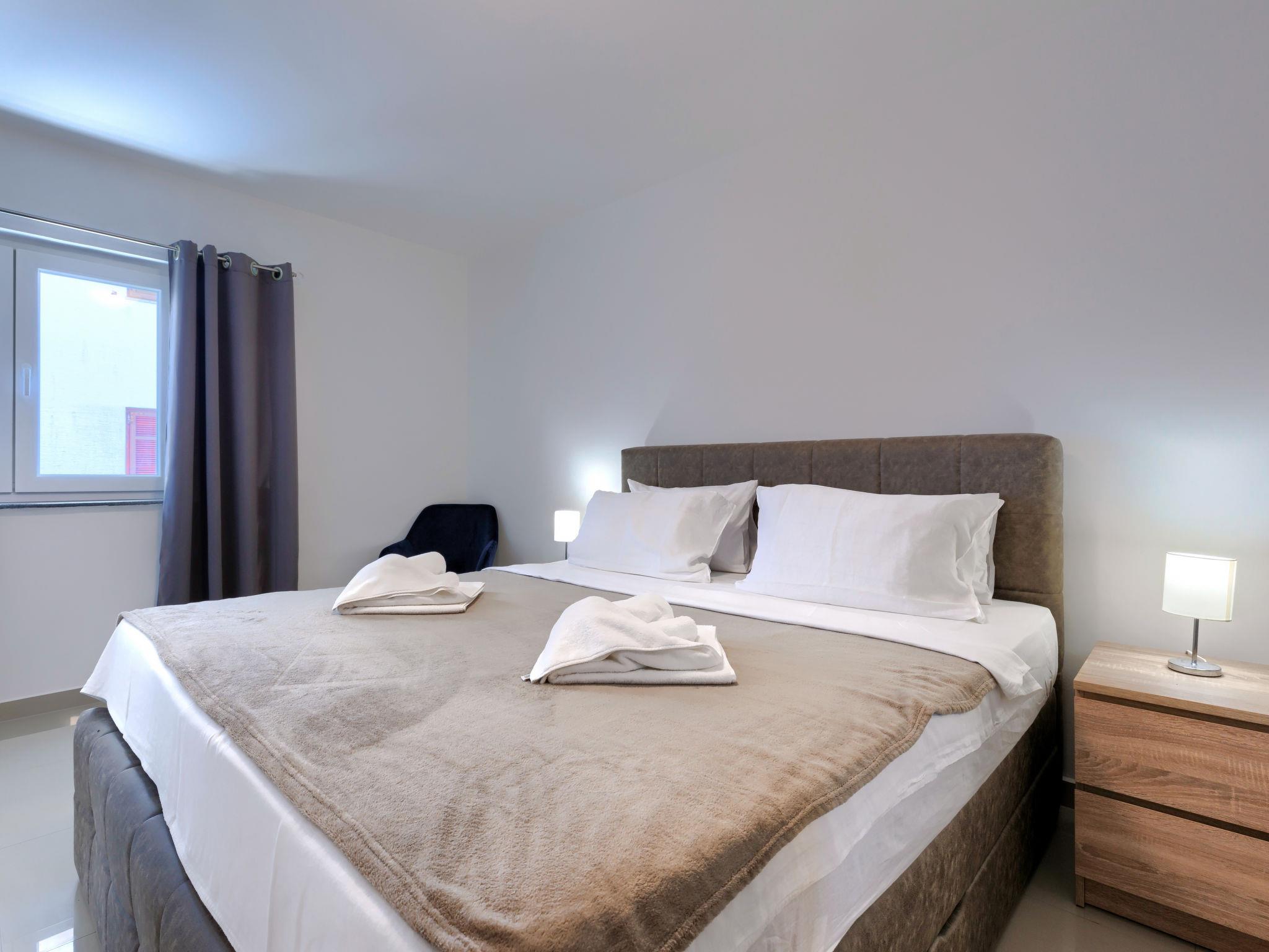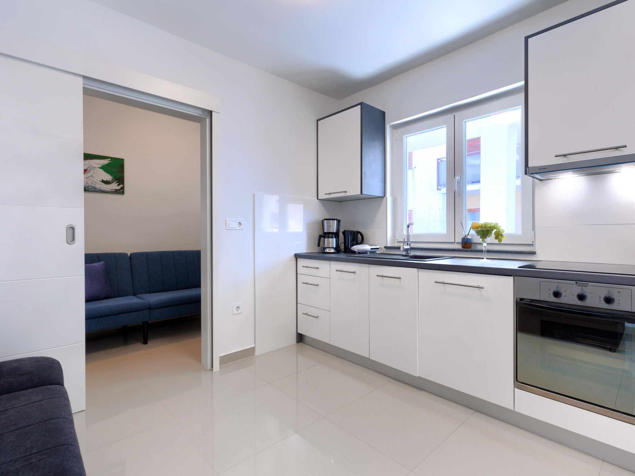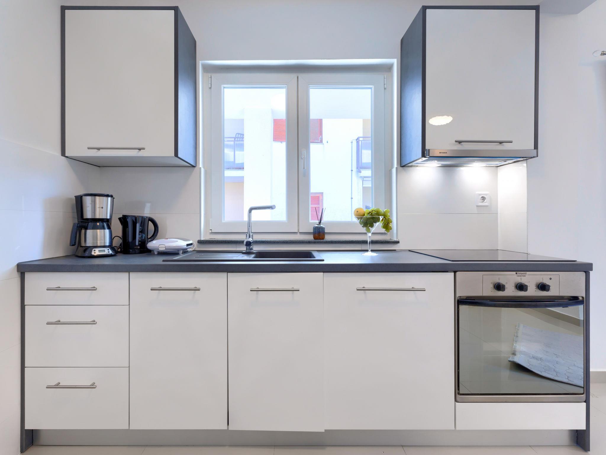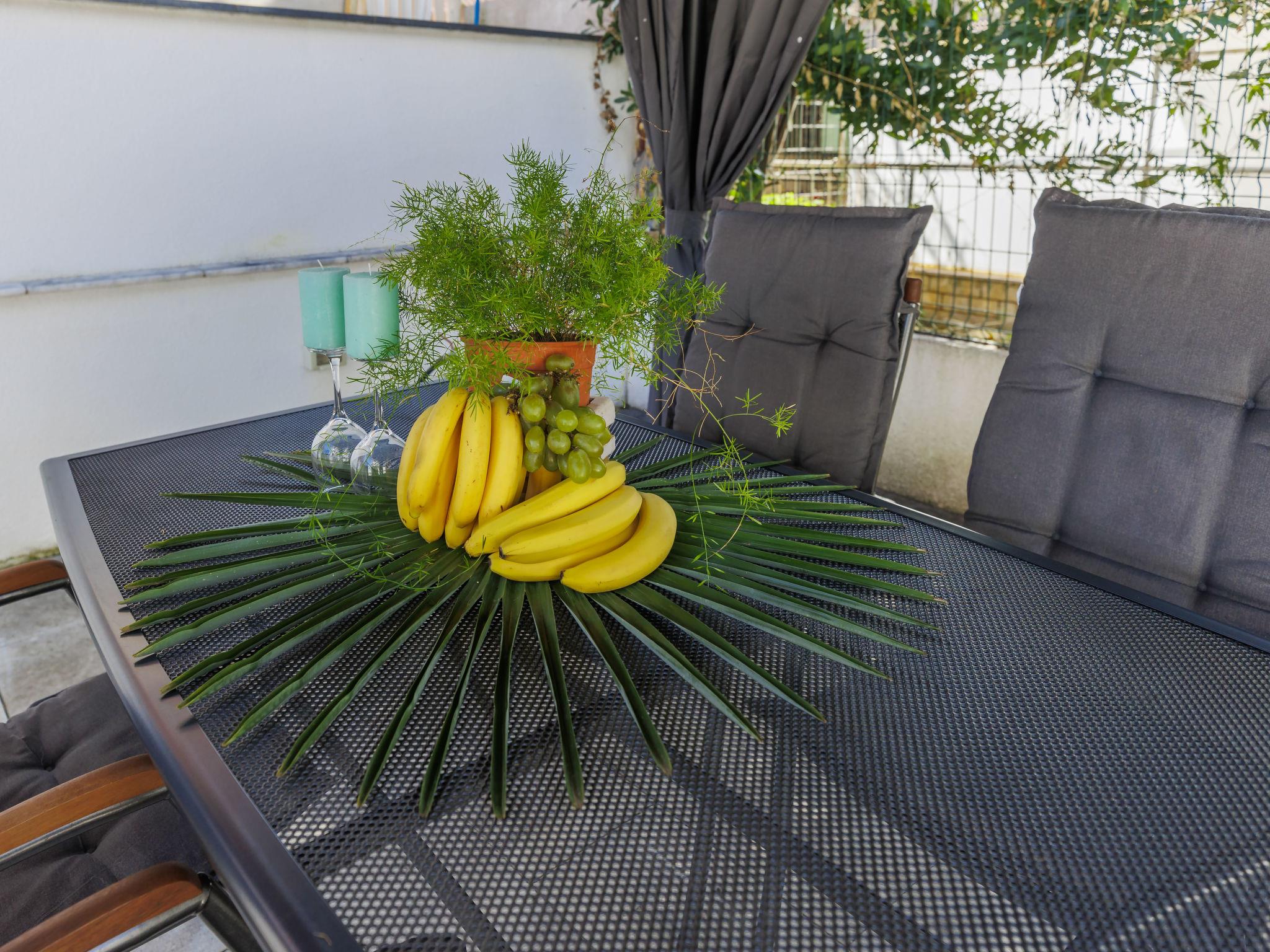 "Amra 5", 3-room apartment 40 m2, on the upper floor. Cosy furnishings: living/dining room with 1 sofabed (120 cm, length 200 cm), satellite TV and air conditioning. Exit to the terrace. 1 room with 1 sofabed (120 cm, length 190 cm). 1 room with 1 french bed (160 cm, length 200 cm). Open kitchen (oven, dishwasher, 4 ceramic glass hob hotplates, toaster, kettle, electric coffee machine). Shower/WC. Forced-air heating. Terrace 12 m2, roofed. Facilities: washing machine, iron, hair dryer. Internet (WiFi, free). Parking (1 car) at the house.