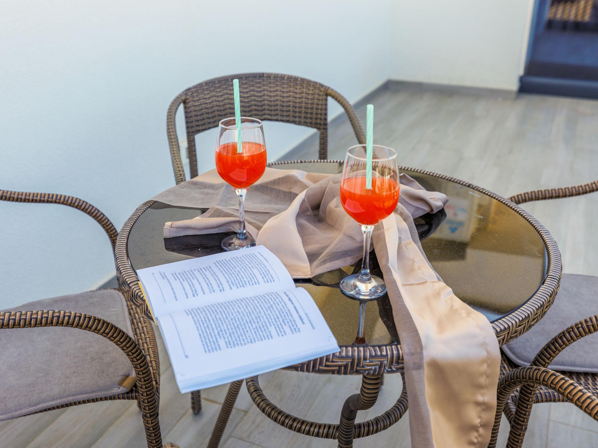 "Amra 6", 3-room apartment 40 m2, on the top floor. Cosy furnishings: living/dining room with 1 sofabed (120 cm, length 200 cm), satellite TV and air conditioning. Exit to the terrace. 1 room with 1 sofabed (120 cm, length 190 cm). 1 room with 1 french bed (160 cm, length 200 cm), air conditioning. Exit to the terrace. Open kitchen (oven, dishwasher, 4 ceramic glass hob hotplates, toaster, kettle, electric coffee machine). Shower/WC. Forced-air heating. Terrace 12 m2, terrace 5 m2. Facilities: washing machine, iron, hair dryer. Internet (WiFi, free). Parking (1 car) at the house.
