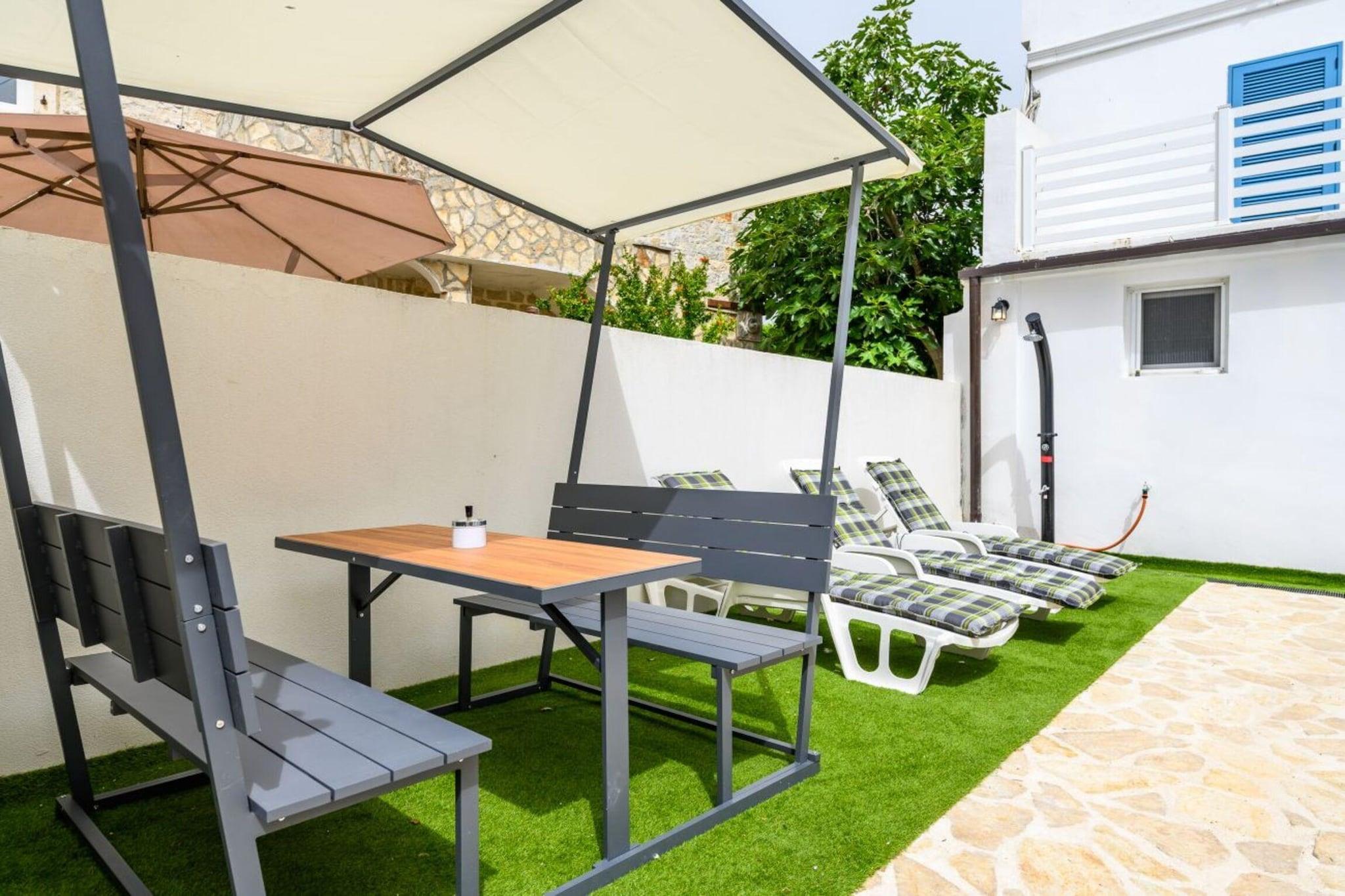 Living room(single sofa bed, TV, seating area), open kitchen(toaster, coffee machine, oven, dishwasher, fridge, freezer, electric hot plates, dishes and cutlery), bedroom(double bed, double bed), bedroom(double bed), bedroom(double bed), bathroom(shower, washbasin, toilet), bathroom(shower, washbasin, toilet), Internet access, Garden Furniture , washing machine, balcony, air conditioning, garden, parking, swimming pool(private), iron, hairdryer