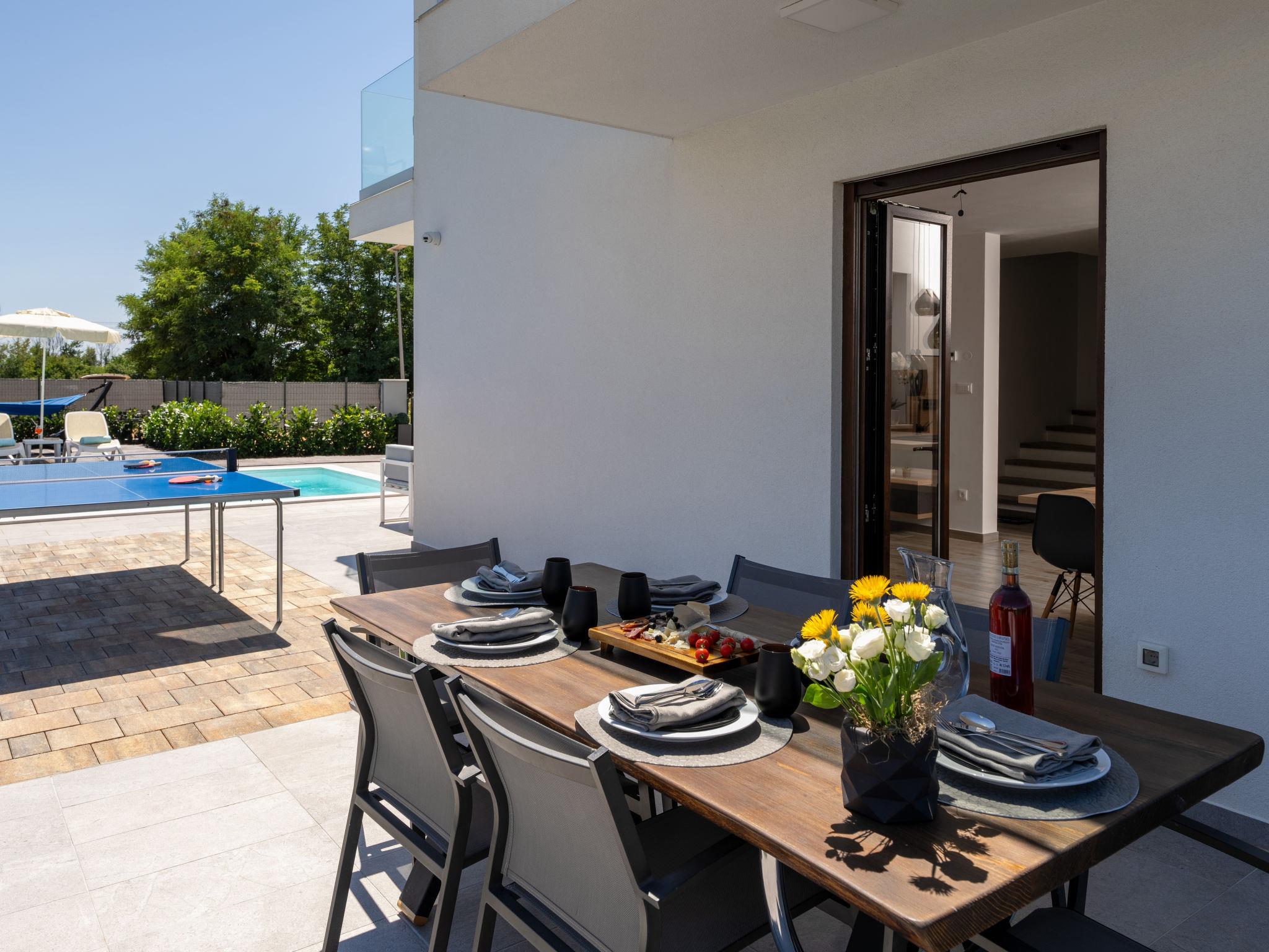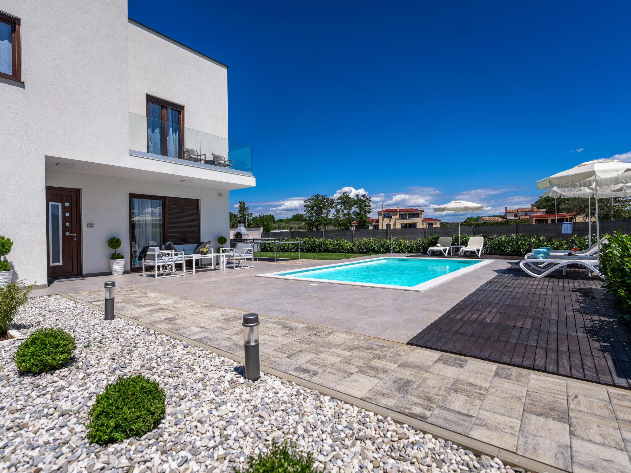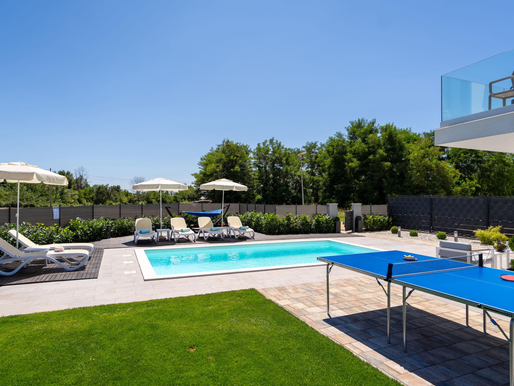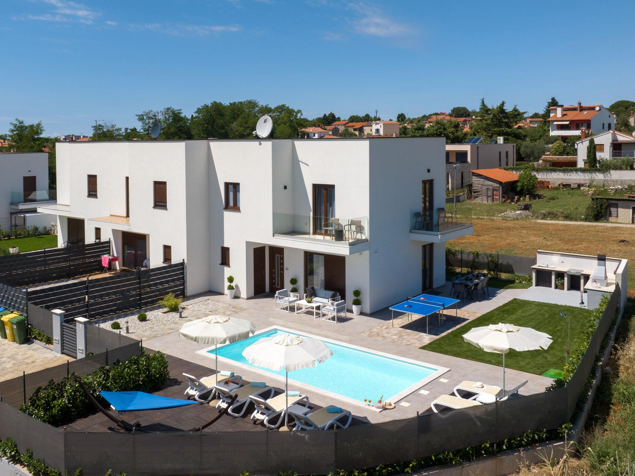 Beautiful terraced house "Aria Blue", 2 storeys. In the hamlet Krancici 500 m from the centre of Kaštelir, 15 km from the centre of Porec, in a sunny position, 10 km from the sea. Private: property 275 m2 (fenced), swimming pool angular (7 x 4 m, depth 145 cm, seasonal availability: 01.Mar. - 10.Dec.) with internal staircase. Outdoor shower, table tennis, terrace (10 m2), garden furniture, barbecue. In the house: internet access, washing machine. Parking (for 2 cars) at the house. Shop 500 m, restaurant 2 km, bus stop 6.1 km, pebble beach 10 km, rocky beach 10 km. Walking paths from the house 100 m, cycle lane 150 m. Please note: suitable for families. The owner does not accept any youth groups.