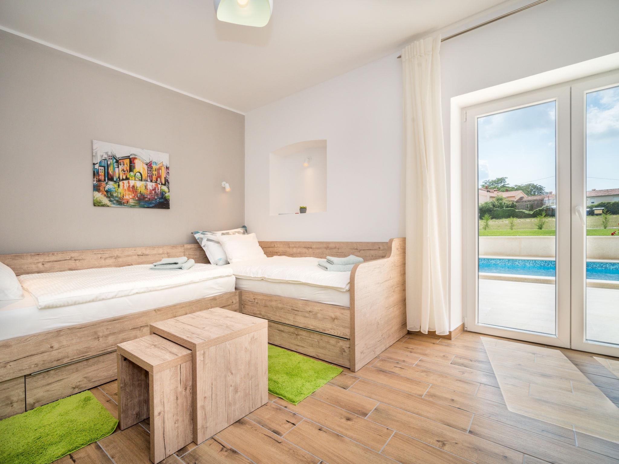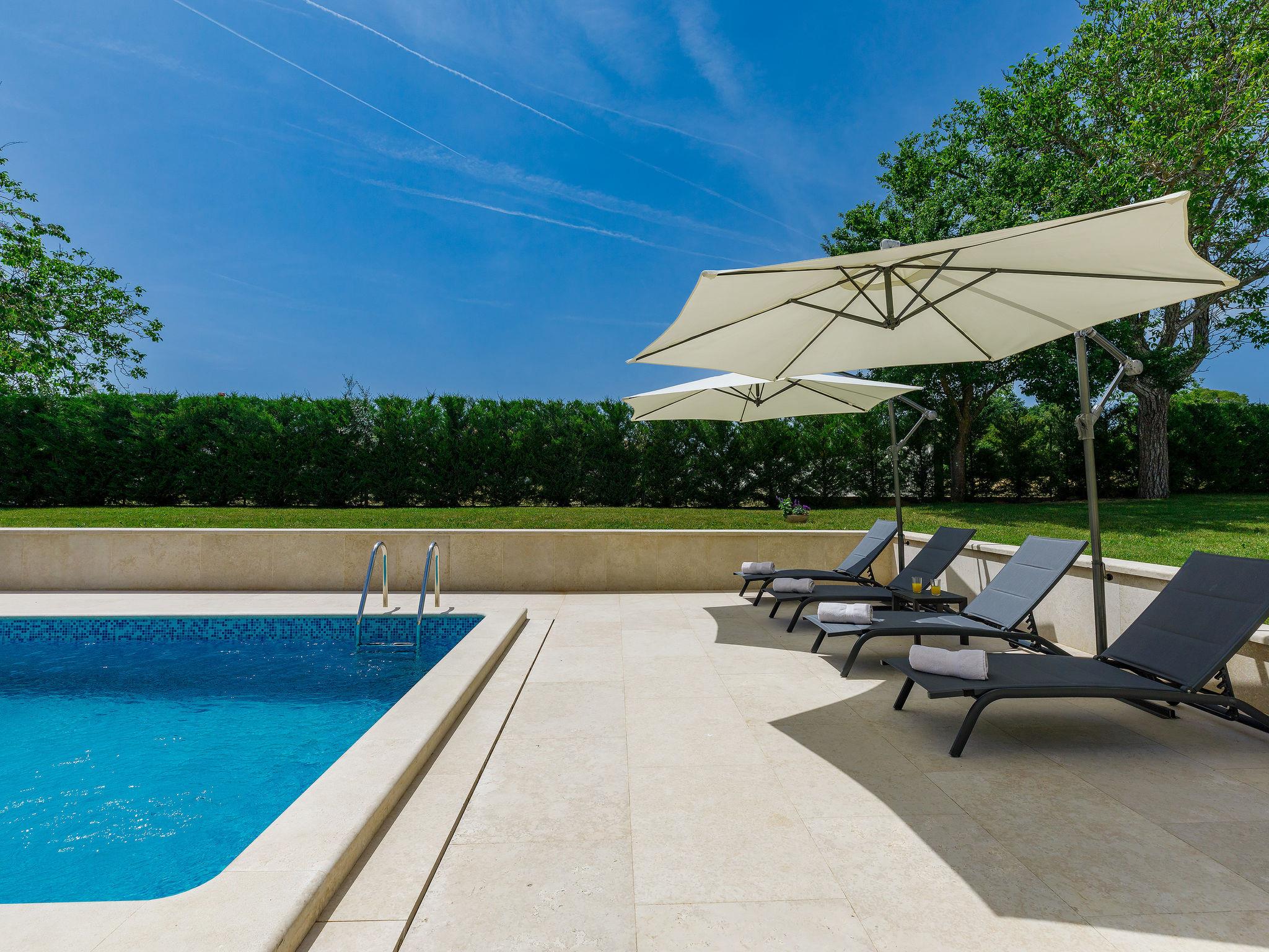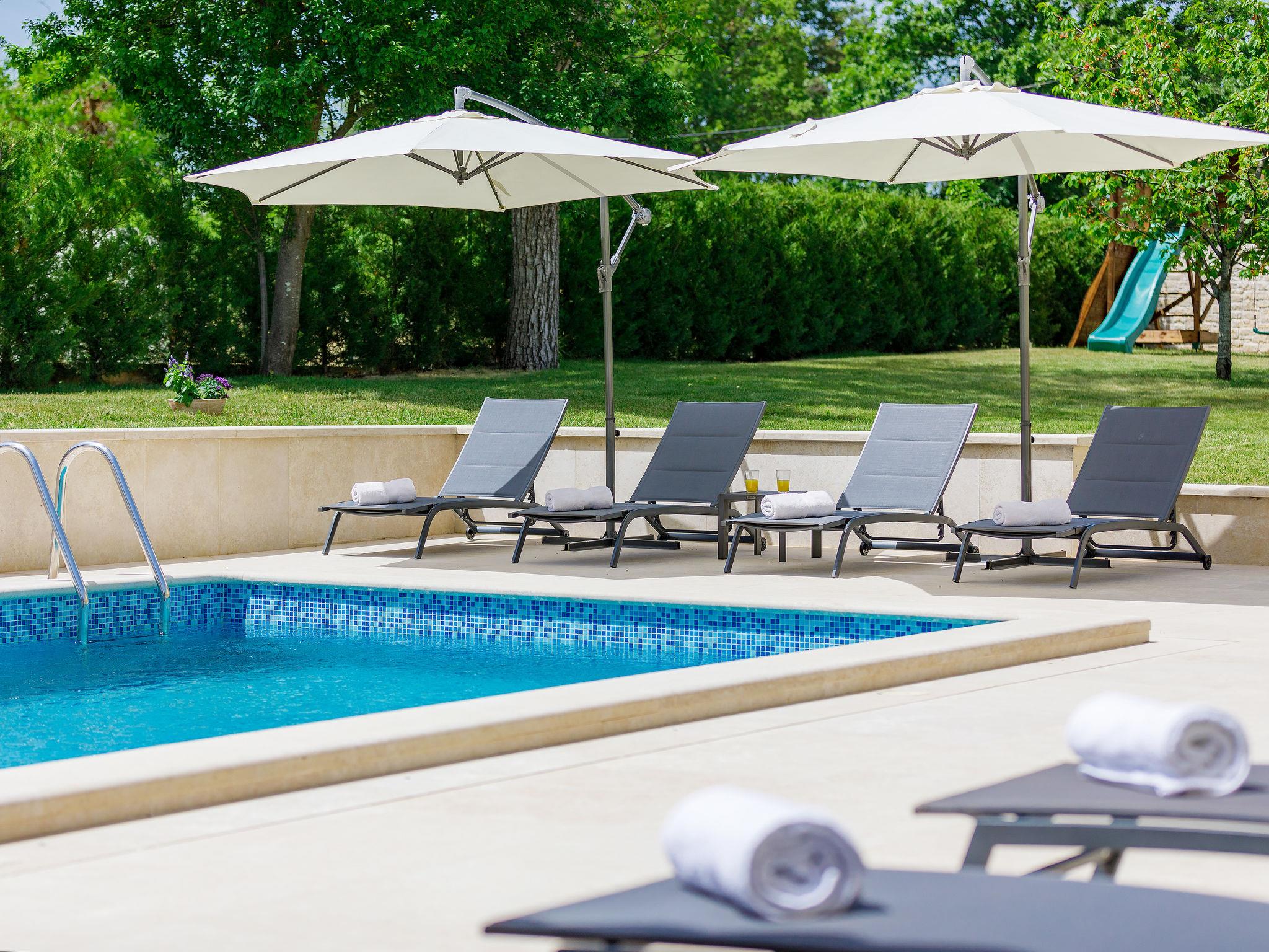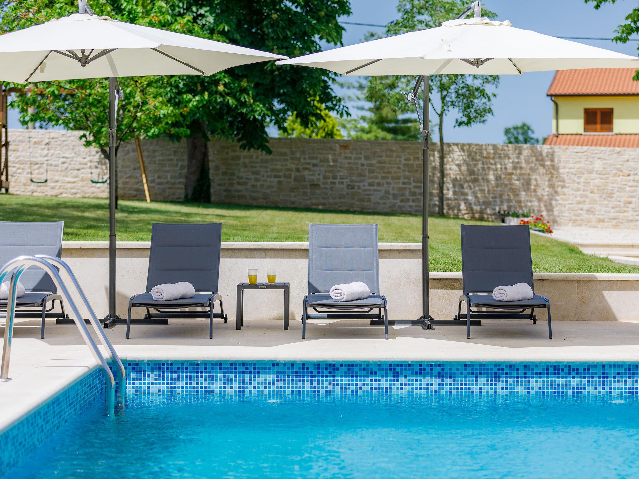 Kringa 20 km from Porec: Beautiful single-family house "Villa Coriticum otium", 2 storeys, renovated in 2018. 400 m from the centre of Kringa, in a quiet, sunny position, 15 km from the sea. Private: property 900 m2 (fenced), garden with lawn, swimming pool angular (8 x 4 m, depth 140 cm, seasonal availability: 01.Apr. - 01.Oct.). Outdoor shower, terrace (32 m2), garden furniture, barbecue. In the house: internet access, washing machine, tumble dryer. Parking (for 3 cars) at the house on the premises. Shop 200 m, supermarket 20 km, restaurant 500 m, bus stop 5.6 km, pebble beach 20 km, public bathing area 20 km. Walking paths from the house 200 m, cycle lane 250 m. Nearby attractions: aquapark 22 km, adrenalin park 3 km. Youth groups are not allowed.