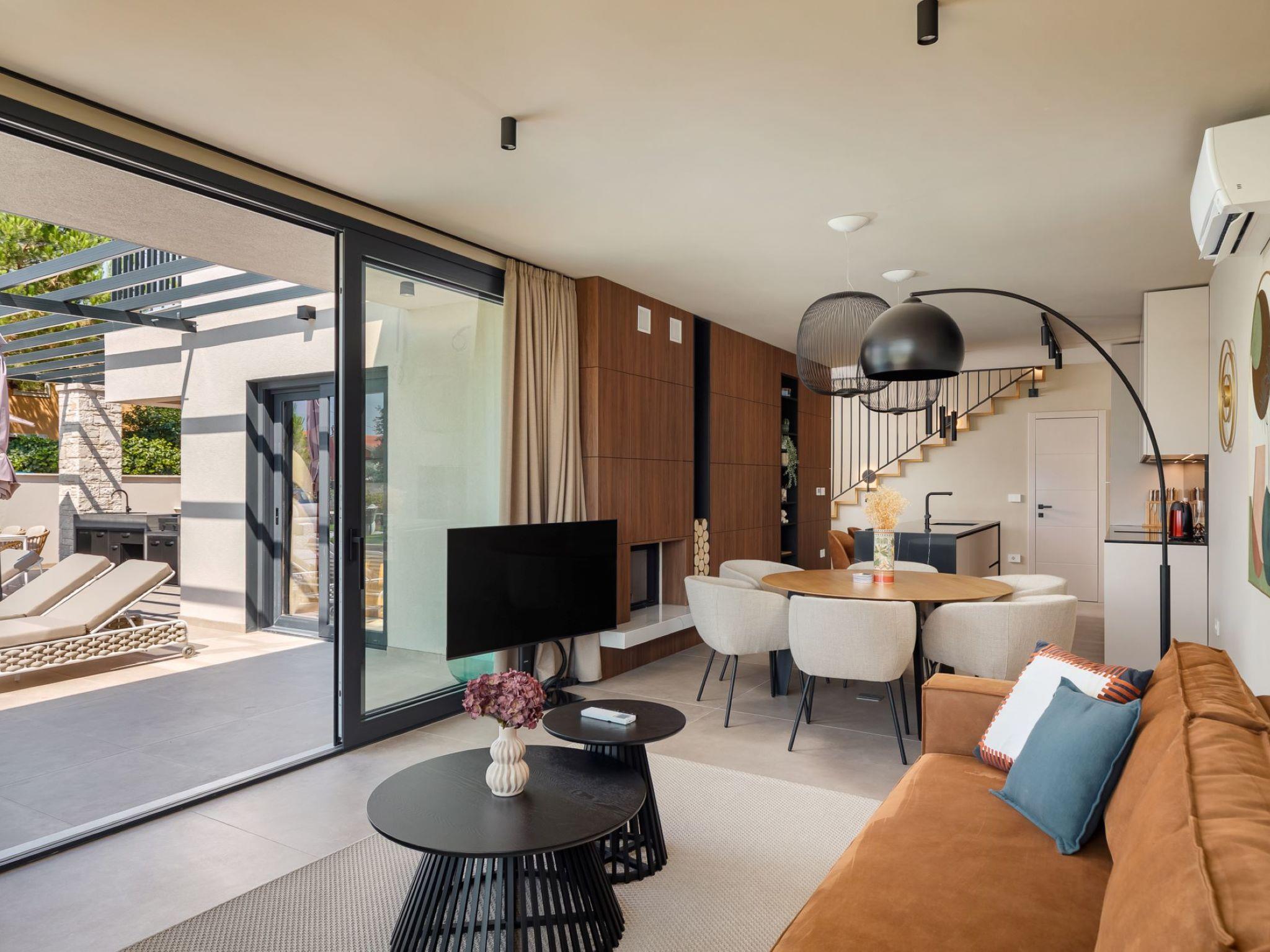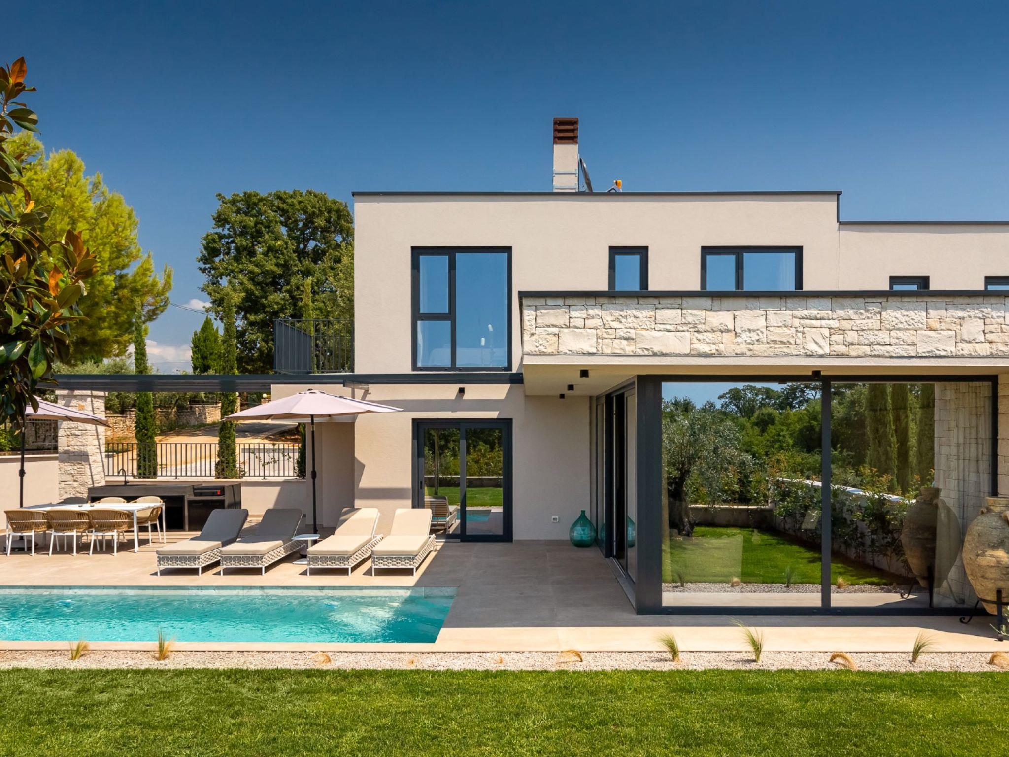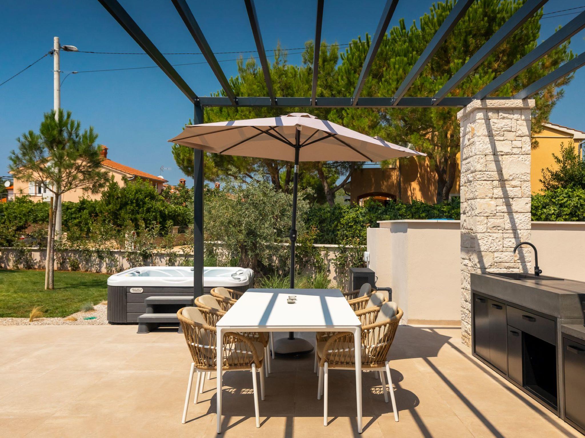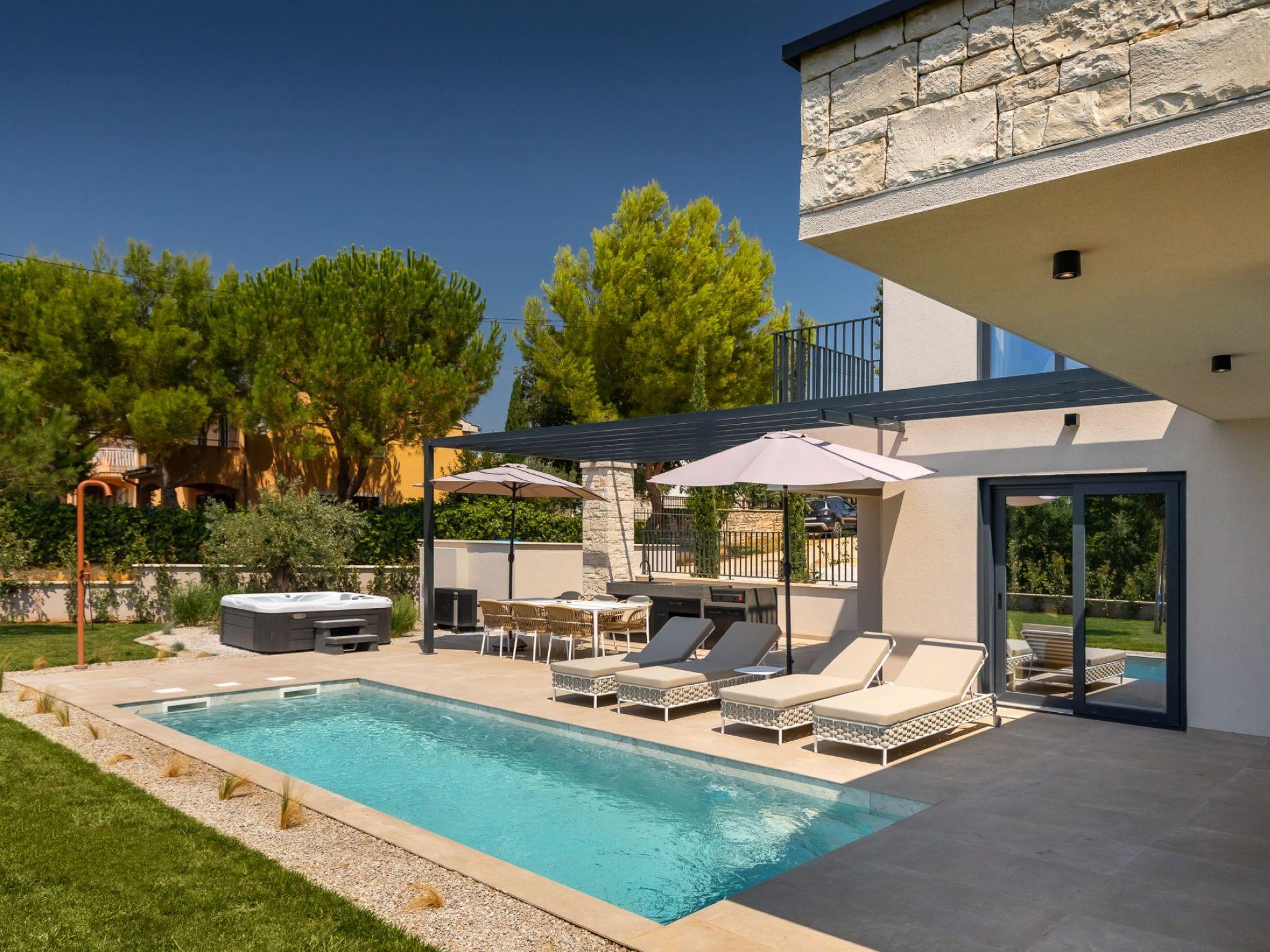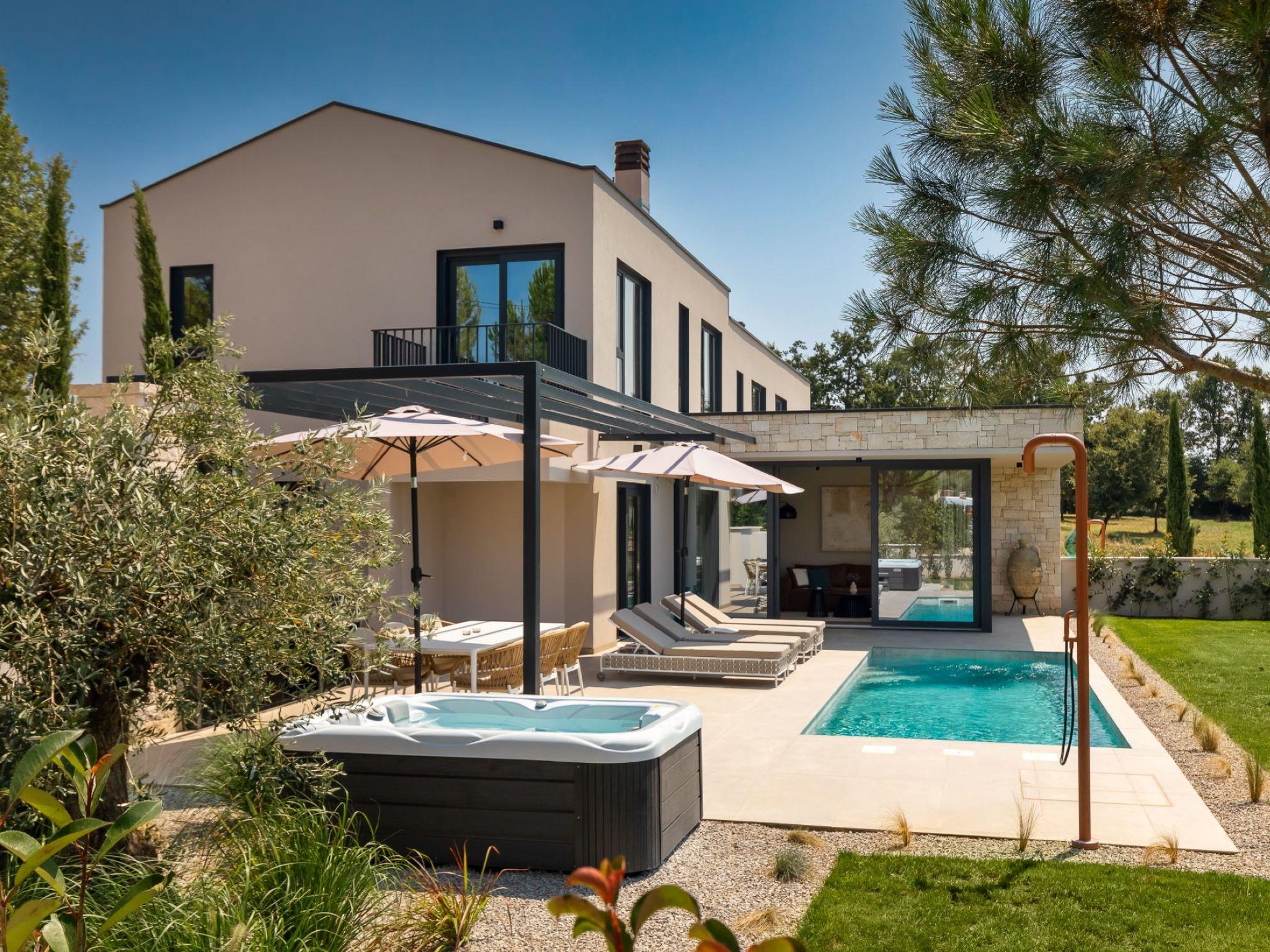 Very beautiful, cosy semi-detached house "Tia 1", 2 storeys, built in 2024. In the hamlet Mihatovici 1 km from the centre of Nova Vas, 5 km from the centre of Porec, 4.5 km from the sea, 4.5 km from the beach. Private: property 495 m2 (fenced), garden with lawn, swimming pool angular, heated (7 x 3 m, 21 m2, depth 140 cm, seasonal availability: 01.Apr. - 01.Nov.) with internal staircase and salt-electrolysis pool-cleaning system. Outdoor shower, table tennis, terrace (20 m2), garden furniture, barbecue. In the house: internet access, sauna, hot tub, washing machine. Parking (for 2 cars) at the house on the premises. E-charging station. Shop 1.5 km, shopping centre 3 km, restaurant 70 m, café 1.5 km, bus stop 2.8 km, pebble beach 4.5 km, rocky beach 4.5 km. Nearby attractions: Aquapark 9 km. Groups of teenagers on request only. Please note: airfield 46 km from the property. Swimming pool heated (extra). It is necessary to announce 7 days in advance if the pool heating is required.
