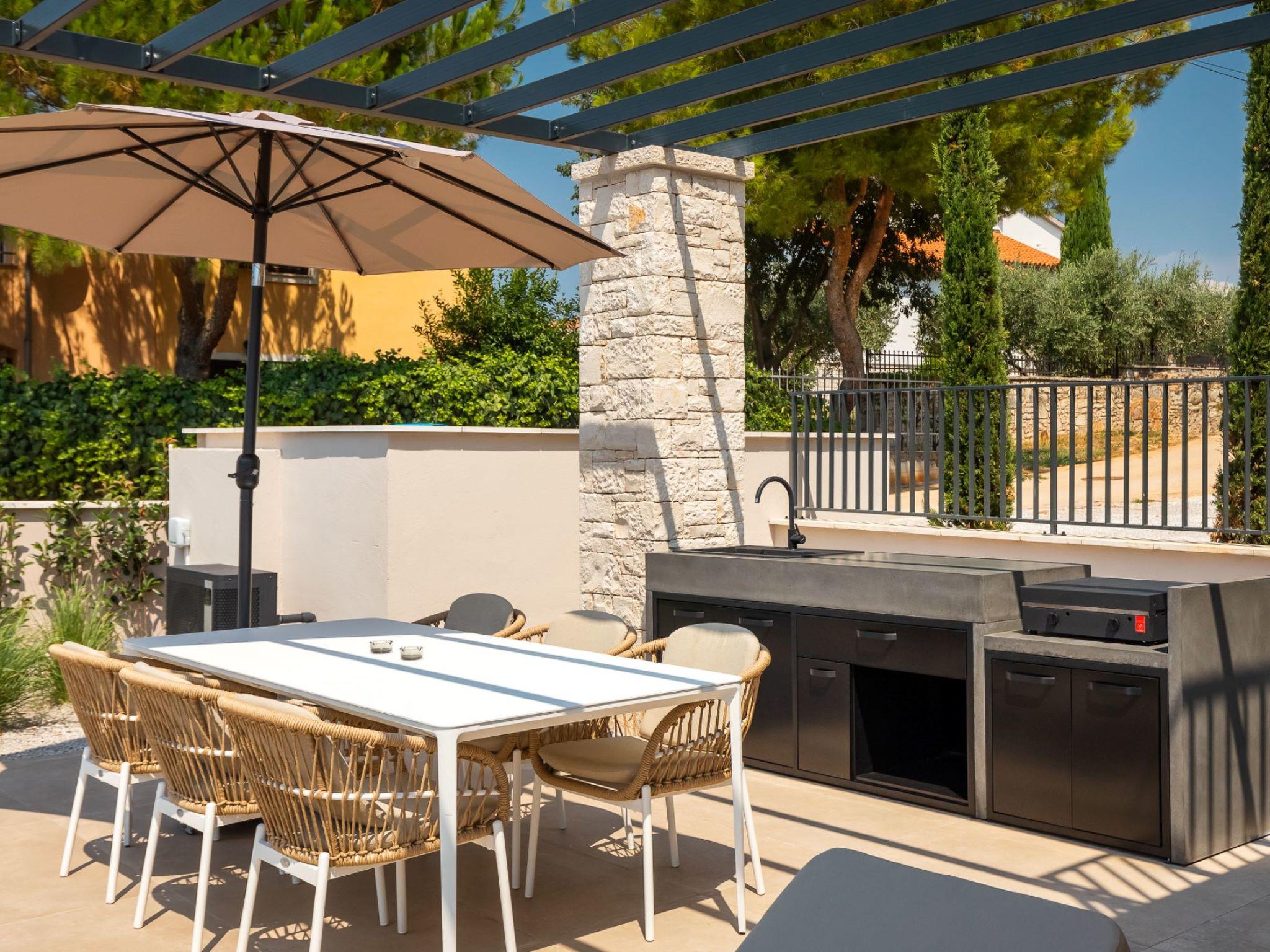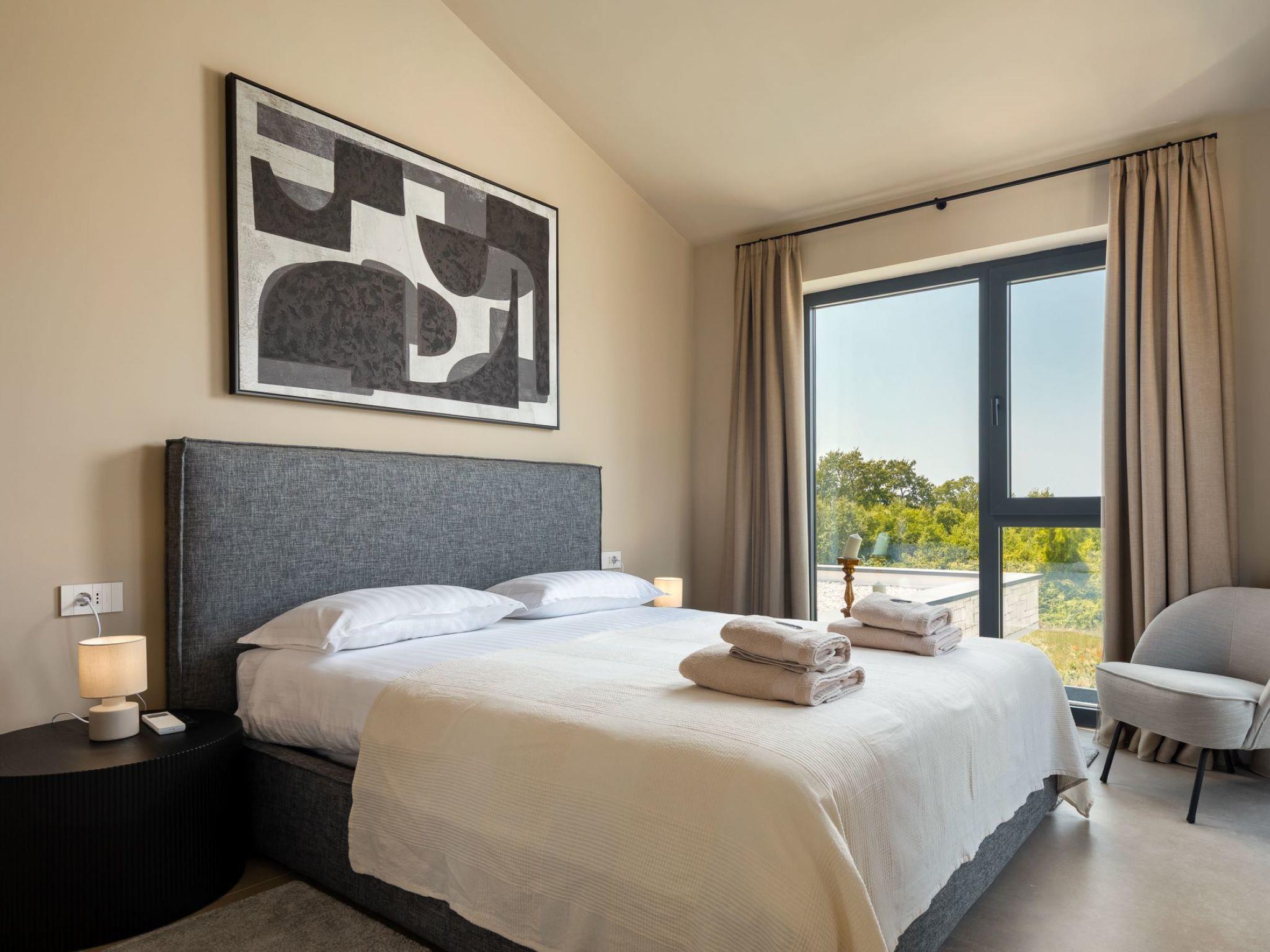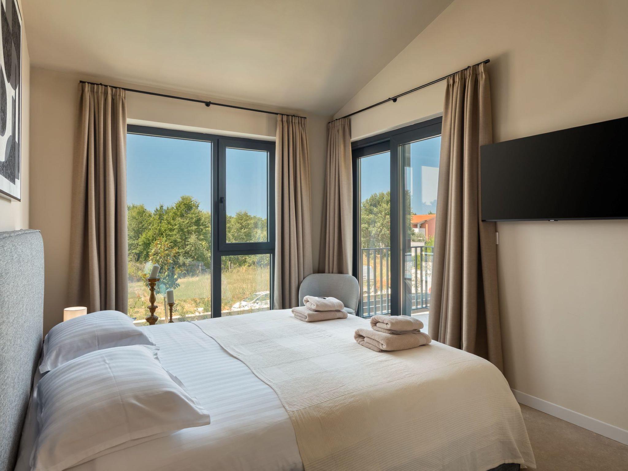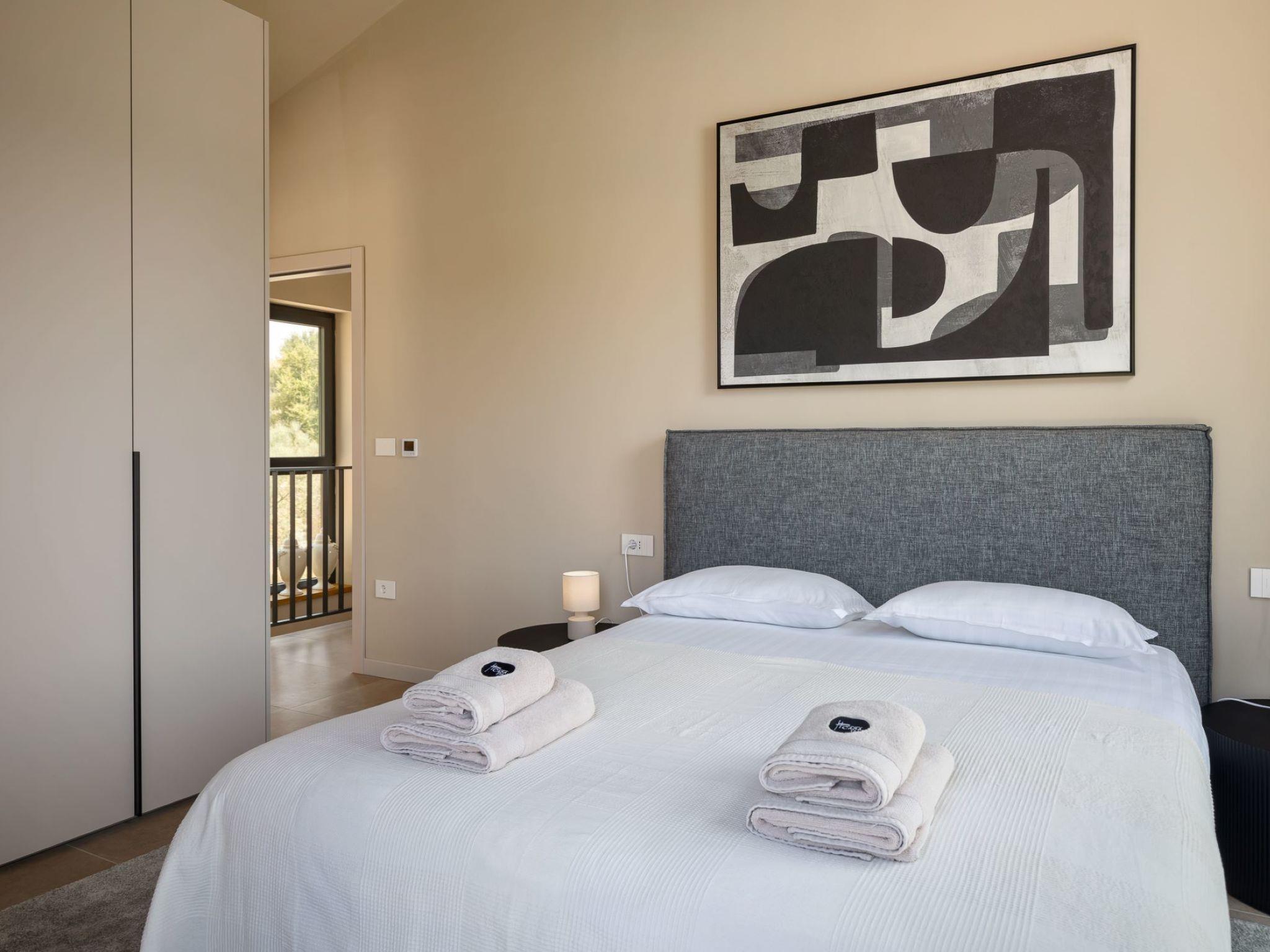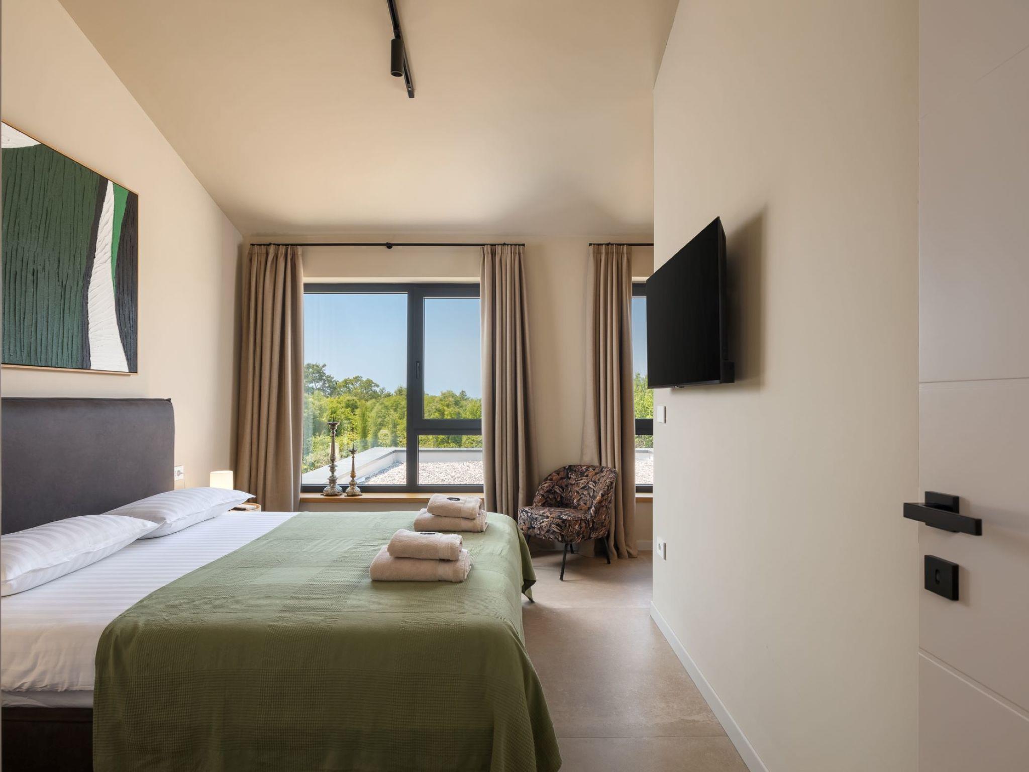Very beautiful, cosy semi-detached house "Tia 1", 2 storeys, built in 2024. In the hamlet Mihatovici 1 km from the centre of Nova Vas, 5 km from the centre of Porec, 4.5 km from the sea, 4.5 km from the beach. Private: property 495 m2 (fenced), garden with lawn, swimming pool angular, heated (7 x 3 m, 21 m2, depth 140 cm, seasonal availability: 01.Apr. - 01.Nov.) with internal staircase and salt-electrolysis pool-cleaning system. Outdoor shower, table tennis, terrace (20 m2), garden furniture, barbecue. In the house: internet access, sauna, hot tub, washing machine. Parking (for 2 cars) at the house on the premises. E-charging station. Shop 1.5 km, shopping centre 3 km, restaurant 70 m, café 1.5 km, bus stop 2.8 km, pebble beach 4.5 km, rocky beach 4.5 km. Nearby attractions: Aquapark 9 km. Groups of teenagers on request only. Please note: airfield 46 km from the property. Swimming pool heated (extra). It is necessary to announce 7 days in advance if the pool heating is required.