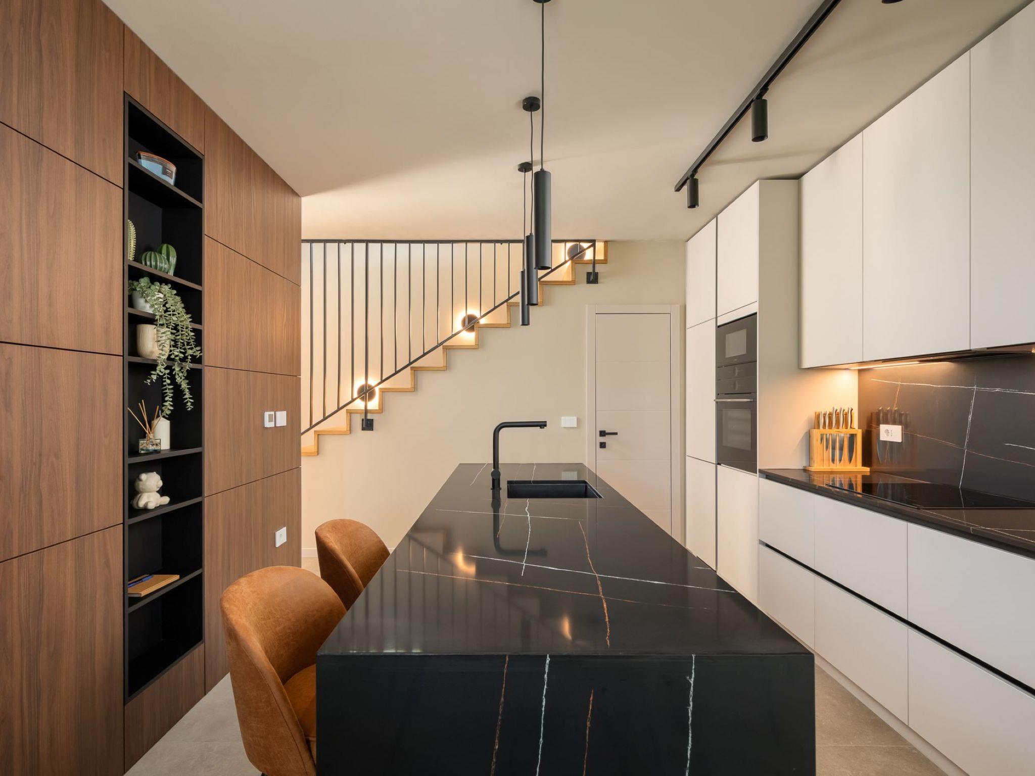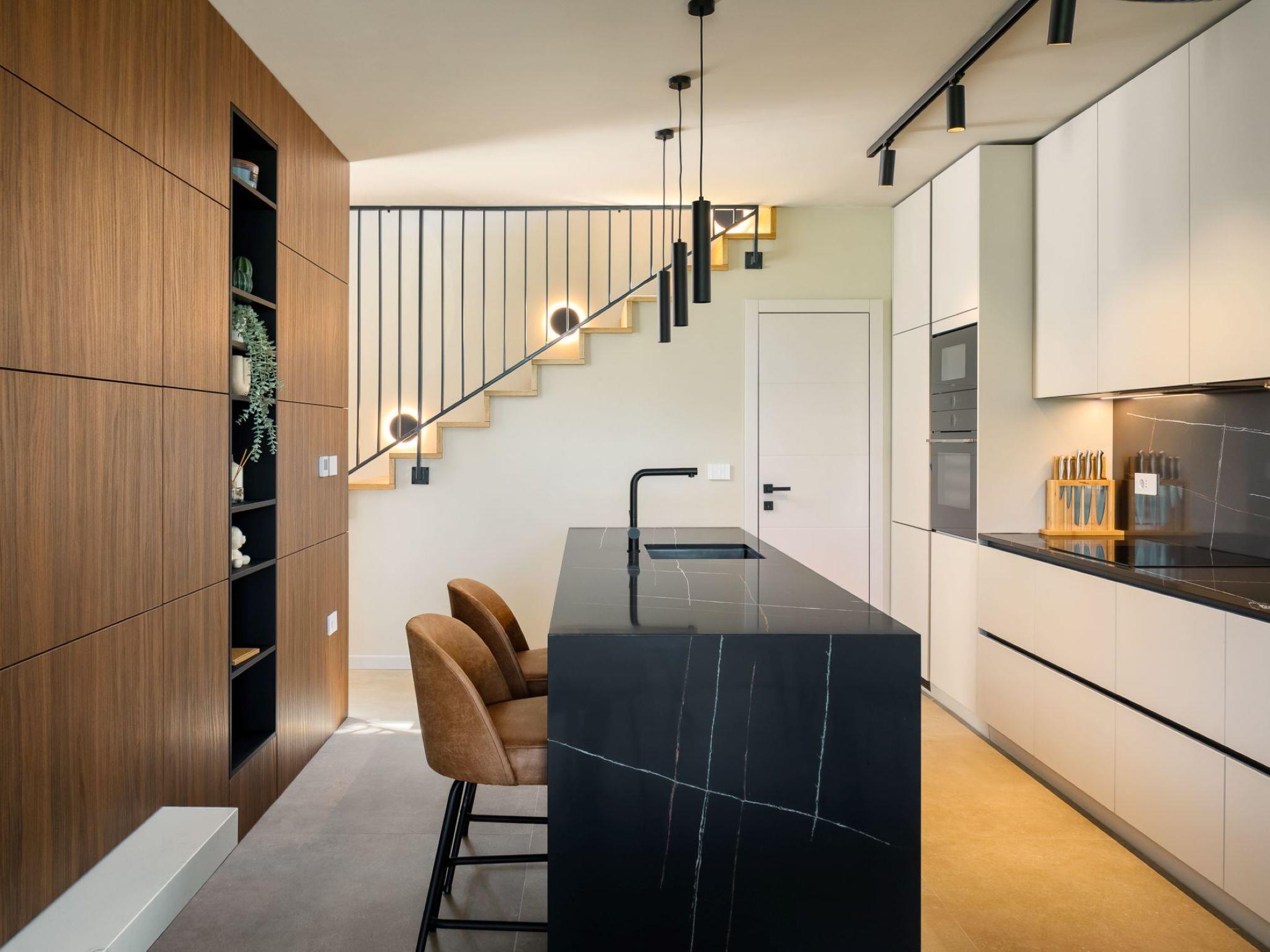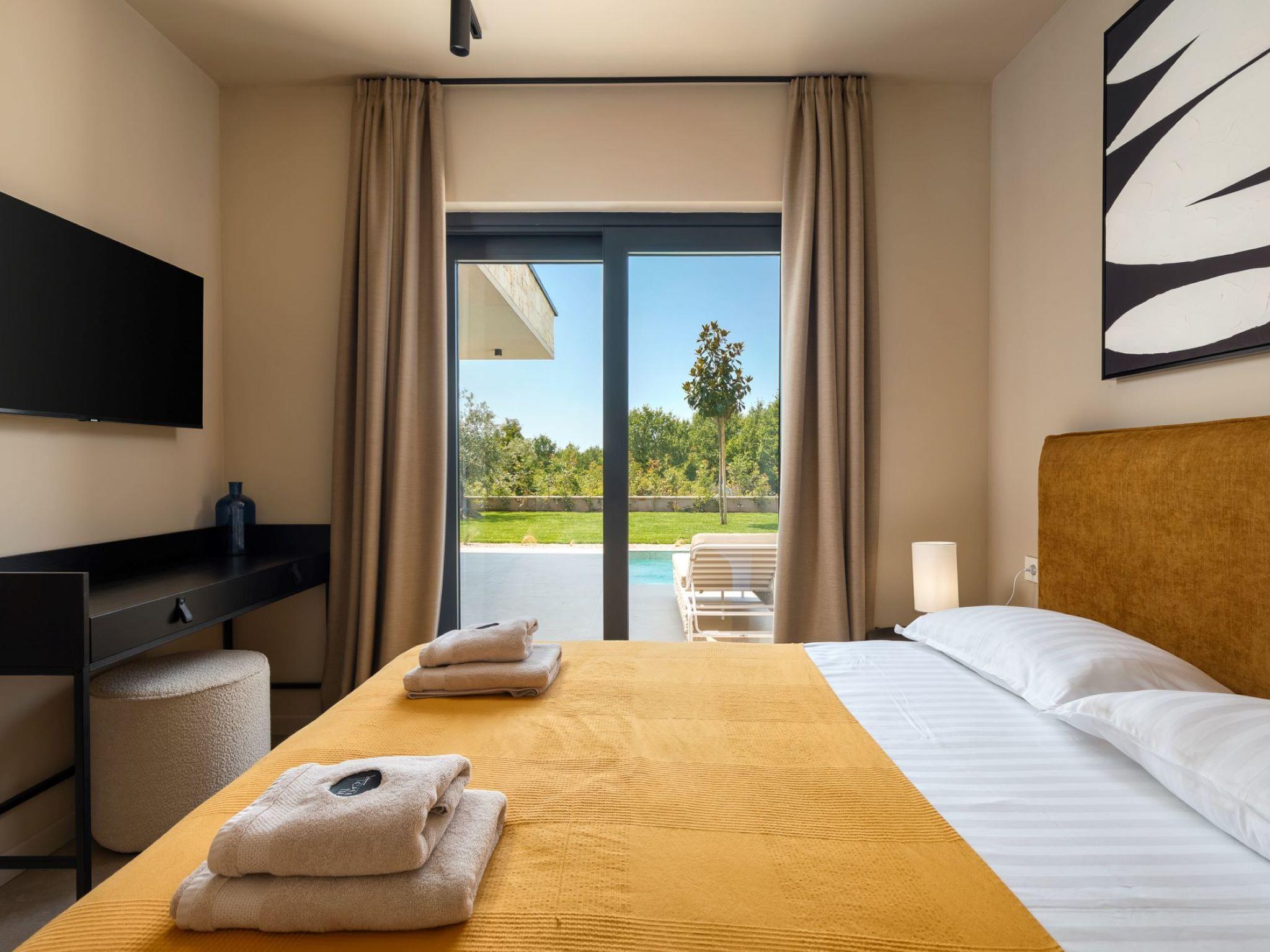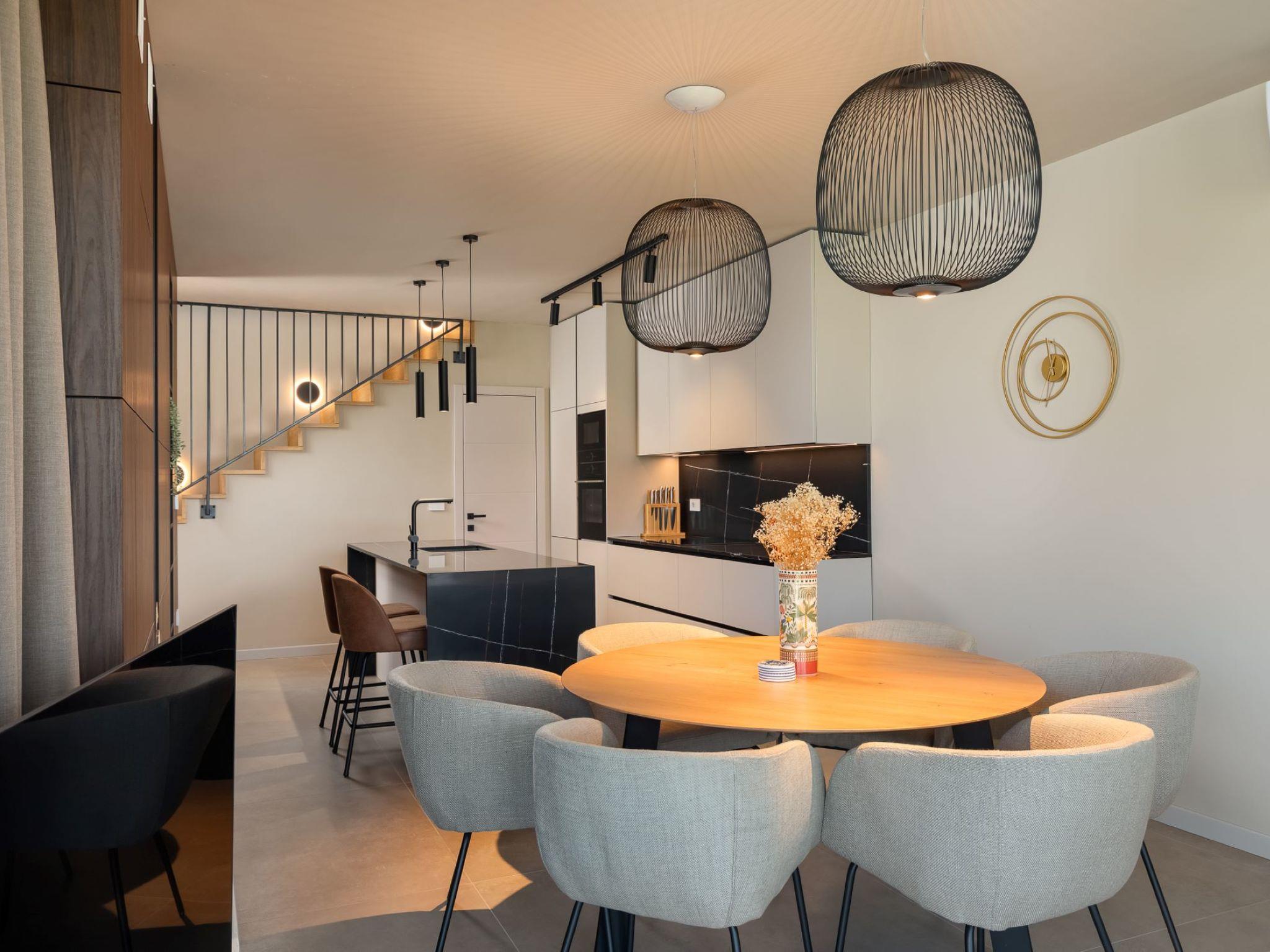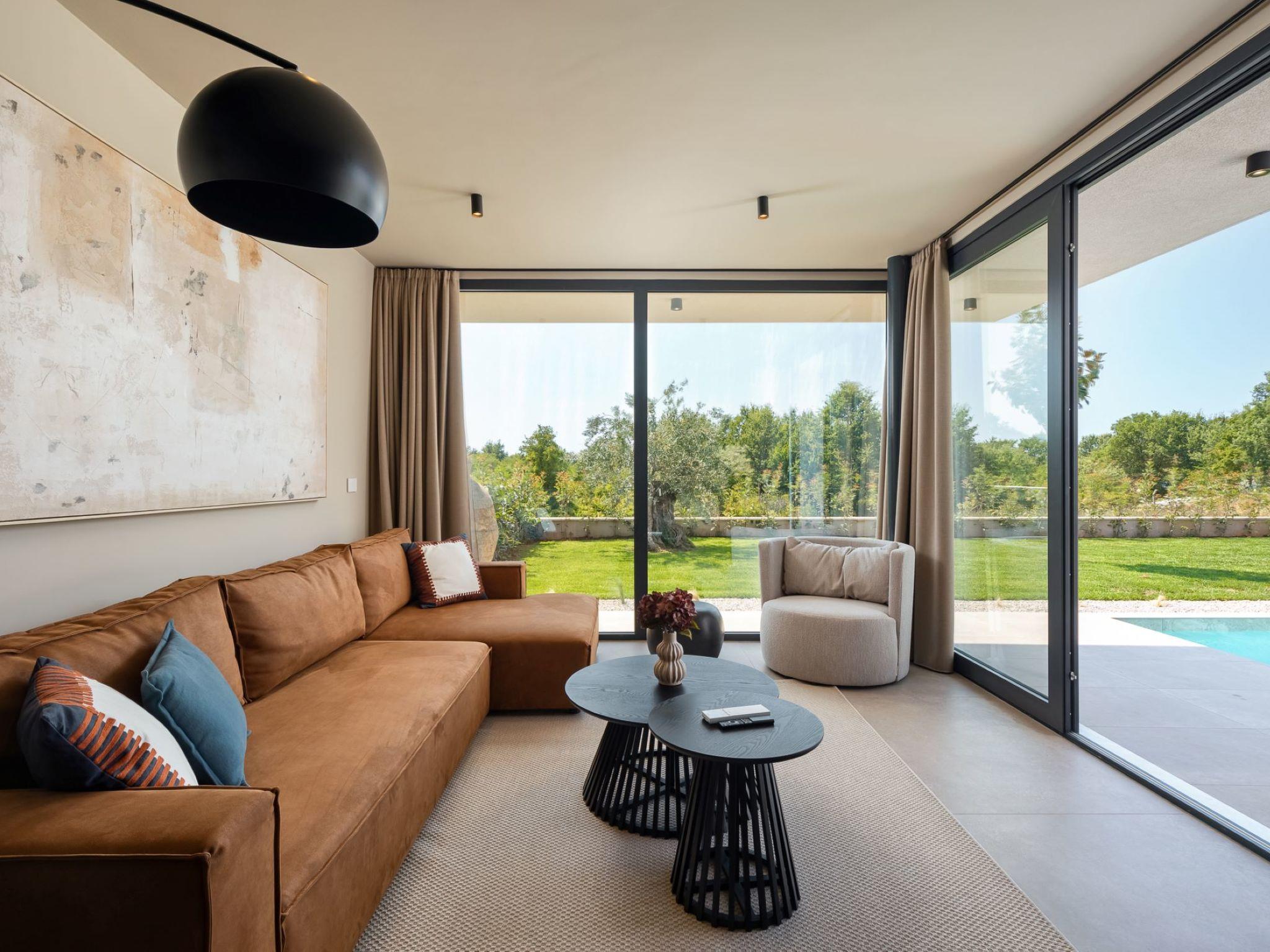 Very beautiful, cosy semi-detached house "Tia 1", 2 storeys, built in 2024. In the hamlet Mihatovici 1 km from the centre of Nova Vas, 5 km from the centre of Porec, 4.5 km from the sea, 4.5 km from the beach. Private: property 495 m2 (fenced), garden with lawn, swimming pool angular, heated (7 x 3 m, 21 m2, depth 140 cm, seasonal availability: 01.Apr. - 01.Nov.) with internal staircase and salt-electrolysis pool-cleaning system. Outdoor shower, table tennis, terrace (20 m2), garden furniture, barbecue. In the house: internet access, sauna, hot tub, washing machine. Parking (for 2 cars) at the house on the premises. E-charging station. Shop 1.5 km, shopping centre 3 km, restaurant 70 m, café 1.5 km, bus stop 2.8 km, pebble beach 4.5 km, rocky beach 4.5 km. Nearby attractions: Aquapark 9 km. Groups of teenagers on request only. Please note: airfield 46 km from the property. Swimming pool heated (extra). It is necessary to announce 7 days in advance if the pool heating is required.
