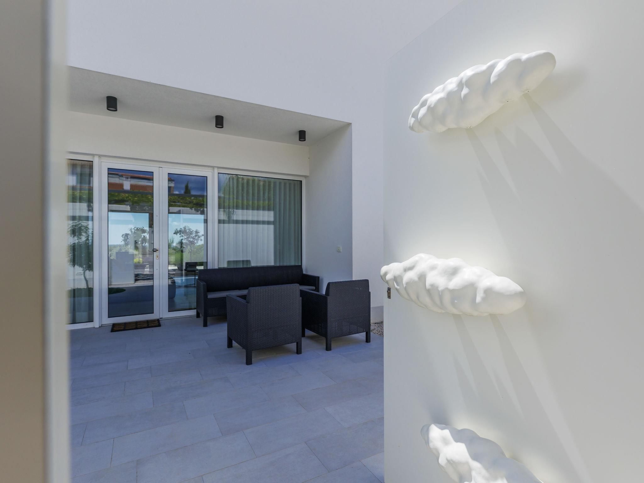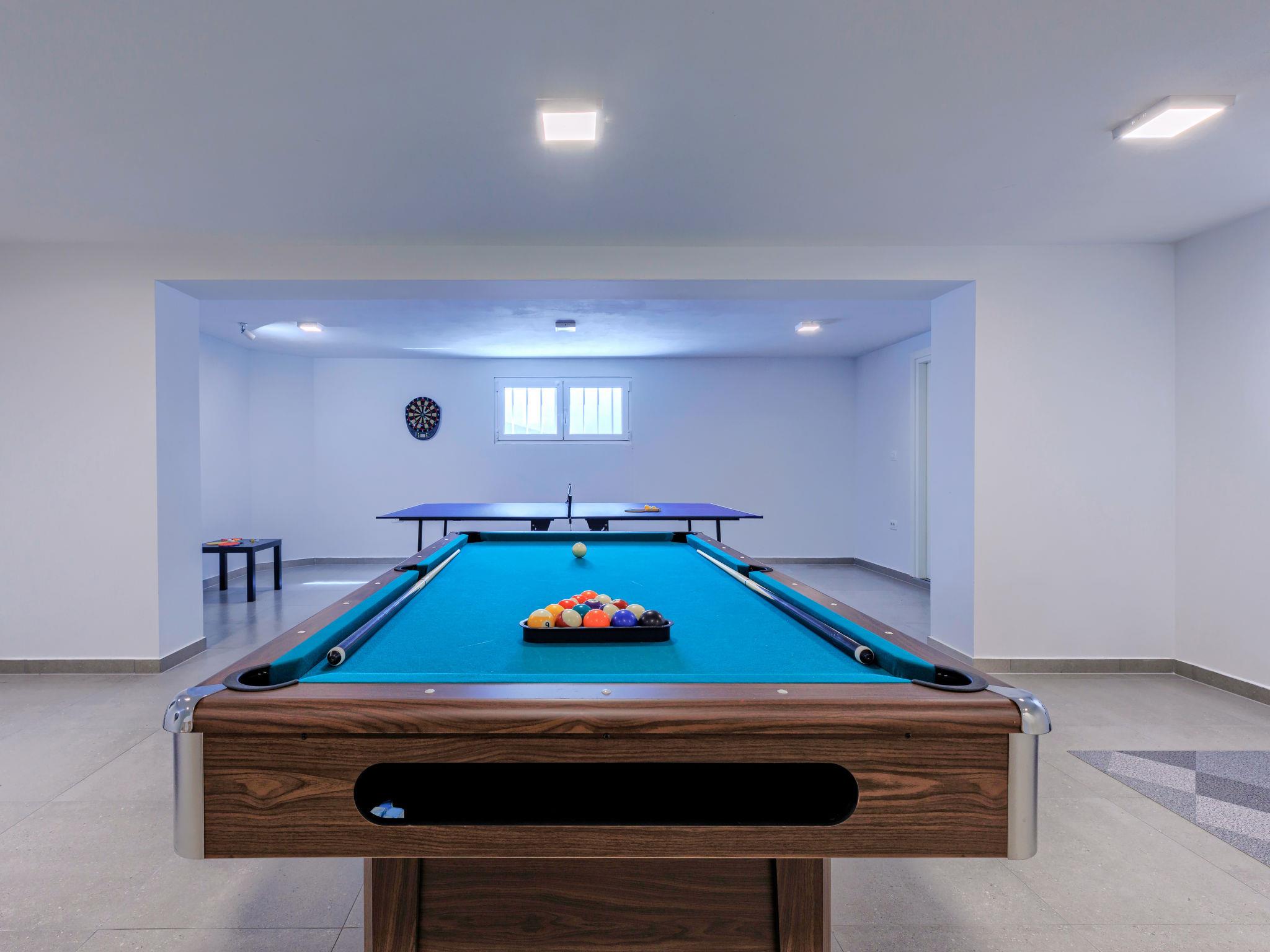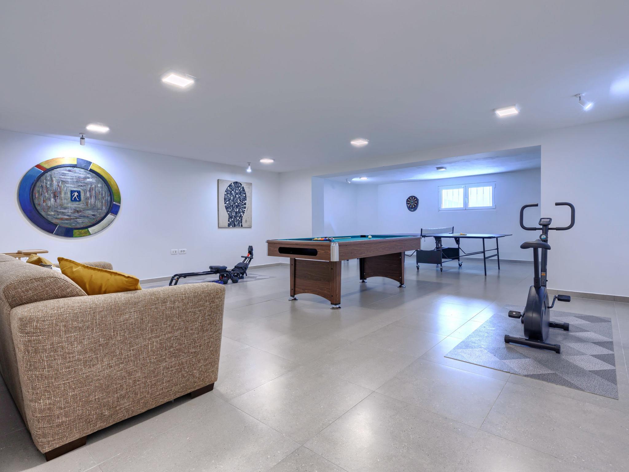 6-room villa 300 m2 on 3 levels. Spacious, modern and stylish furnishings: living/dining room with satellite TV and air conditioning. Exit to the terrace, to the swimming pool. 1 room with 1 french bed (180 cm, length 200 cm), shower/WC, satellite TV and air conditioning. Open kitchen (oven, dishwasher, 5 induction hot plates, kettle, microwave, freezer, electric coffee machine). Sep. WC. On the lower ground floor: playroom. Upper floor: 2 rooms, each room with 1 french bed (180 cm, length 200 cm), shower/WC, satellite TV and air conditioning. Exit to the balcony. 1 room with 2 beds (90 cm, length 200 cm), shower/WC, satellite TV and air conditioning. Forced-air heating. Balcony 6 m2, balcony 15 m2. Electric barbecue, deck chairs. View of the sea. Facilities: safe, iron, children's high chair, baby cot, hair dryer. Internet (WiFi, free). Maximum 1 pet/ dog allowed. The house is decorated with sculptures by the owner of the house, who is a Croatian academic sculptor.