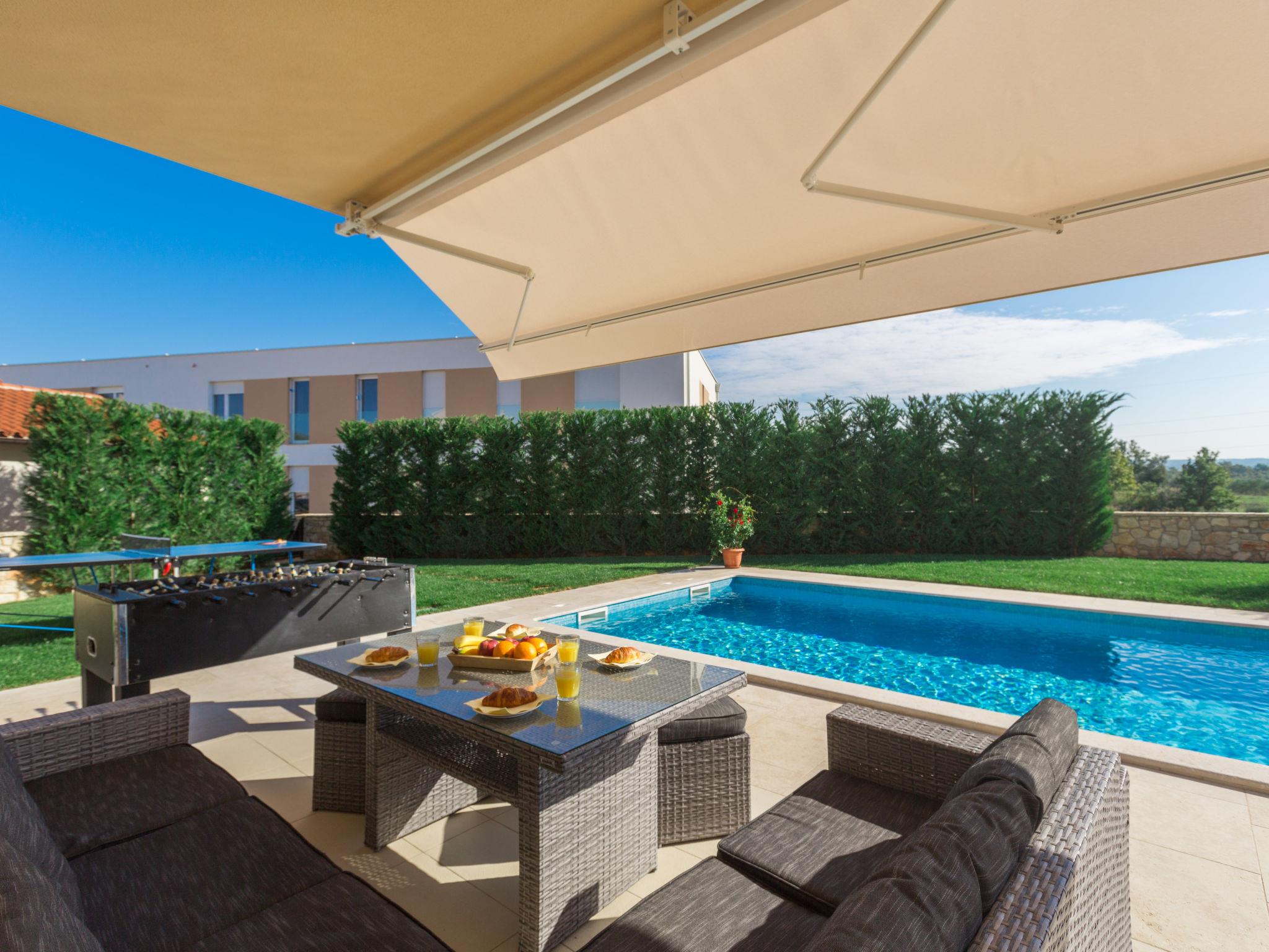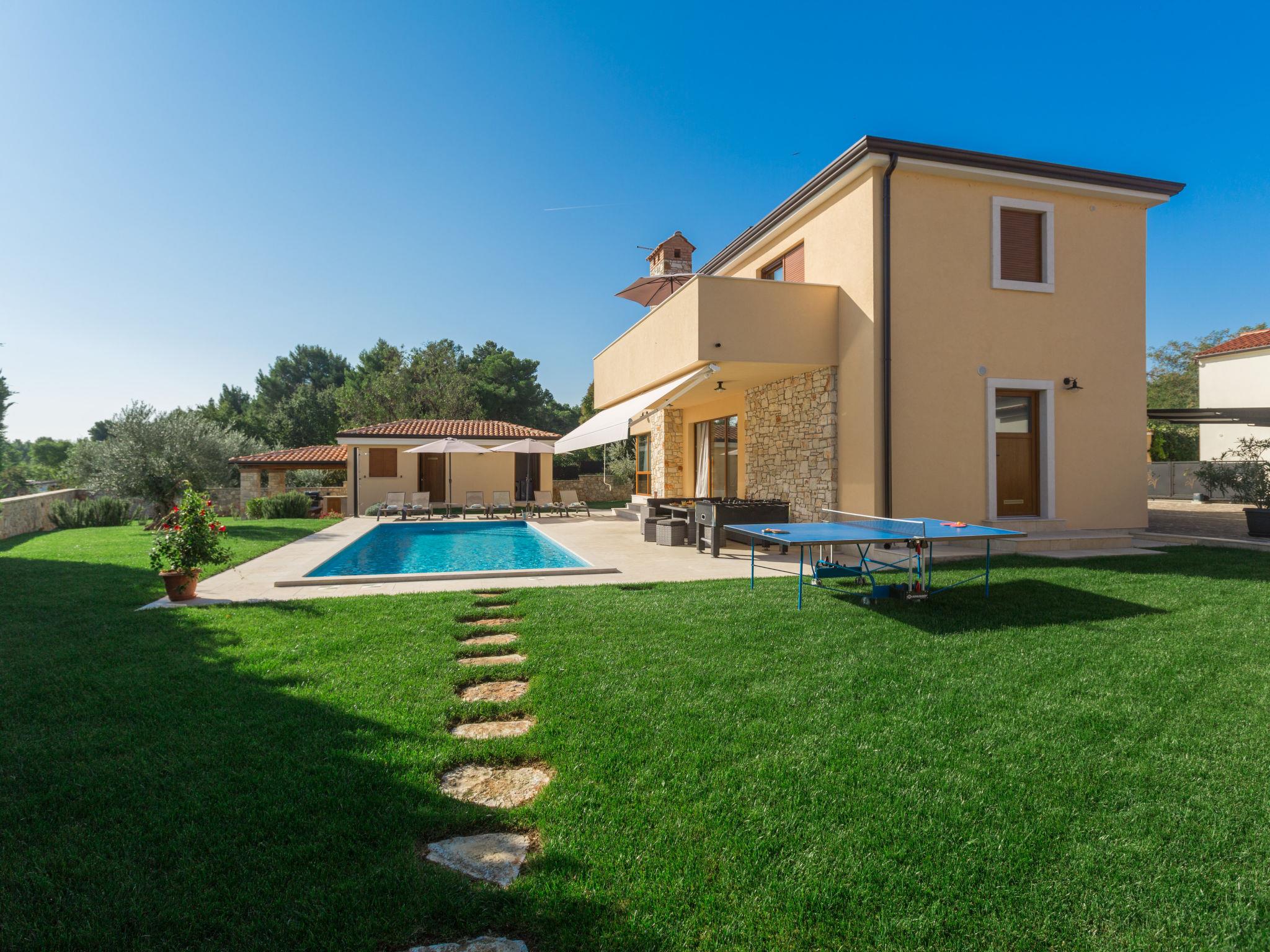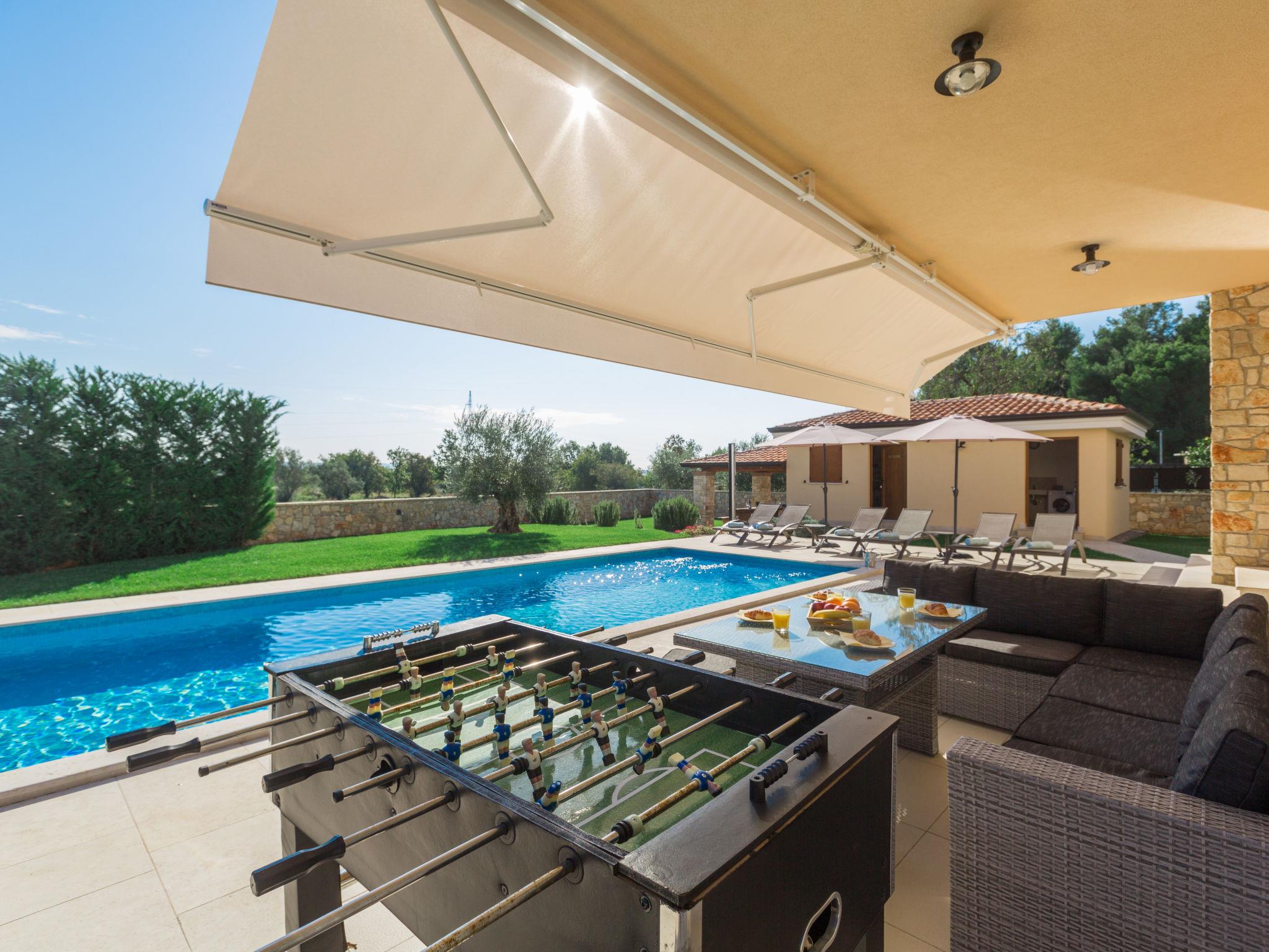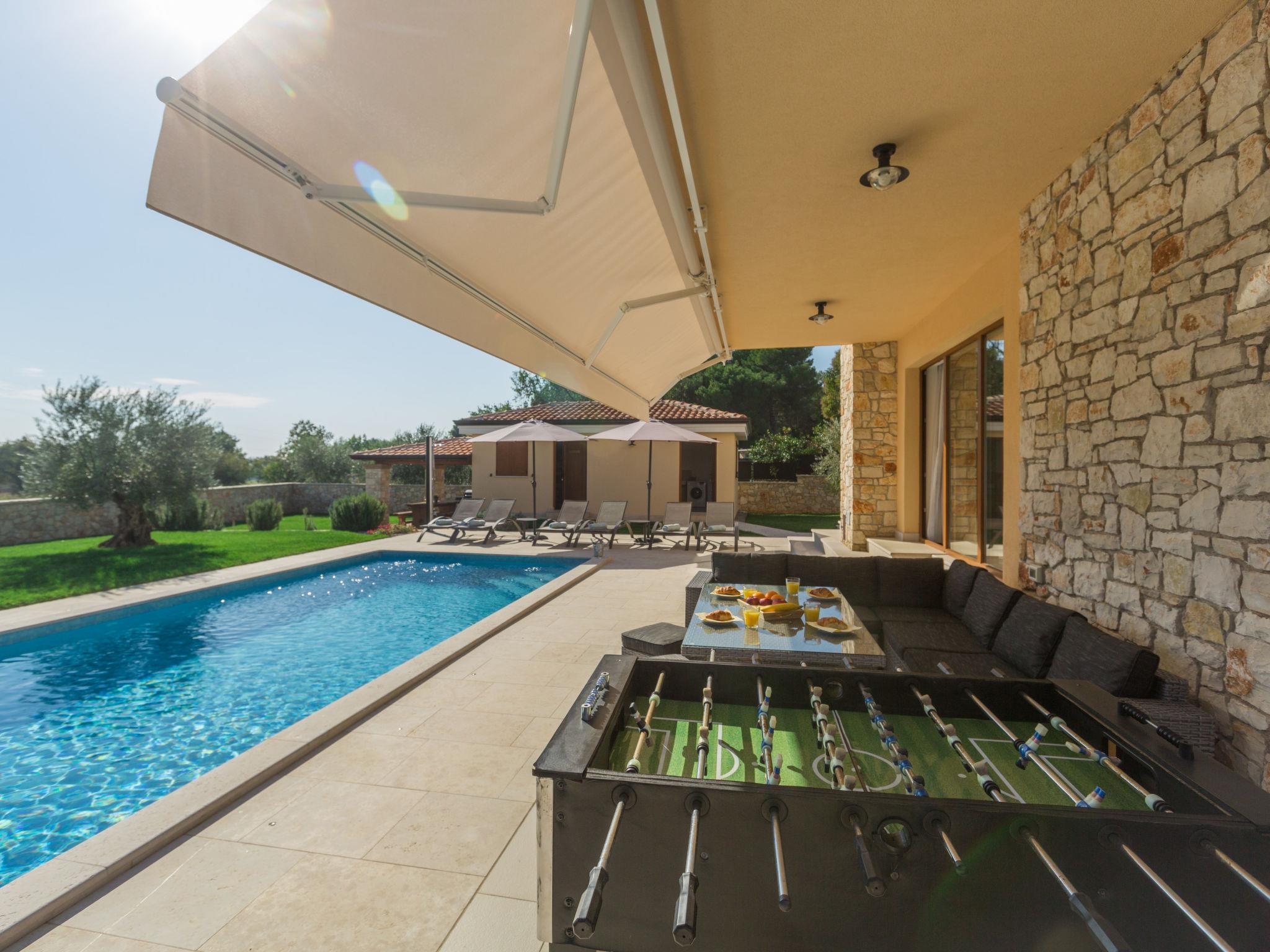 Tar 7 km from Porec: Beautiful single-family house "Villa Vatovac". 300 m from the centre of Tar, in a sunny position, 3 km from the sea, 3 km from the beach. Private: property 800 m2, garden with lawn, swimming pool angular, heated (36 m2, depth 150 cm, seasonal availability: 15.Apr. - 15.Oct.) with internal staircase and salt-electrolysis pool-cleaning system. Outdoor shower, table tennis, terrace (19 m2), garden furniture. In the house: internet access, table football, washing machine, tumble dryer. Parking (for 3 cars) at the house on the premises. Shop 300 m, supermarket 1.5 km, restaurant 300 m, bus stop 600 m, pebble beach 3 km, rocky beach 3 km, public bathing area 3 km. Tennis 3 km, walking paths from the house 100 m, cycle lane 150 m. Nearby attractions: Adrenaline Park 5 km. Please note: suitable for families. The owner does not accept any youth groups. Neighbourhood highly sensitive to noise. Quietness and good behaviour expected. Swimming pool heated (extra).