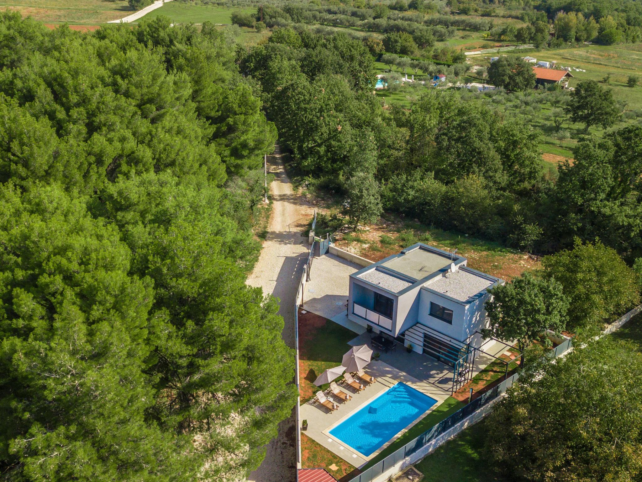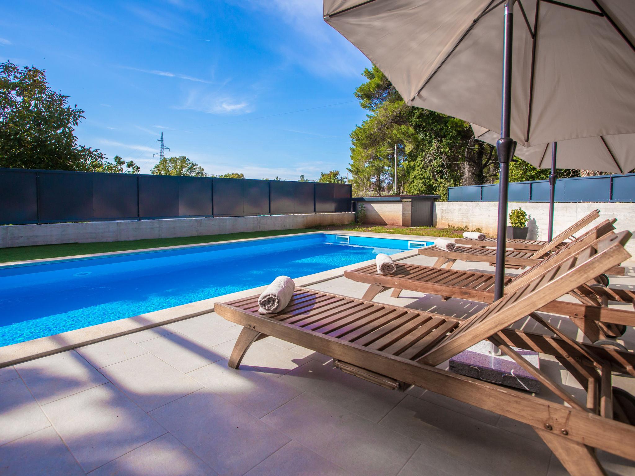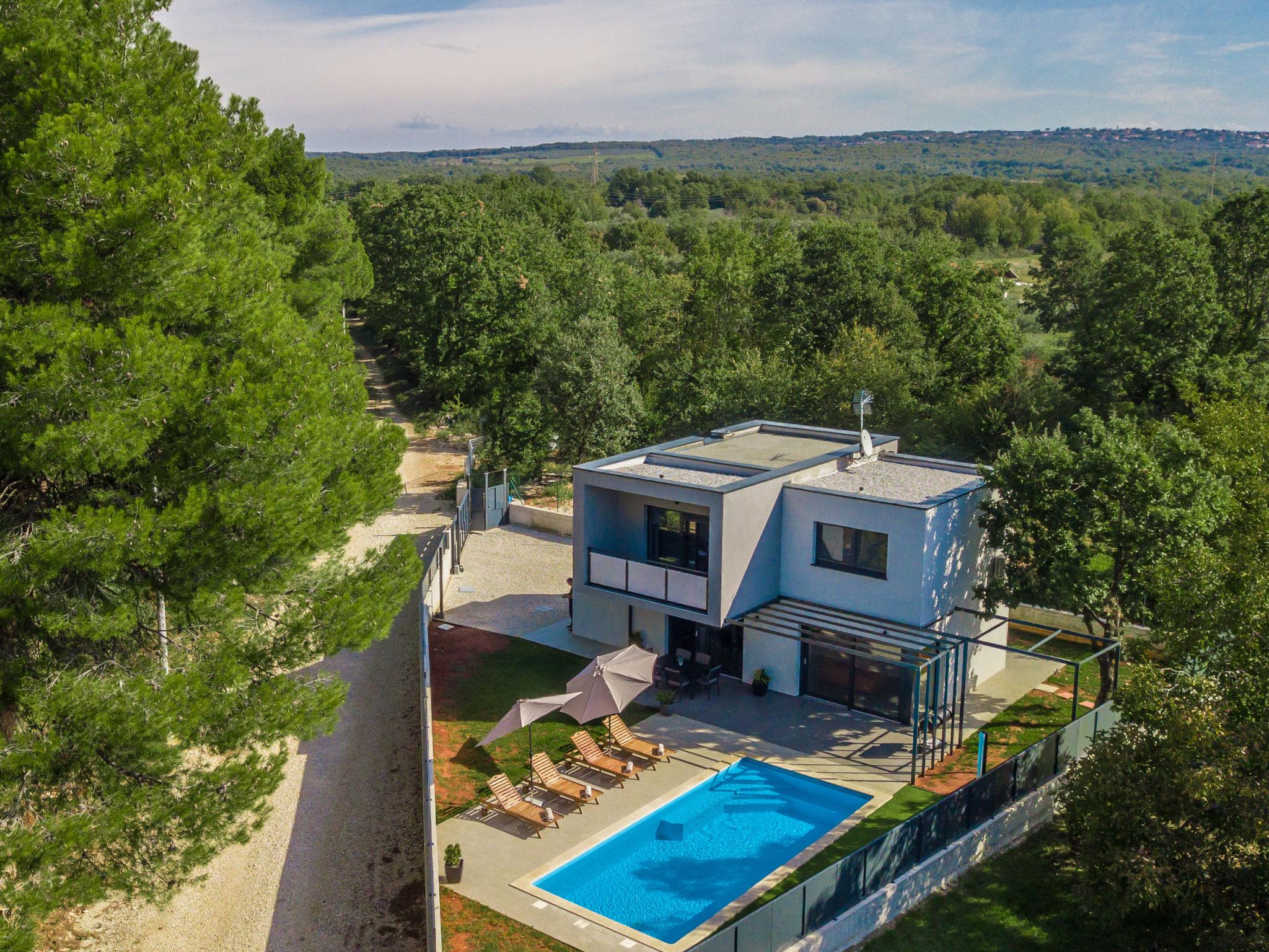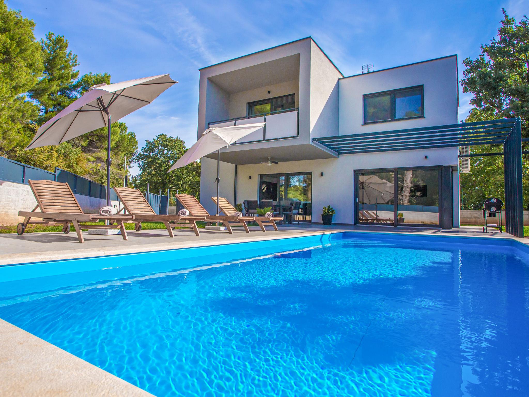 Modern villa "Villa Eva Tar", 2 storeys, built in 2024. 1 km from the centre of Tar, 8 km from the centre of Porec, in a quiet, sunny position, 3 km from the sea, 4 km from the beach. Private: property 600 m2 (fenced) with lawn, swimming pool angular, heated (34 m2, depth 140 cm, seasonal availability: 15.Apr. - 15.Oct.) with internal staircase. Outdoor shower, terrace (6 m2), barbecue, pool maintenance by the owner/gardener. In the house: internet access. Parking on the premises. Shop 1 km, restaurant 800 m, bus stop 8 m, railway station 38 m, pebble beach 4.5 km, rocky beach 4 km. Golf course (18 hole) 40 km, tennis 3 km.