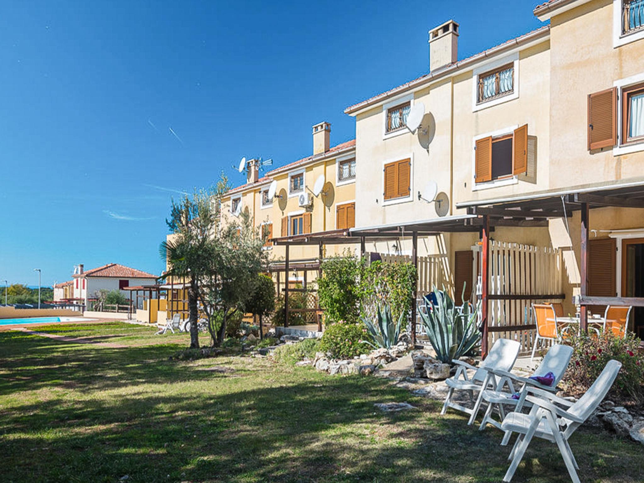Tar 7 km from Porec: Terraced house. In the hamlet Vabriga 1 km from the centre of Tar, 9 km from the centre of Novigrad, 1.8 km from the sea, 1.8 km from the beach, located by a road. For shared use: property 200 m2 with lawn 100 m2, swimming pool angular (10 x 5 m, seasonal availability: 15.May. - 15.Sep.) with internal staircase. Outdoor shower, terrace (15 m2), garden furniture, parking at the house on the premises. Shop, supermarket 400 m, restaurant 300 m, bus stop 200 m, pebble beach 1.8 km, shingle beach 1.8 km. Walking paths from the house 1.8 km, cycle lane 1.8 km. The owner does not accept any youth groups.