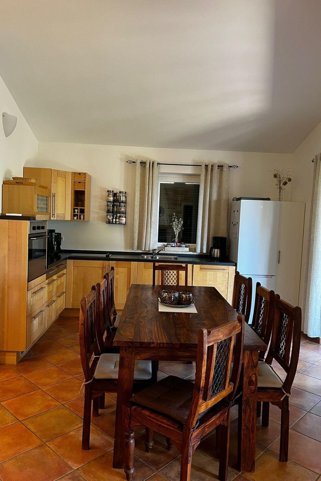 The holiday home is furnished with great attention to detail. Some of the furnishings are typical of the country, but there are also modern touches. This gives the holiday home its special touch. All 3 bedrooms are furnished with a double bed.The centre of the house is a large living room with a cosy sofa area and wood-burning stove. This living room flows into the kitchen area, where a long wooden table with seating for 8 invites you to socialise. The well-kept kitchen is fully equipped. Guests have an oven, a hob with 4 hotplates, a dishwasher, a large fridge with freezer compartment and small appliances such as a toaster, kettle and blender at their disposal. There are two bathrooms, which are equipped with WC and shower. There is a washing machine in the bathroom, which is available to guests free of charge.
