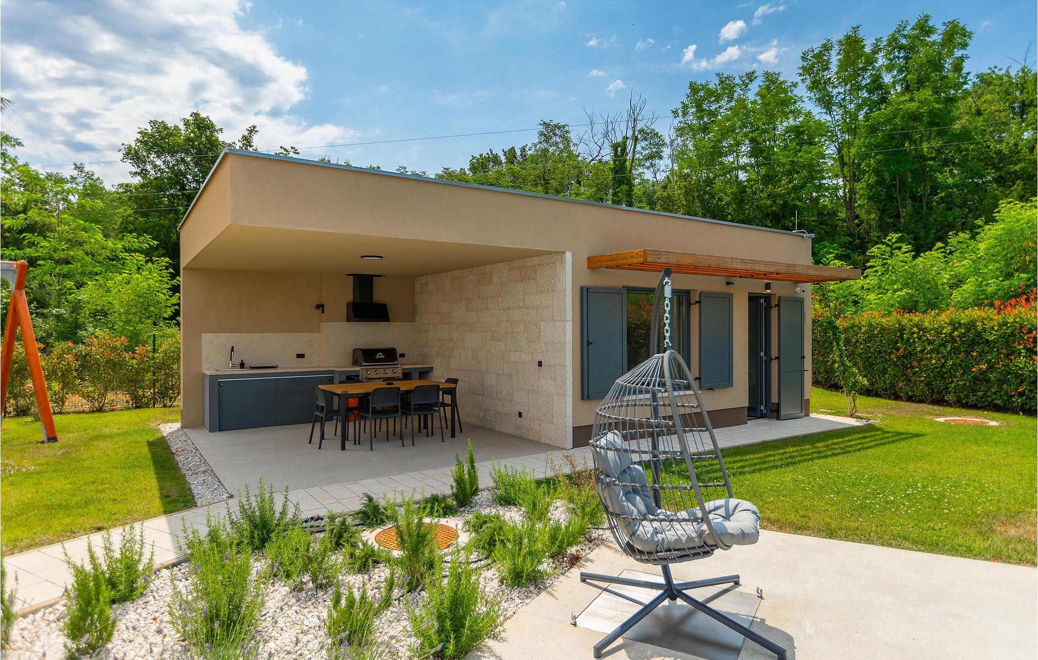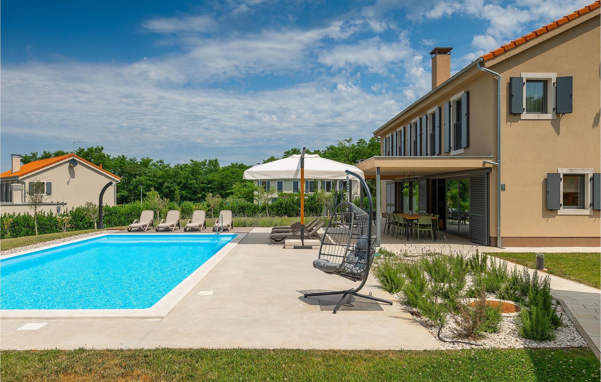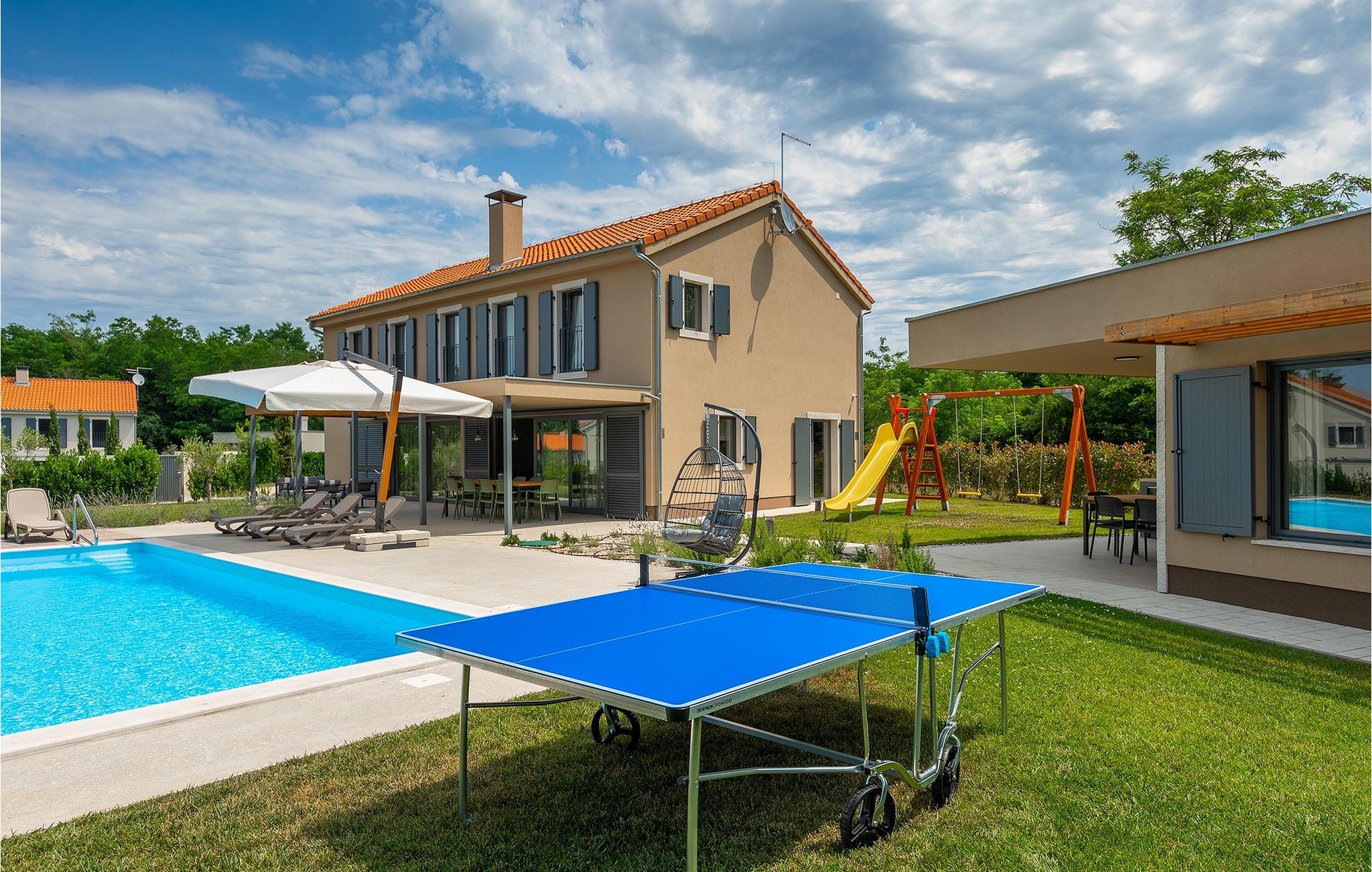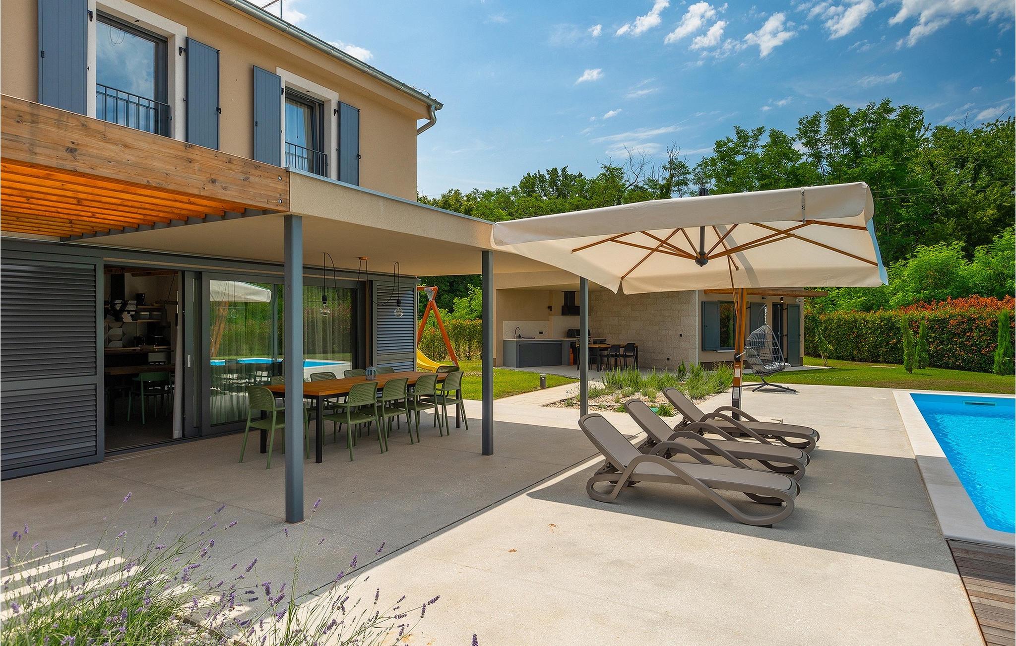 Die Villa Pinca ist von grünen Bäumen und Natur umgeben, die mit ihrer großen Gartenwiese eine idyllische Atmosphäre zum Entspannen schaffen. Der private Pool erfrischt Sie nach einem Sonnenbad auf einer der 8 Sonnenliegen. Während Sie am Pool entspannen, können die Kinder im Garten toben, auf dem privaten Spielplatz spielen oder eine Partie Tischtennis spielen. In einem schattigen Bereich befindet sich direkt neben dem Spielplatz eine Außenküche mit Grill. Ein Esstisch für bis zu 10 Gäste eignet sich perfekt für eine Mahlzeit im Schatten direkt am Pool. Im Inneren finden Sie ein großes Wohnzimmer mit 2 Sofas, das von Tageslicht durchflutet ist und sich perfekt für Filmabende und Gespräche eignet. Im gleichen Raum können Sie in der Küche mit Kücheninsel ein köstliches Essen zubereiten und es am Esstisch für bis zu 10 Personen neben einem großen Fenster genießen. Im Obergeschoss befinden sich 3 komfortable Doppelzimmer mit Fernseher und eigenem Bad. Ein weiteres separates Doppelzimmer steht in einem Pavillon im Garten zur Verfügung. Dieses Schlafzimmer verfügt auch über einen eigenen Fernseher und ein Badezimmer. Villa Pinca ist wirklich die perfekte Wahl für einen Sommerurlaub mit der Familie. Die Villa Pinca befindet sich im Dorf Vizinada in der Nähe von Porec. Nur 30 Minuten entfernt können Sie die antike Stadt Porec besuchen, wo Sie den Mittelpunkt der Stadt besichtigen können, die bemerkenswerte Euphrasius-Basilika, die zum UNESCO-Weltkulturerbe gehört und für ihre faszinierenden byzantinischen Mosaike bekannt ist. Machen Sie einen Spaziergang entlang der lebhaften Uferpromenade, wo bunte Boote und die Adria einen atemberaubenden Ausblick bieten. Ein weiterer nahe gelegener Ort ist Umag. Die Landschaft ist bekannt für ihre Weinberge und Olivenhaine, Wiesen und Wälder. Wir empfehlen einen Besuch in den Weinkellern der Familie und die Verkostung der berühmten istrischen Köstlichkeiten: Pasta mit Trüffeln, Prosciutto und Käse, alles mit einem Glas des berühmten istrischen Malvasia. In den charmanten, gepflasterten Straßen der Stadt gibt es zahlreiche ausgezeichnete Restaurants, Bars und Cafés. Hier können Sie Istriens Höhlen, wunderschöne grüne Natur, idyllische Hügel und kulturelle Sehenswürdigkeiten wie Kirchen, Kapellen und archäologische Stätten erleben. In der Nähe befindet sich der erste kroatische Wasserpark in Istralandia, wo Sie mit Ihren Lieben Wasseraktivitäten genießen können.