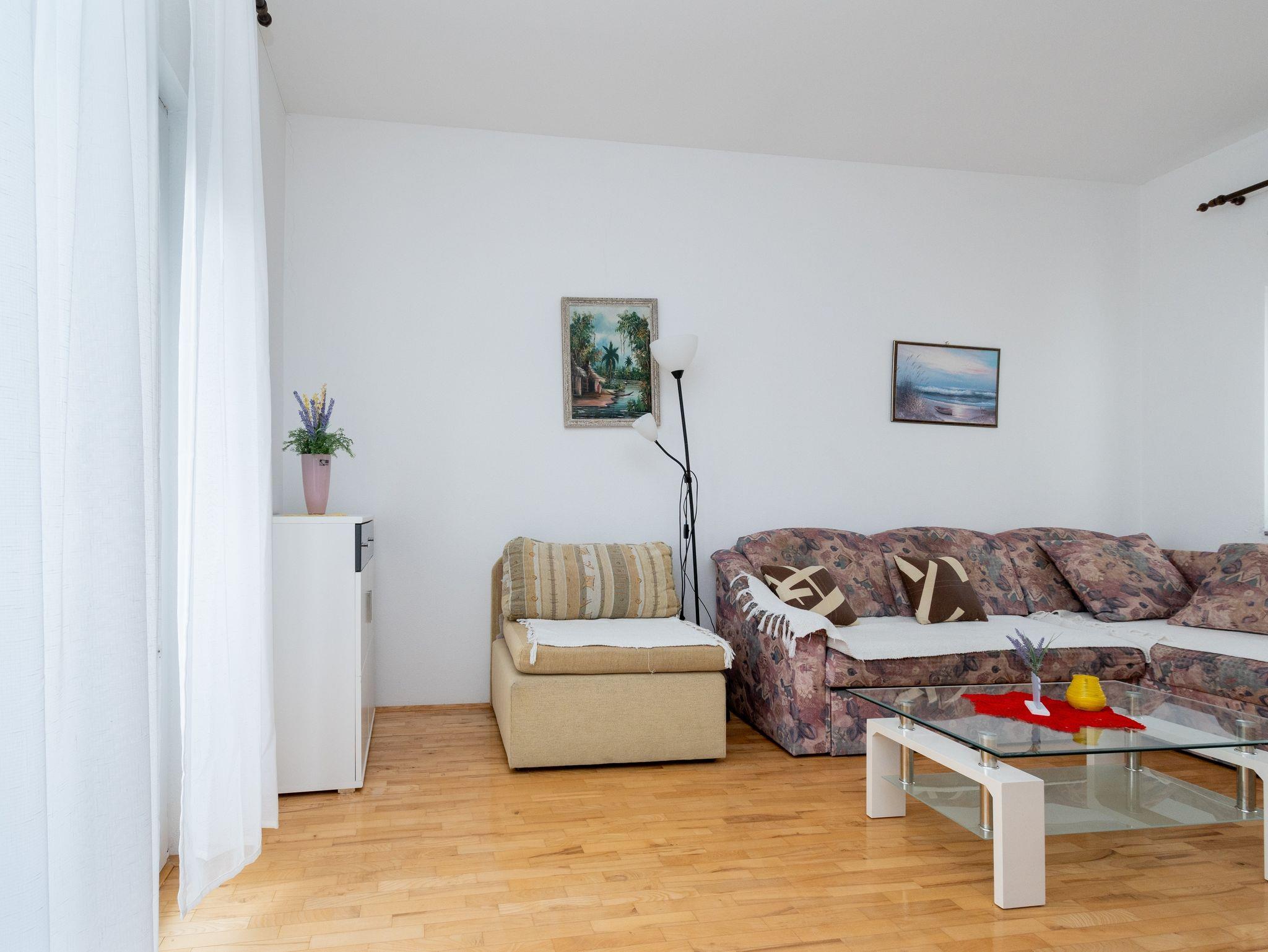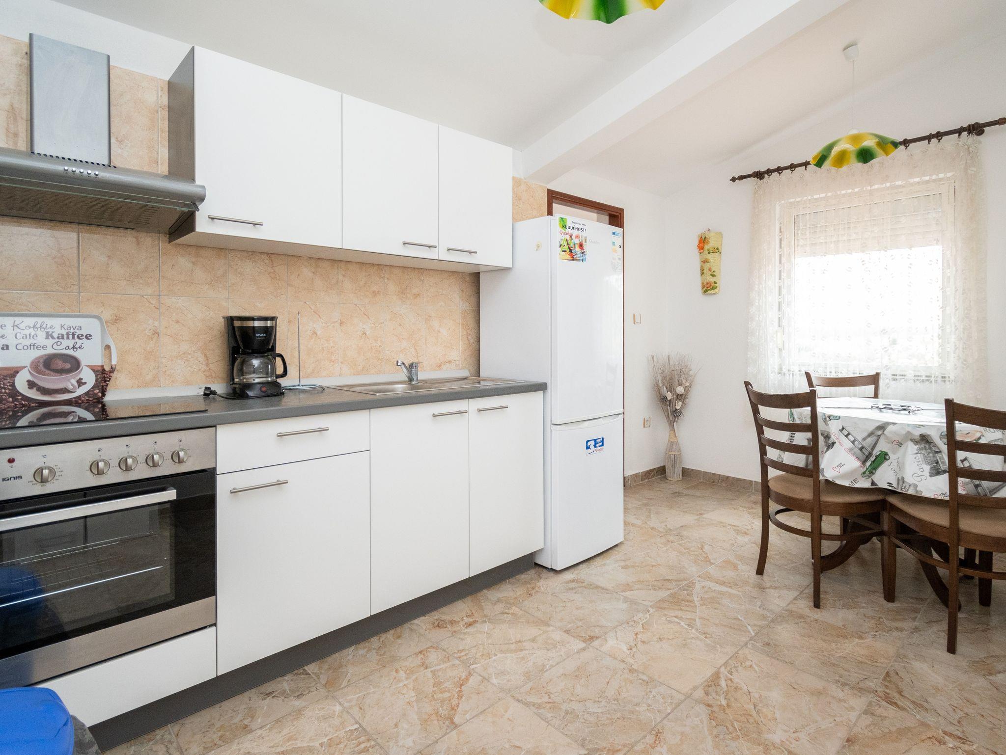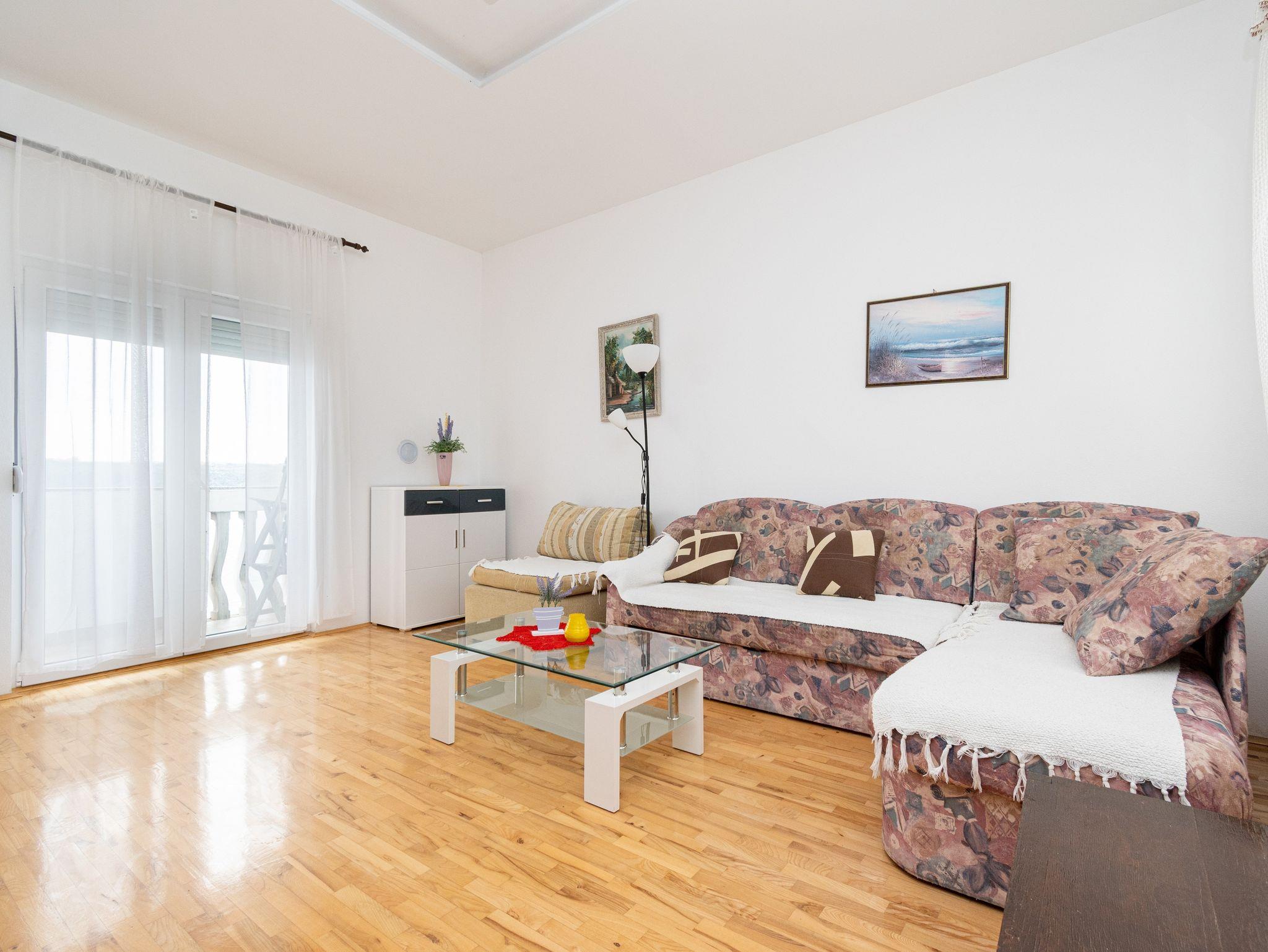 Ferienwohnung bietet Platz für 5 Gäste. Die Betten sind in Schlafzimmern, die es 2 gibt, und in Wohnzimmer, innerhalb einer Gesamtfläche von 62m2, angeordnet. Die Gäste haben einen eigenen Balkon zur Verfügung, auf der sie in warmen Sommernächten genießen können. Das Apartment bietet Meerblick. Es ist erlaubt, Speisen auf dem Gemeinschafts-Grill vorzubereiten. IM PREIS INBEGRIFFEN: Kurtaxe, Endreinigung, Klimatisierung, Parkplatz, Internet. VERBINDLICHE ZUSÄTZLICHE KOSTEN: Aufzahlung für Kurzaufenthalte (prozentualer Zuschlag pro Nächtigungsanzahl: 30% - 1, 20% - 2, 10% - 3). Die Verfügbarkeit zusätzlicher Dienstleistungen in Ihrem reservierten Termin und die Preise derselben (falls nicht aufgeführt) müssen im Voraus überprüft werden. Zusätzliche Dienstleistungen die in der Zahlungsaufforderung nicht aufgeführt sind werden direkt beim Vermieter bezahlt, angenommen der Gast nutzt auch diese. Ermäßigung auf den Grundpreis: Gratistag 14=13 (bei einem Aufenthalt von 14 Tagen oder mehr erhalten Sie einen Gratistag für den Aufenthalt bis 31.12.26).