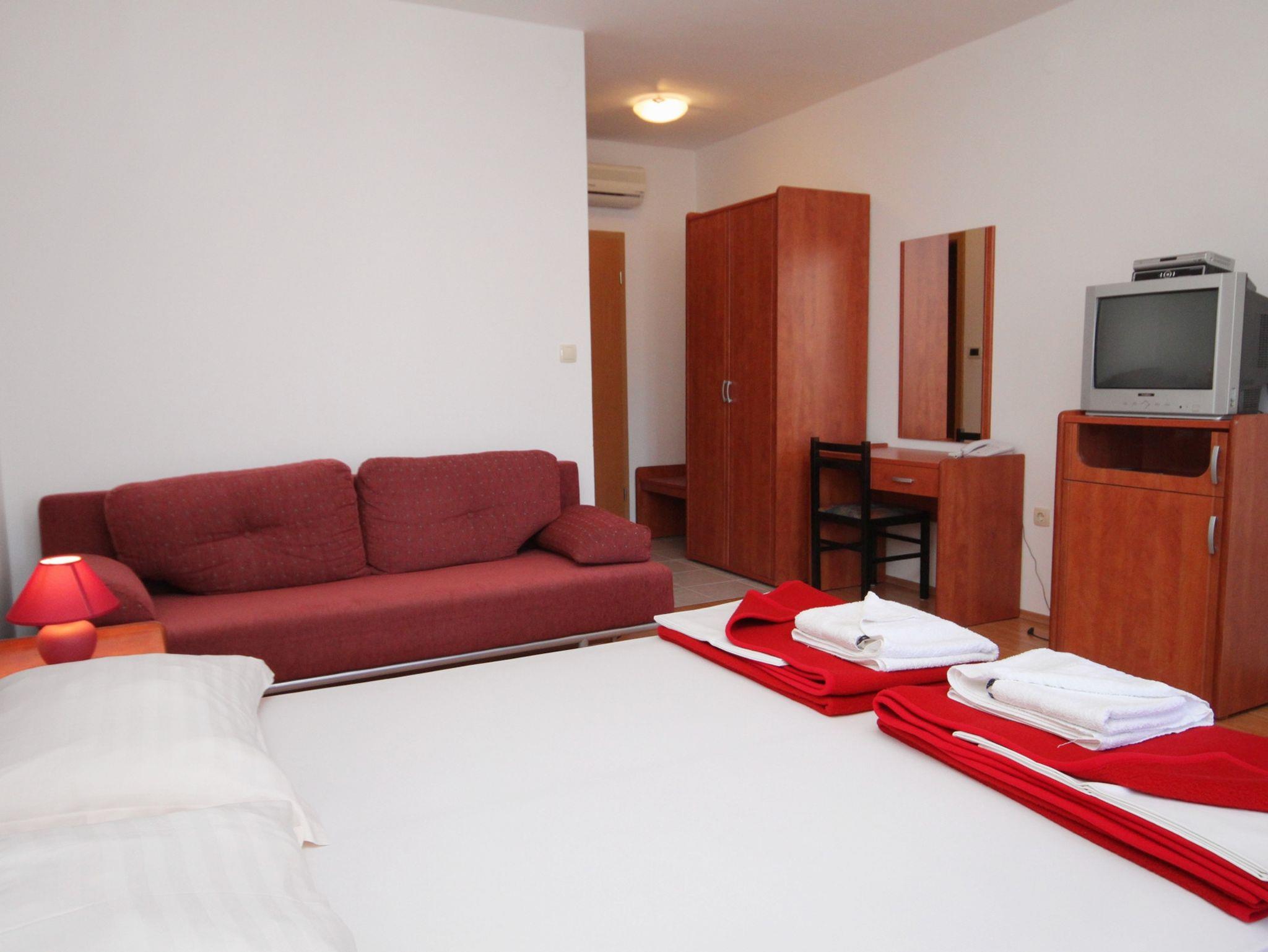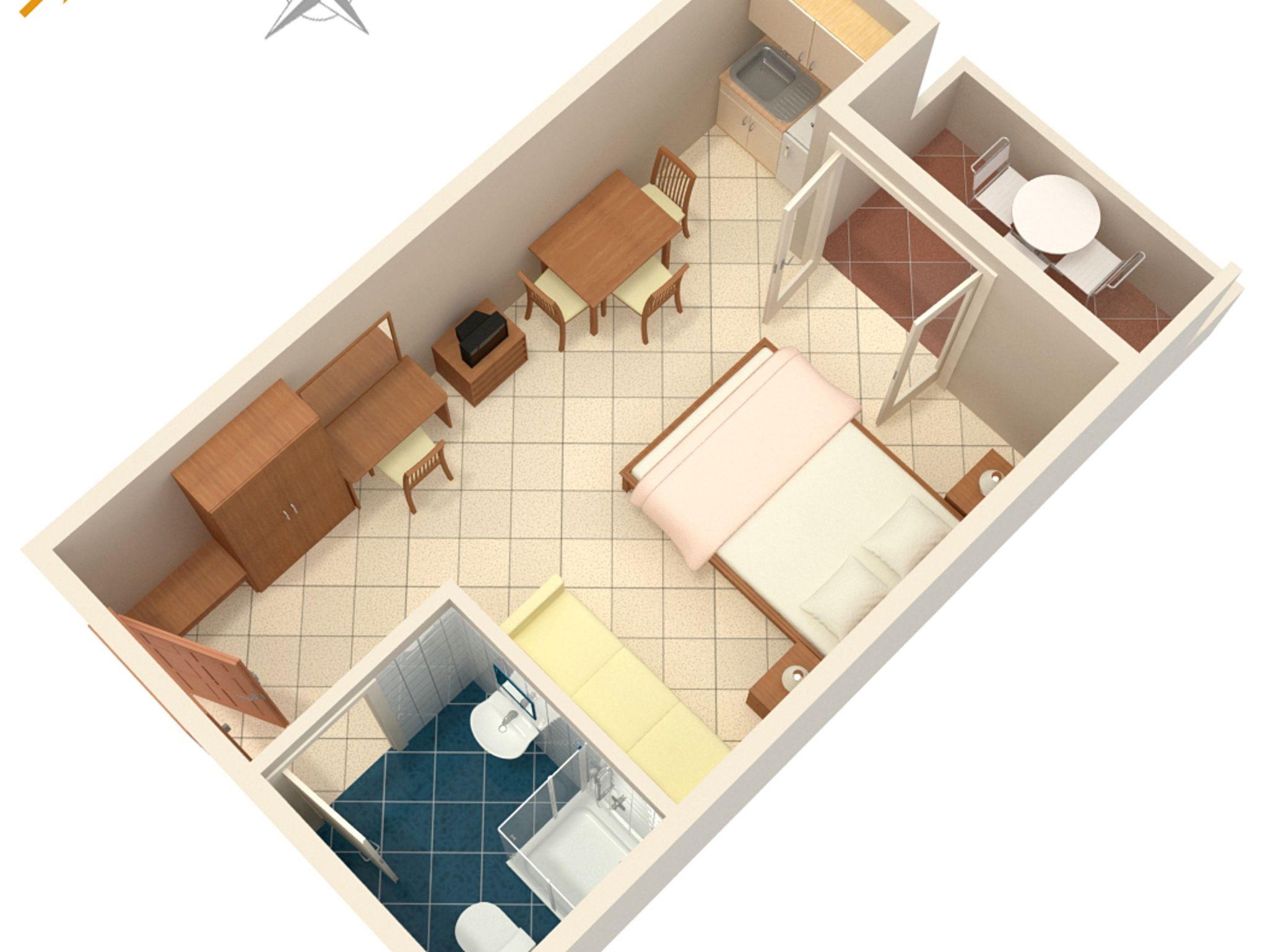 Studio bietet Platz für 3 Gäste. Die Betten sind in Schlafzimmern, die es 1 gibt, innerhalb einer Gesamtfläche von 26m2, angeordnet. Die Gäste haben eine eigene Terrasse zur Verfügung, auf der sie in warmen Sommernächten genießen können. Das Studio-Apartment bietet Meerblick. In der Unterkunftseinheit besteht die Möglichkeit des Mitbringens von Haustieren gegen Aufpreis. IM PREIS INBEGRIFFEN: Endreinigung, Klimatisierung, Parkplatz, Internet, Wäschewaschen, Kinderbett, Bügeleisen, Bügelbrett, Föhn. VERBINDLICHE ZUSÄTZLICHE KOSTEN: Kurtaxe (Erwachsene 0,93 € - 1,50 € Nacht/Person, Kinderermäßigung 12 - 17 Jahre), Aufzahlung für Kurzaufenthalte (prozentualer Zuschlag pro Nächtigungsanzahl: 30% - 1, 20% - 2, 10% - 3). UNVERBINDLICHE ZUSÄTZLICHE KOSTEN: Frühstück (13,00 €, 50% Nachlass für Kinder zwischen 4 und 12 Jahren, Kinder bis 4 Jahre sind frei.), Halbpension (40,00 €, 50% Nachlass für Kinder zwischen 4 und 12 Jahren, Kinder bis 4 Jahre sind frei.), Haustiere (3,00 € pro Nacht). Die Verfügbarkeit zusätzlicher Dienstleistungen in Ihrem reservierten Termin und die Preise derselben (falls nicht aufgeführt) müssen im Voraus überprüft werden. Zusätzliche Dienstleistungen die in der Zahlungsaufforderung nicht aufgeführt sind werden direkt beim Vermieter bezahlt, angenommen der Gast nutzt auch diese.