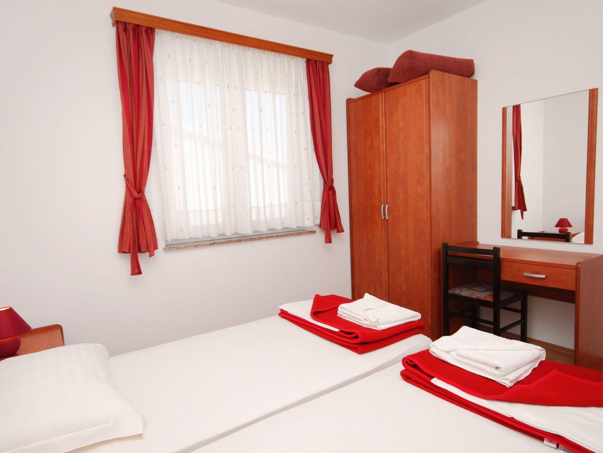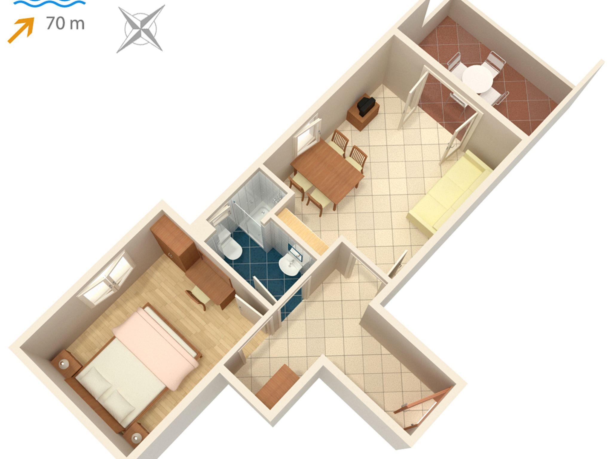Ferienwohnung bietet Platz für 4 Gäste. Die Betten sind in Schlafzimmern, die es 1 gibt, und in Wohnzimmer, innerhalb einer Gesamtfläche von 38m2, angeordnet. Die Gäste haben eine eigene Terrasse zur Verfügung, auf der sie in warmen Sommernächten genießen können. Das Apartment bietet Meerblick. In der Unterkunftseinheit besteht die Möglichkeit des Mitbringens von Haustieren gegen Aufpreis. IM PREIS INBEGRIFFEN: Endreinigung, Klimatisierung, Parkplatz, Internet, Wäschewaschen, Kinderbett, Bügeleisen, Bügelbrett, Föhn. VERBINDLICHE ZUSÄTZLICHE KOSTEN: Kurtaxe (Erwachsene 0,93 € - 1,50 € Nacht/Person, Kinderermäßigung 12 - 17 Jahre), Aufzahlung für Kurzaufenthalte (prozentualer Zuschlag pro Nächtigungsanzahl: 30% - 1, 20% - 2, 10% - 3). UNVERBINDLICHE ZUSÄTZLICHE KOSTEN: Frühstück (13,00 €, 50% Nachlass für Kinder zwischen 4 und 12 Jahren, Kinder bis 4 Jahre sind frei.), Halbpension (40,00 €, 50% Nachlass für Kinder zwischen 4 und 12 Jahren, Kinder bis 4 Jahre sind frei.), Haustiere (3,00 € pro Nacht). Die Verfügbarkeit zusätzlicher Dienstleistungen in Ihrem reservierten Termin und die Preise derselben (falls nicht aufgeführt) müssen im Voraus überprüft werden. Zusätzliche Dienstleistungen die in der Zahlungsaufforderung nicht aufgeführt sind werden direkt beim Vermieter bezahlt, angenommen der Gast nutzt auch diese.