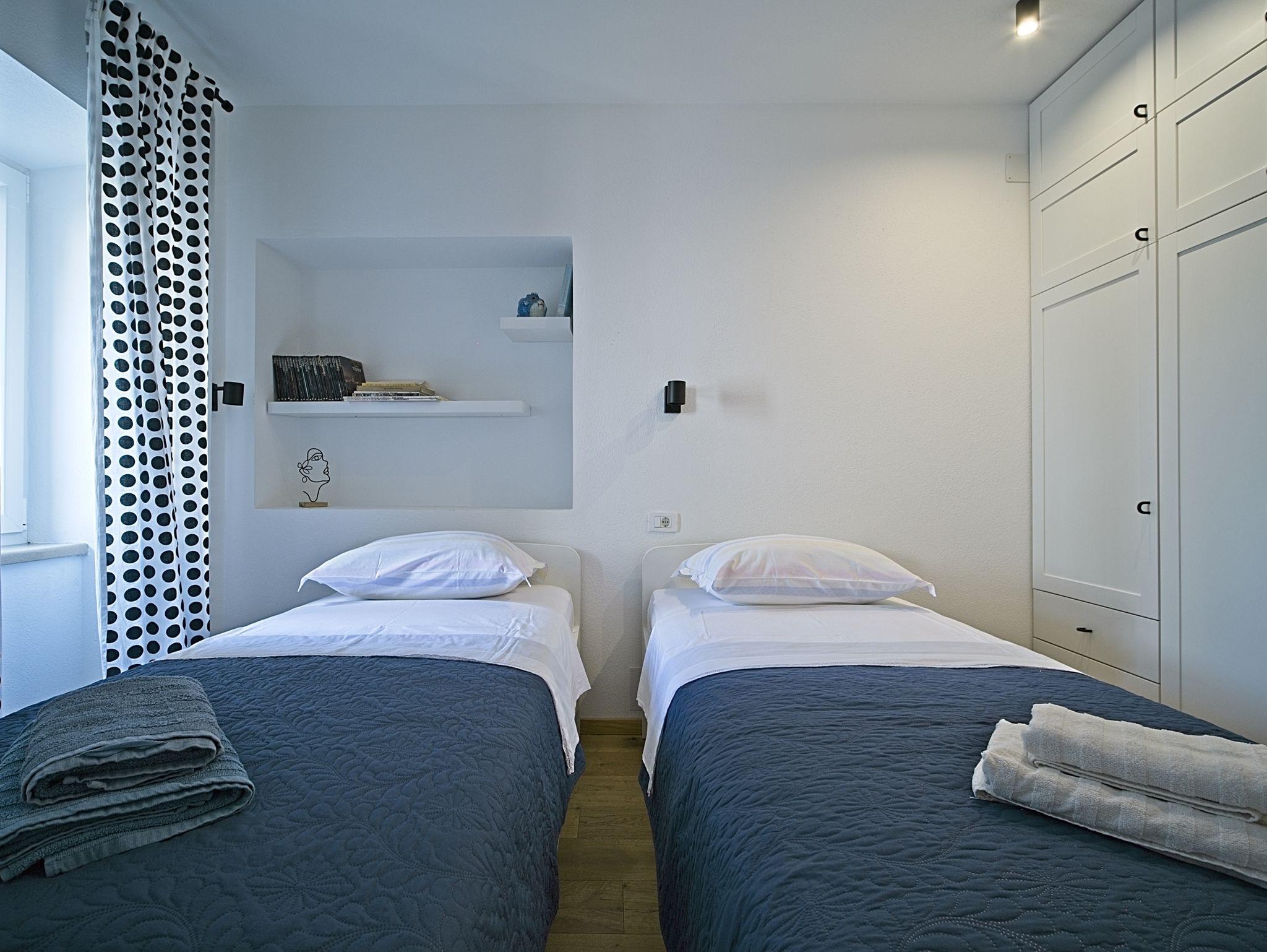 Ferienwohnung bietet Platz für 4 Gäste. Die Betten sind in Schlafzimmern, die es 2 gibt, innerhalb einer Gesamtfläche von 59m2, angeordnet. Die Gäste haben eine eigene Terrasse zur Verfügung, auf der sie in warmen Sommernächten genießen können. Das Apartment bietet Meerblick. Es ist erlaubt, Speisen auf dem Gemeinschafts-Grill vorzubereiten. IM PREIS INBEGRIFFEN: Kurtaxe, Endreinigung, Klimatisierung, Internet, Bügeleisen, Bügelbrett, Föhn. Die Verfügbarkeit zusätzlicher Dienstleistungen in Ihrem reservierten Termin und die Preise derselben (falls nicht aufgeführt) müssen im Voraus überprüft werden. Zusätzliche Dienstleistungen die in der Zahlungsaufforderung nicht aufgeführt sind werden direkt beim Vermieter bezahlt, angenommen der Gast nutzt auch diese.