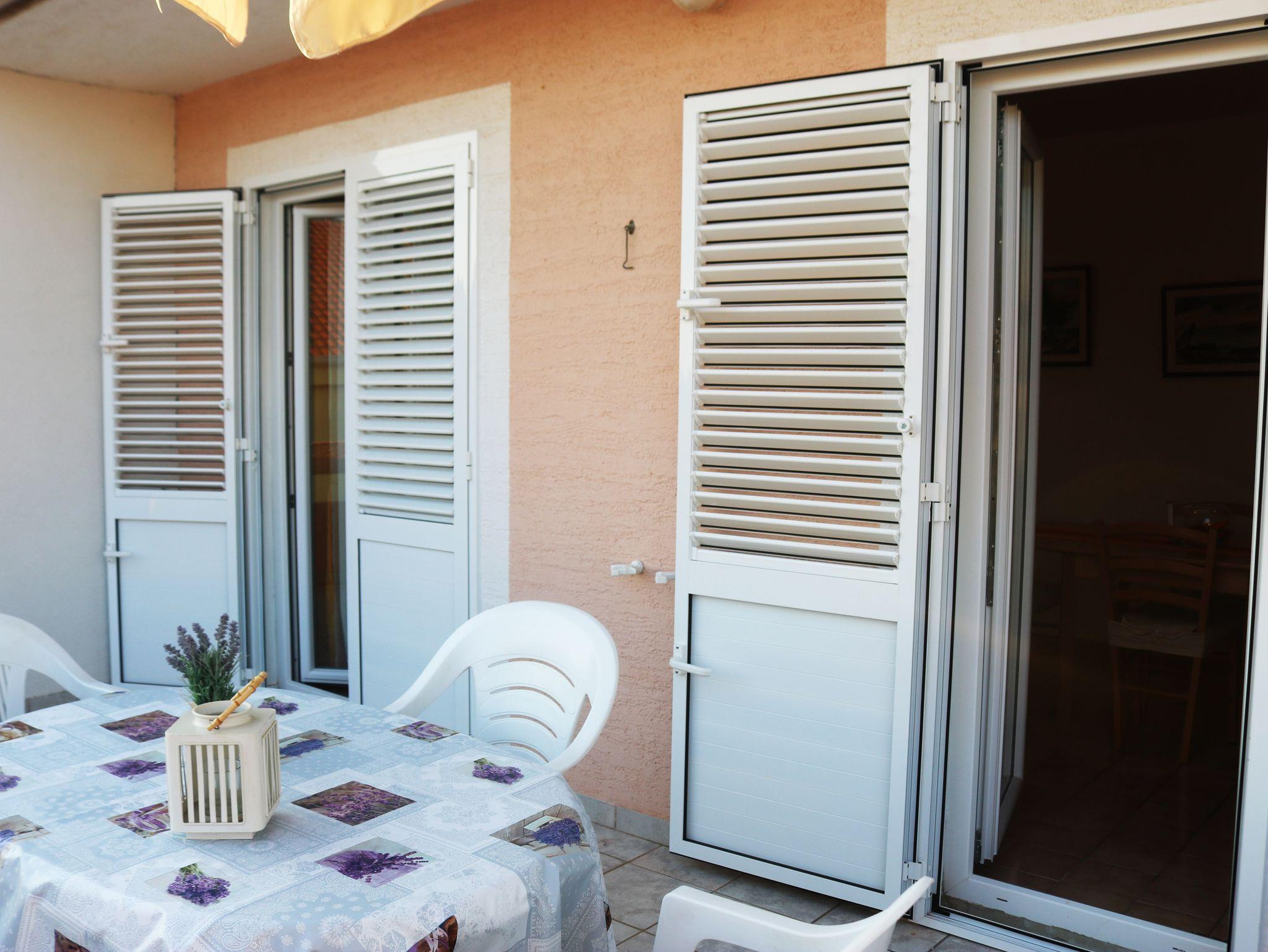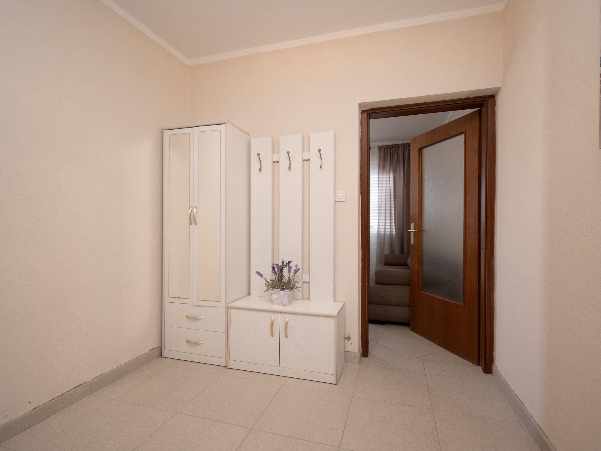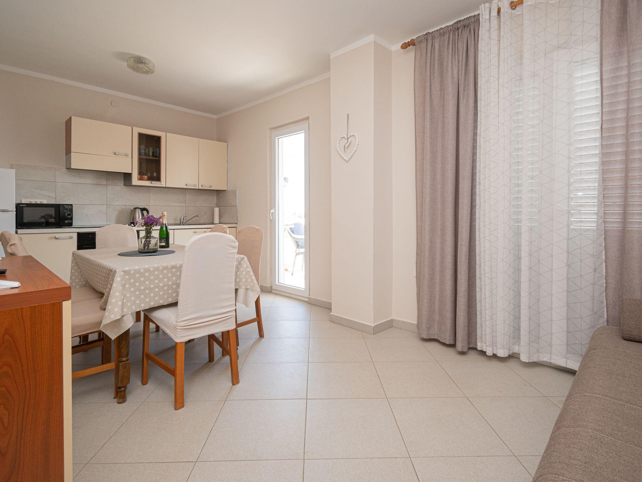 Ferienwohnung bietet Platz für 4 Gäste. Die Betten sind in Schlafzimmern, die es 2 gibt, innerhalb einer Gesamtfläche von 48m2, angeordnet. Die Gäste haben eine eigene Terrasse zur Verfügung, auf der sie in warmen Sommernächten genießen können. Das Apartment bietet Meerblick. Es ist erlaubt, Speisen auf dem Gemeinschafts-Grill vorzubereiten. IM PREIS INBEGRIFFEN: Kurtaxe, Endreinigung, Klimatisierung, Parkplatz, Internet, Bügeleisen, Föhn. VERBINDLICHE ZUSÄTZLICHE KOSTEN: Aufzahlung für Kurzaufenthalte (prozentualer Zuschlag pro Nächtigungsanzahl: 30% - 1, 20% - 2, 10% - 3). Die Verfügbarkeit zusätzlicher Dienstleistungen in Ihrem reservierten Termin und die Preise derselben (falls nicht aufgeführt) müssen im Voraus überprüft werden. Zusätzliche Dienstleistungen die in der Zahlungsaufforderung nicht aufgeführt sind werden direkt beim Vermieter bezahlt, angenommen der Gast nutzt auch diese. Ermäßigung auf den Grundpreis: Gratistag 14=13 (bei einem Aufenthalt von 14 Tagen oder mehr erhalten Sie einen Gratistag für den Aufenthalt bis 31.12.26).