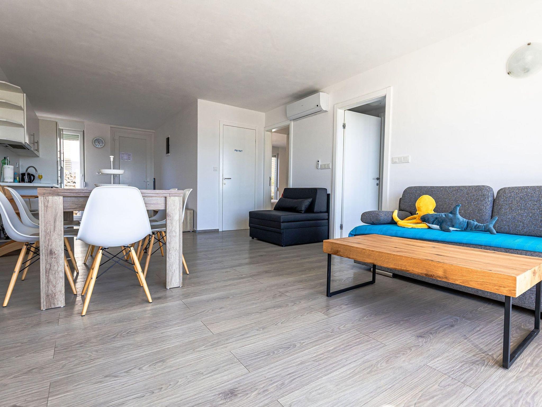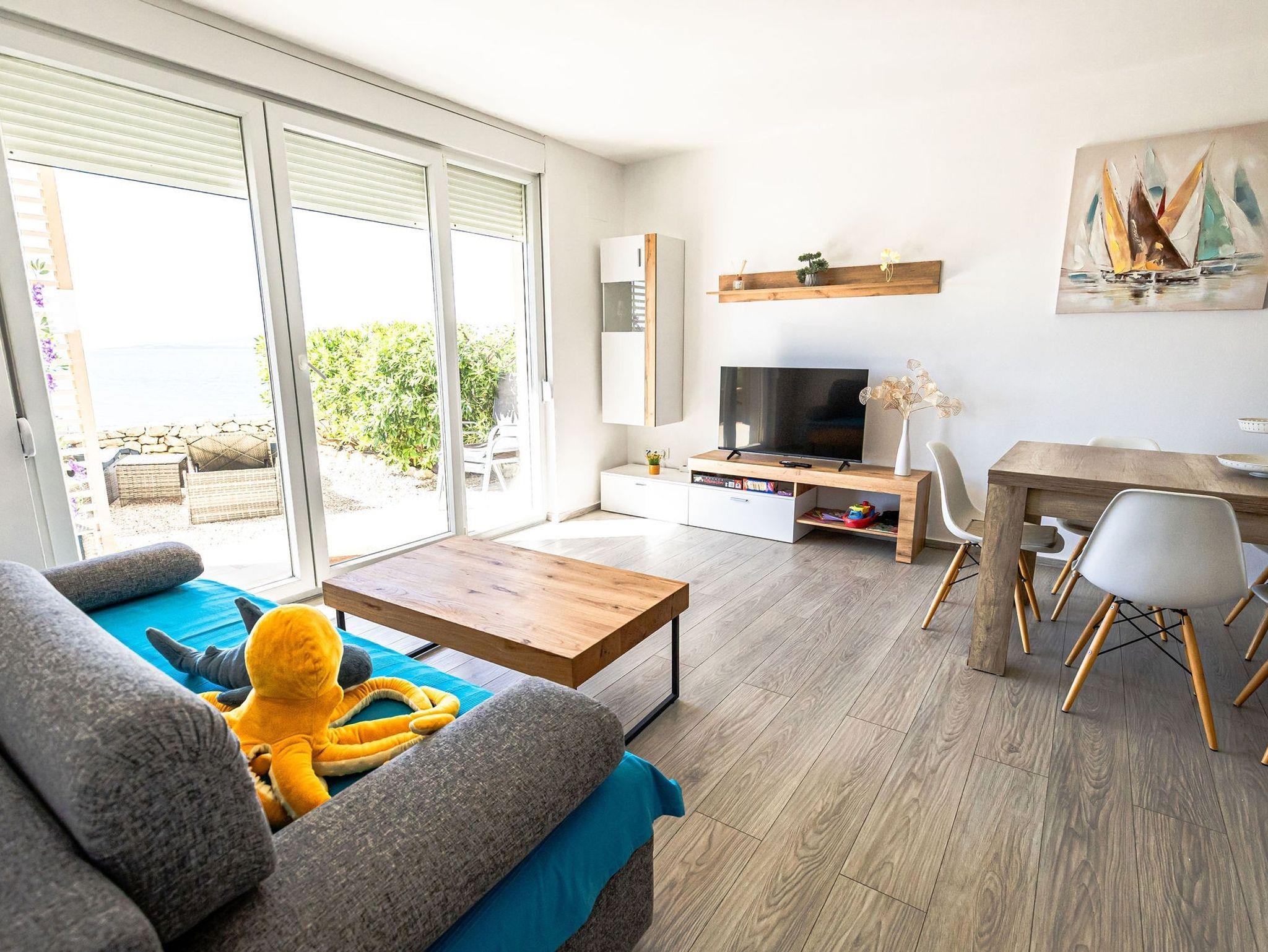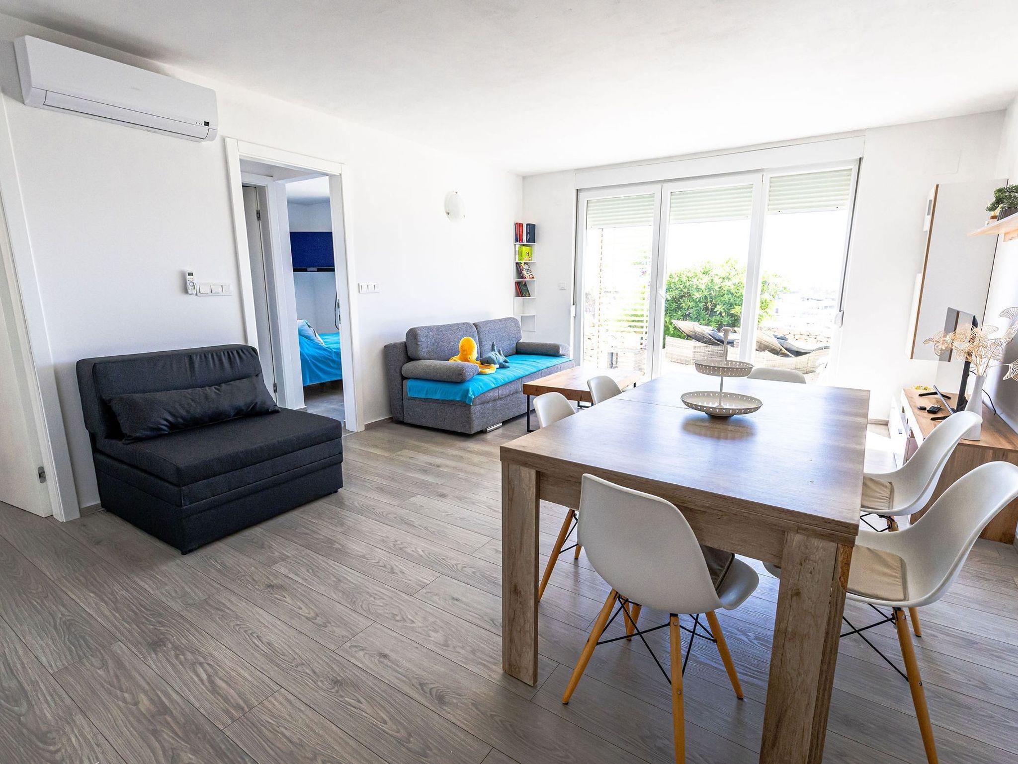 Ferienwohnung bietet Platz für 6 Gäste. Die Betten sind in Schlafzimmern, die es 2 gibt, und in Wohnzimmer, innerhalb einer Gesamtfläche von 85m2, angeordnet. Die Gäste haben eine eigene Terrasse zur Verfügung, auf der sie in warmen Sommernächten genießen können. Das Apartment bietet Meerblick. Für vollen Genuss und Entspannung gibt es einen privaten Grill für Gäste dieser Unterkunft. Während ihres Aufenthalts können Gäste das gemeinsam zur Nutzung stehende Schwimmbad benutzen. IM PREIS INBEGRIFFEN: Kurtaxe, Endreinigung, Klimatisierung, Pool, Parkplatz, Internet, Kinderbett, Bügeleisen, Bügelbrett, Föhn, Sonnenschirm, Liegestühle. Die Verfügbarkeit zusätzlicher Dienstleistungen in Ihrem reservierten Termin und die Preise derselben (falls nicht aufgeführt) müssen im Voraus überprüft werden. Zusätzliche Dienstleistungen die in der Zahlungsaufforderung nicht aufgeführt sind werden direkt beim Vermieter bezahlt, angenommen der Gast nutzt auch diese.