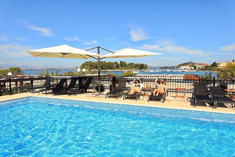 Modern holiday complex with comfortable apartments and a large common pool on the island of Ugljan in the middle of the archipelago of Zadar. Unique is the beautiful location right on the beach with a sandy bay. The bright, modern apartments all have wifi and a beautifully furnished terrace where you can spend cozy evenings with your loved ones. Each apartment is located in a separate cottage. The port of Preko is located in the middle of the idyllic island of Ugljan and is also the berth for the ferries and passenger boats from Zadar. A lively harbor with restaurants and cafes as well as a variety of Dalmatian-style buildings and a beautiful and very clean sandy beach make the place so special. Highlights included: Usage-based energy costs, bed linen, towels, Wifi, registration fee. Activities nearby: In addition to bathing and swimming in the sea and in the pool you can pursue a variety of sports such as tennis, basketball and table tennis. 20 official hiking trails lead you across the island, along the coasts and also through the hilly interior of the island. There is also a well-developed network of cycle paths. Of course, water sports are very important here: boat rentals with canoes and pedal boats, fishing and fishing tours, a diving center with a diving school and various excursions to the most beautiful diving spots. And if you want to spend a day with sightseeing or shopping, take the passenger ferry to Zadar and enjoy a couple of hours in the capital of northern Dalmatia. Mobility: Not suitable for people with restricted mobility. Breakfast and half board (until sept. 30) can be booked on site at the reception. Organized transfer from ferry port Preko to the accommodation: 15,- Euro/ one way up to 4 persons (please reserve).