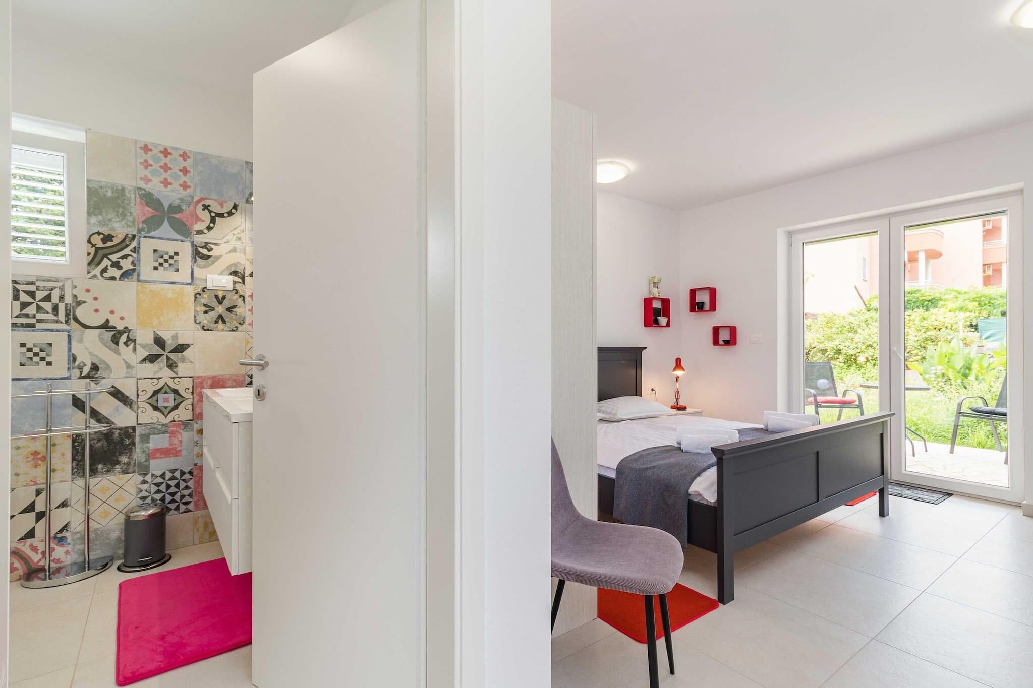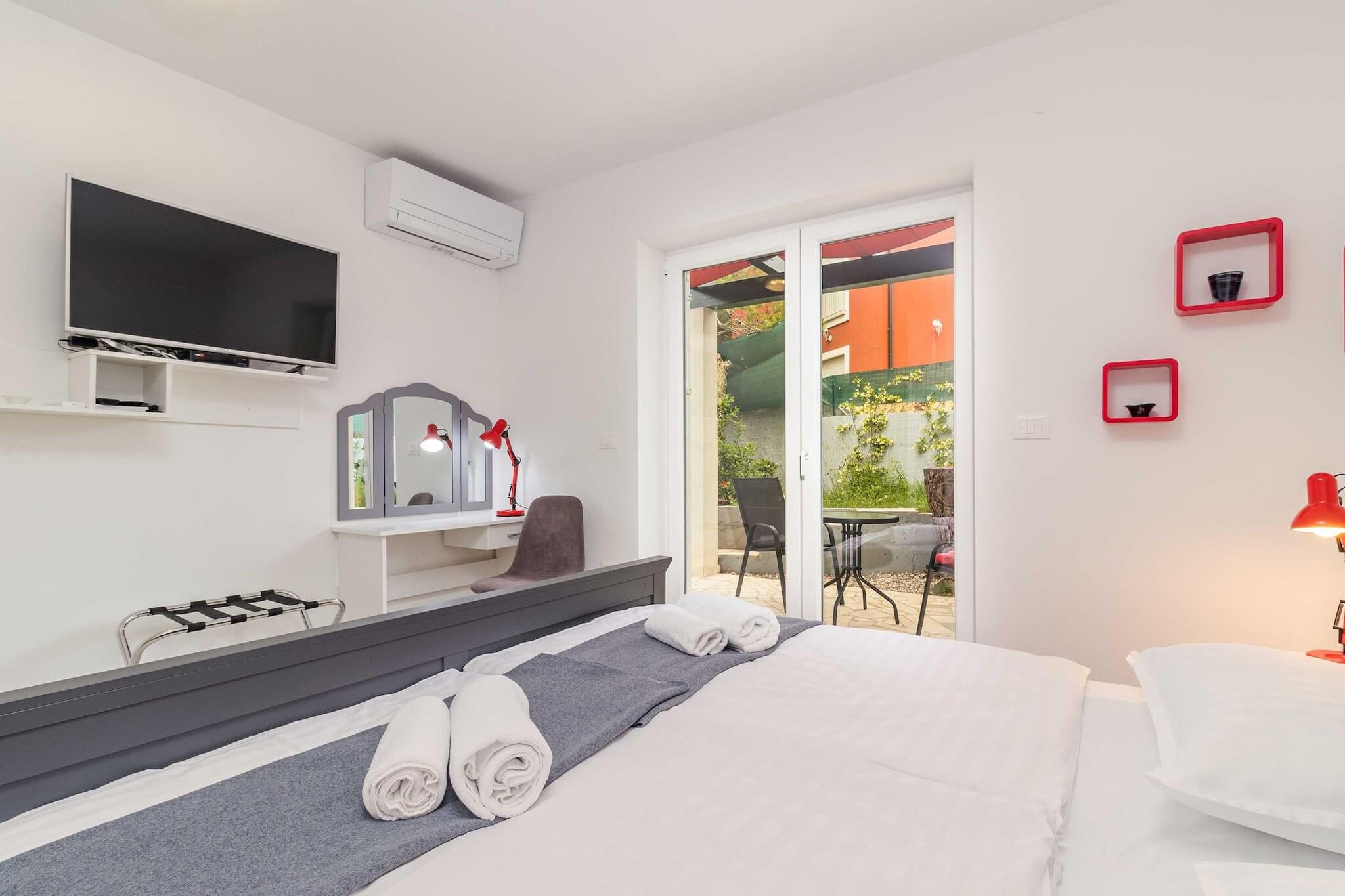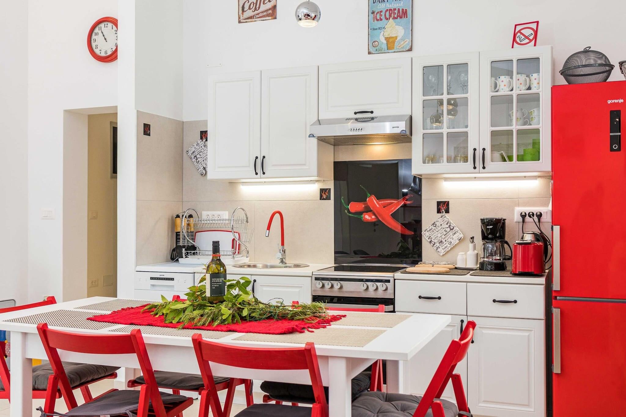 The villa in Premantura has 2 bedrooms and capacity for 6 persons (max. 4 adults). Accommodation of 100 m² homely and is fully-equiped, It has garden and swimming pool. The property is located 50 m city, 50 m from the restaurant, 200 m supermarket, 300 m bus station, 500 m rock beach "Munte", 11 km train station, 14 km airport and it is located in a a family-friendly zone and in the center of the city. The accommodation is equipped with the following items: garden, outdoor furniture, fenced plot, terrace, washing machine, barbecue, iron, internet (Wi-Fi), hair dryer, hot tub, air conditioning throughout the house, swimming pool private, open-air parking in the same building, 3 TVs, satellite tv (Languages: English). The open plan kitchen, of induction, is equipped with refrigerator, microwave, oven, freezer, dishwasher, dishes/cutlery, kitchen utensils, coffee machine, toaster, kettle, stove, kitchenware, plates and bowls.