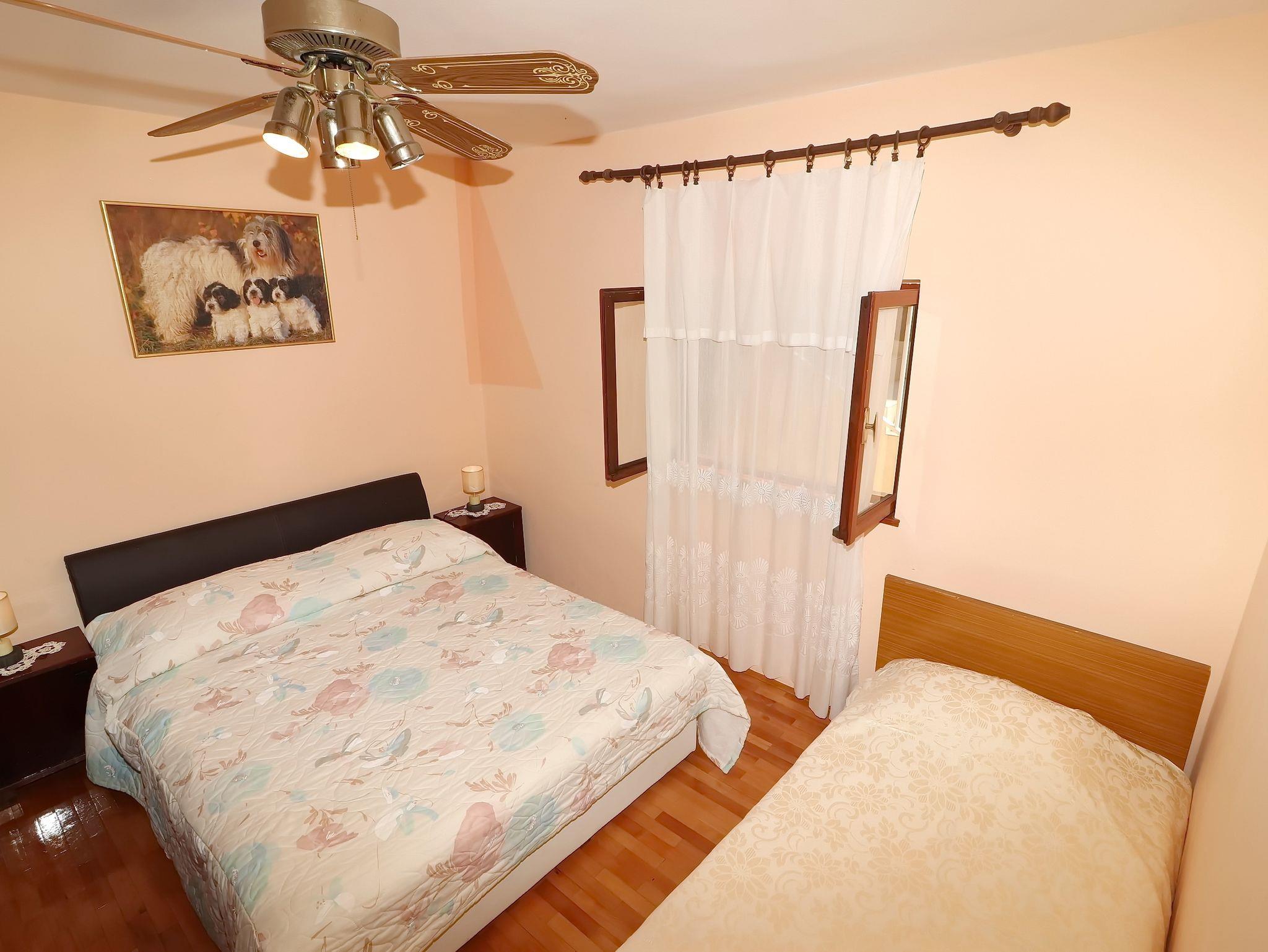 Ferienwohnung bietet Platz für 5 Gäste. Die Betten sind in Schlafzimmern, die es 2 gibt, innerhalb einer Gesamtfläche von 77m2, angeordnet. Die Gäste haben eine eigene Terrasse zur Verfügung, auf der sie in warmen Sommernächten genießen können. Das Apartment bietet Meerblick. Es ist erlaubt, Speisen auf dem Gemeinschafts-Grill vorzubereiten. IM PREIS INBEGRIFFEN: Kurtaxe, Endreinigung, Klimatisierung, Internet, Föhn. VERBINDLICHE ZUSÄTZLICHE KOSTEN: Aufzahlung für Kurzaufenthalte (prozentualer Zuschlag pro Nächtigungsanzahl: 30% - 1, 20% - 2, 10% - 3). Die Verfügbarkeit zusätzlicher Dienstleistungen in Ihrem reservierten Termin und die Preise derselben (falls nicht aufgeführt) müssen im Voraus überprüft werden. Zusätzliche Dienstleistungen die in der Zahlungsaufforderung nicht aufgeführt sind werden direkt beim Vermieter bezahlt, angenommen der Gast nutzt auch diese.