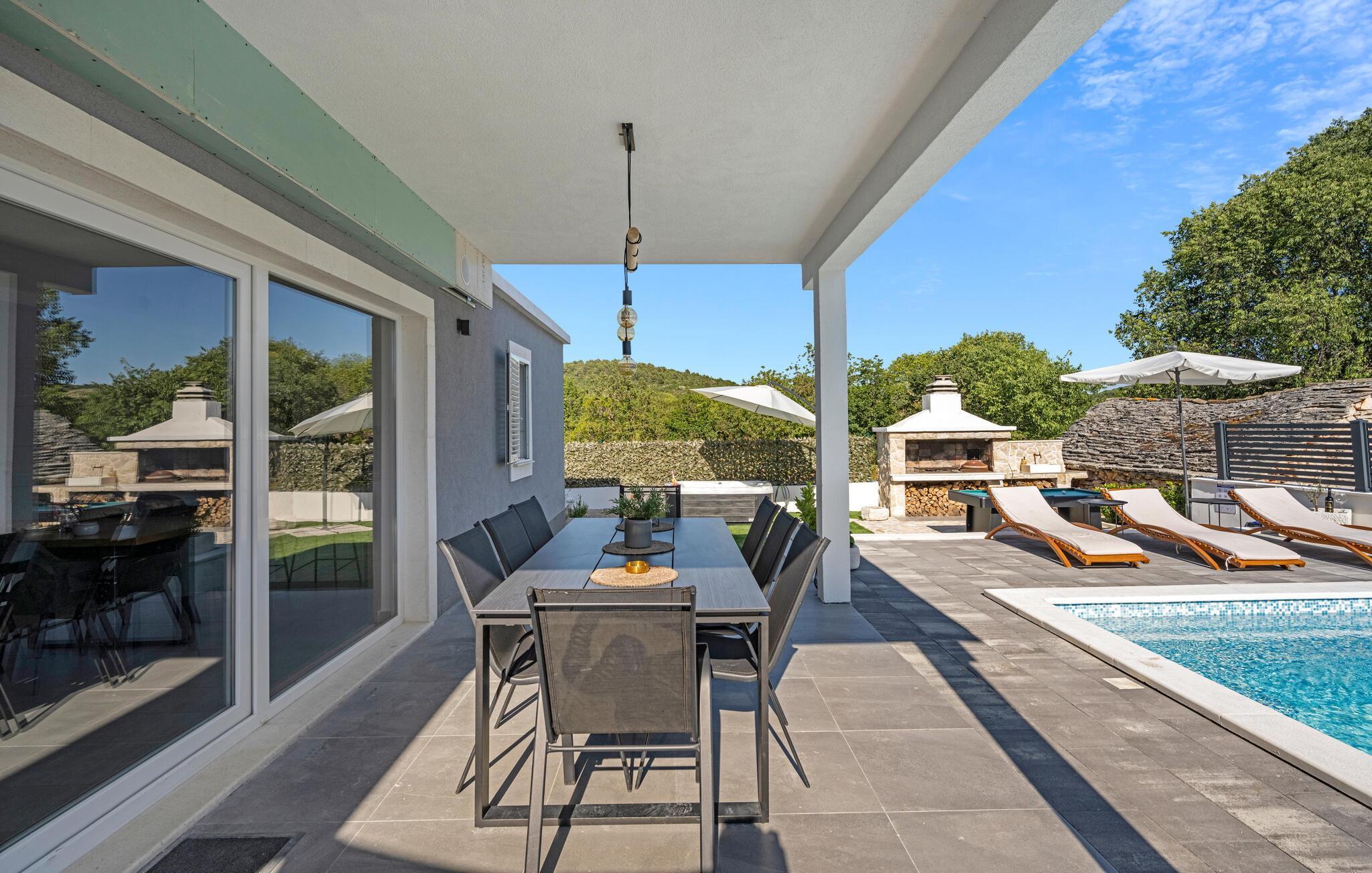 In ruhiger Lage auf dem Land, nur wenige Kilometer von Primosten entfernt, heißt Sie dieses moderne und geschmackvolle Ferienhaus willkommen. Hier können Sie zur Ruhe kommen und im einladenden Wohnraum zusammenkommen. An kühleren Tagen können Sie sich auf dem Sofa versammeln, ein Kaminfeuer genießen oder leckere Gerichte in der Küche zaubern.