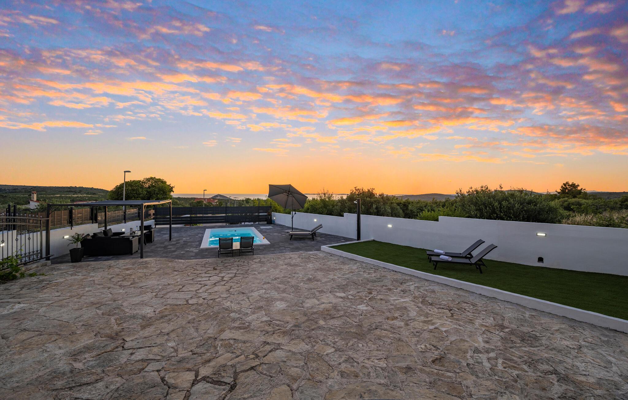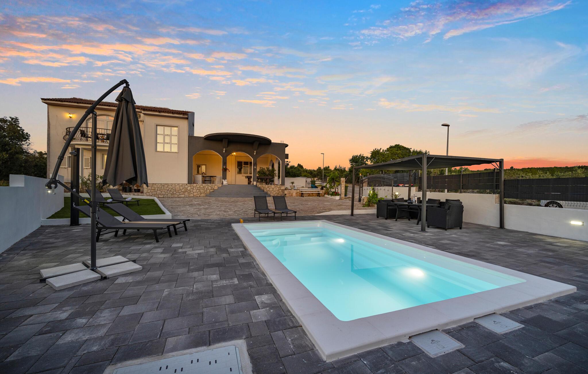 In diesem einladenden Ferienhaus in der Nähe von Primosten genießen Sie eine harmonische Kombination aus Ruhe und Komfort. Umgeben von üppigem Grün und mit einem herrlichen Meerblick bietet das Haus eine entspannende Atmosphäre. Gemeinsam mit Ihrer Großfamilie oder befreundeten Familien können Sie die Unterkunft mit zwei Wohneinheiten beziehen und sich rundum wohlfühlen. Die gelungene Mischung aus klassischer und moderner Einrichtung schafft ein behagliches Ambiente, in dem Sie sich sofort wohlfühlen werden. Ob beim Entspannen am Swimmingpool oder beim Spielen am Billardtisch im überdachten Außenbereich – hier finden Sie zahlreiche Möglichkeiten zur Unterhaltung. Auf dem Balkon können Sie in Ruhe ein Buch lesen und die atemberaubende Aussicht sowie Sonnenuntergänge genießen.