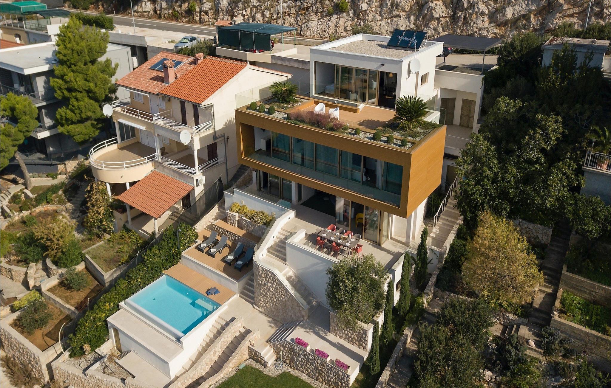Werfen Sie einen Blick in das modernisierte Interieur der sich auf drei Etagen erstreckenden Villa Gloss. Im Erdgeschoss der Villa finden Sie eine völlig ausgestattete Küche, einen Speisesaal, ein Badezimmer und ein geräumiges Wohnzimmer mit direktem Zugang zum Pool und die große Terasse, wo Sie Ihren ersten Kaffee am Morgen trinken und die Sonnenstrahlen genießen können. Auf der Außenterrasse gibt es einen Esstisch und Stühle, wo man gemeinsam essen und Mahlzeiten auf dem Grill vorbereiten kann. Im ersten Stock gibt es 4 Schlafzimmer mit Bad und einer großen Terrasse. Im letzten Stock gibt es ein Wohnzimmer mit Zugang zur Terrasse, Küche, Schlafzimmer und Toilette.