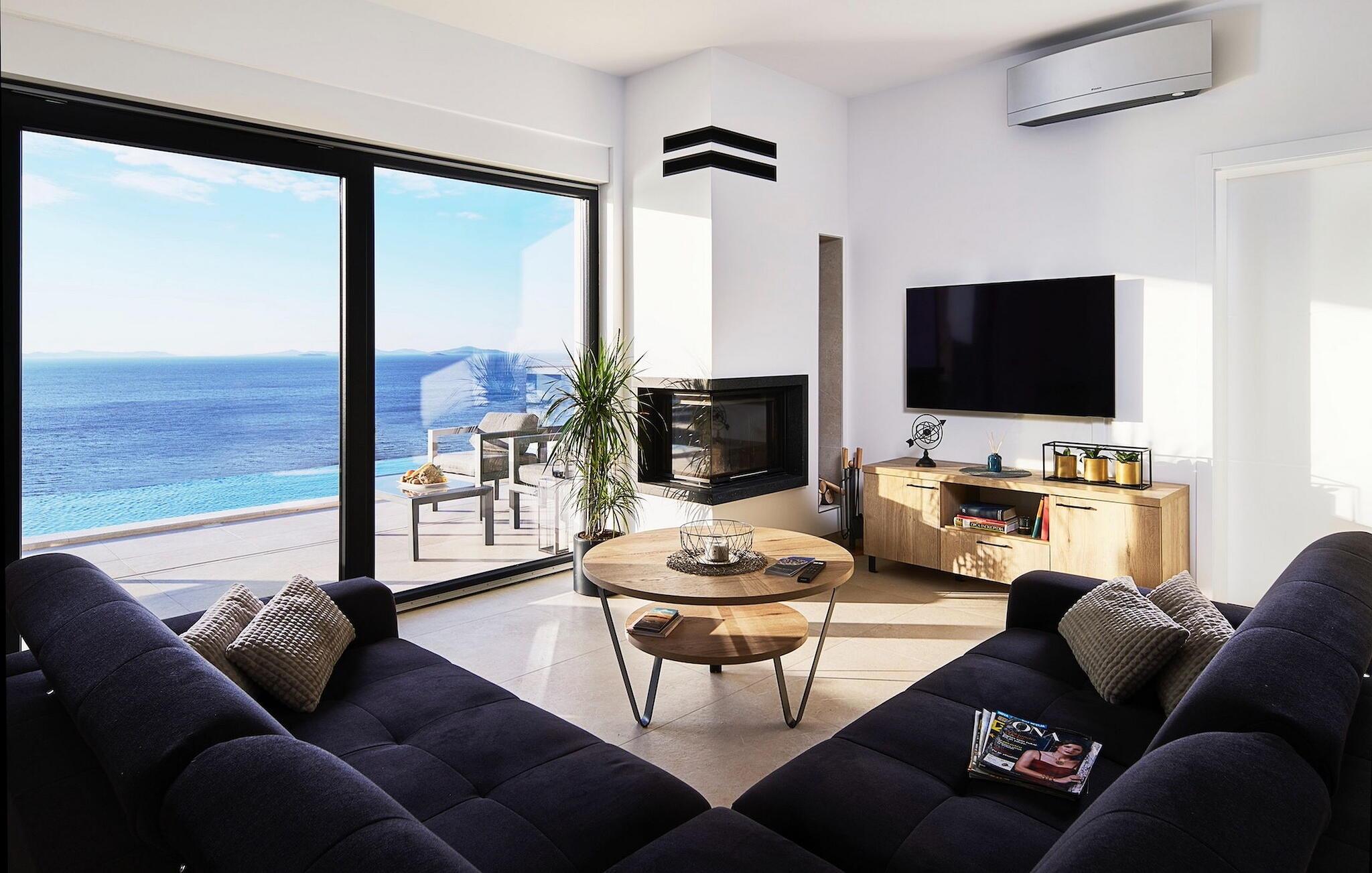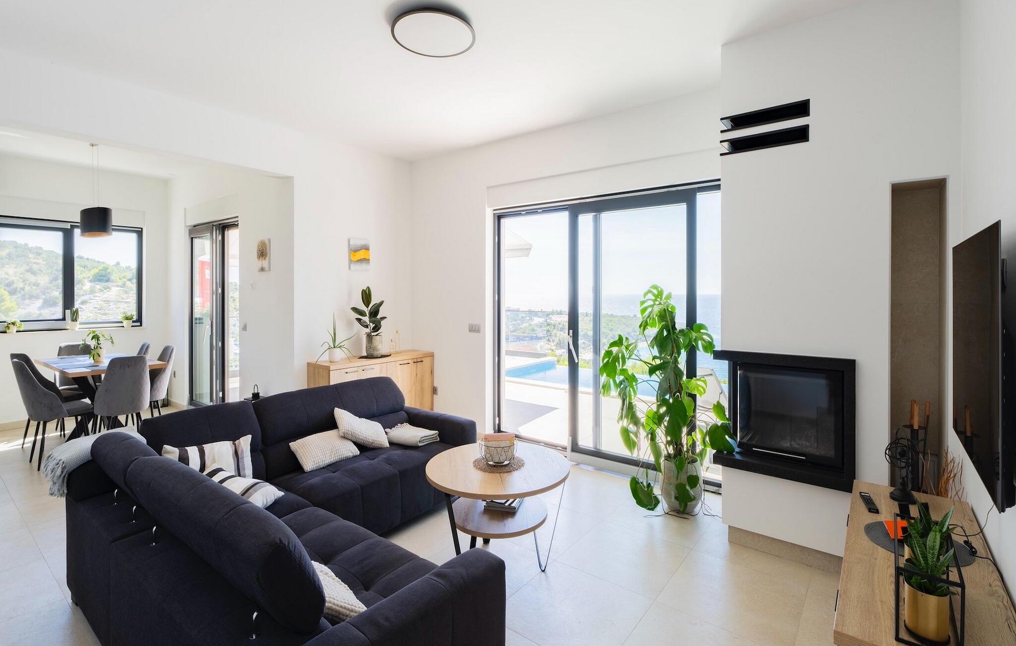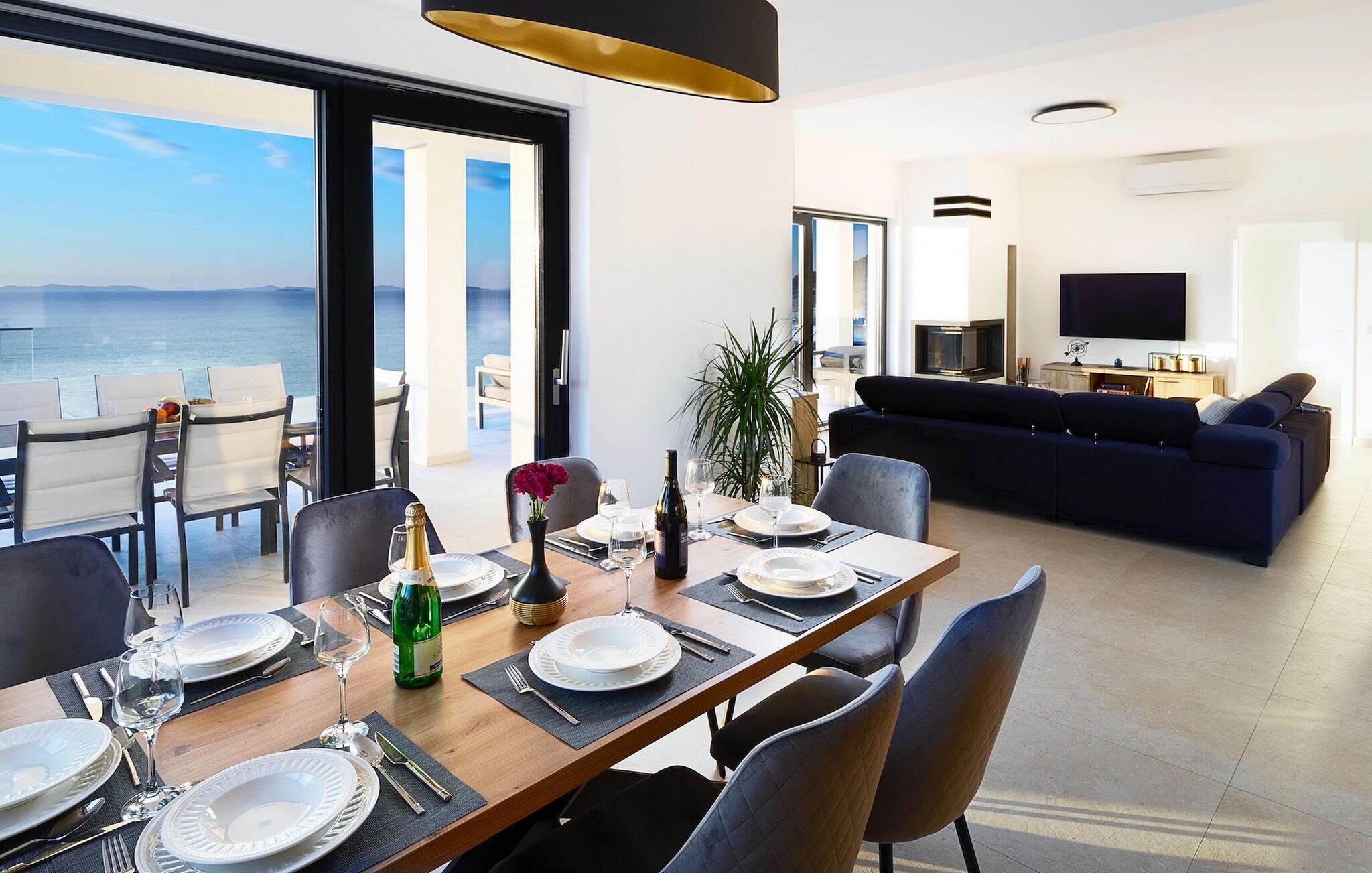 In der Villa finden Sie im Erdgeschoss neben einem gemütlichen Kamin eine Couch mit Blick auf die Glastür, durch die Sie den Sonnenuntergang über dem Meer betrachten können. Im selben Raum befindet sich eine voll ausgestattete Küche mit Tageslicht und ein weiteres Esszimmer für bis zu 8 Personen.