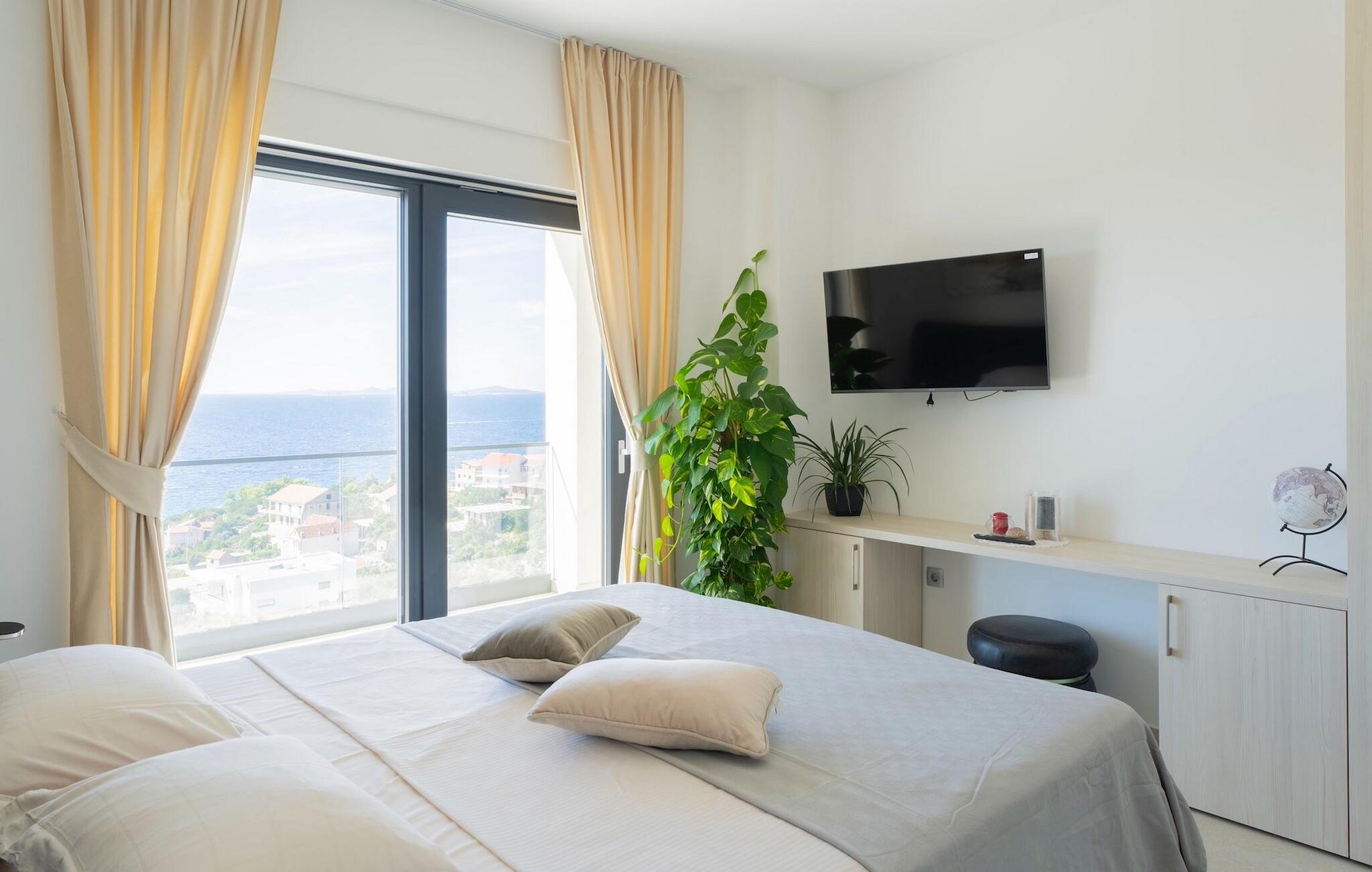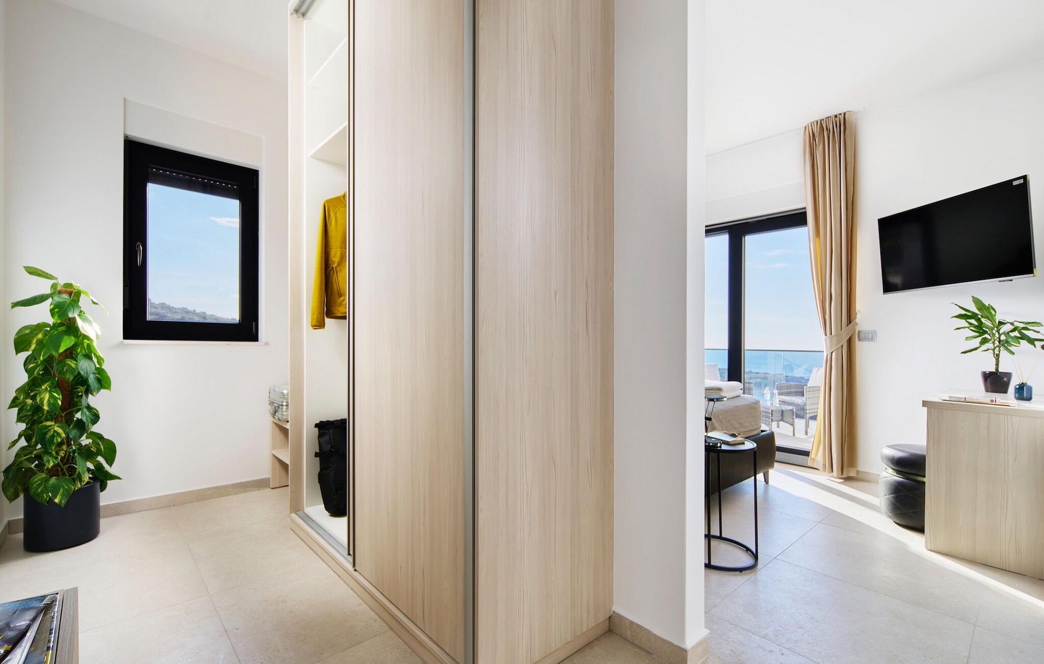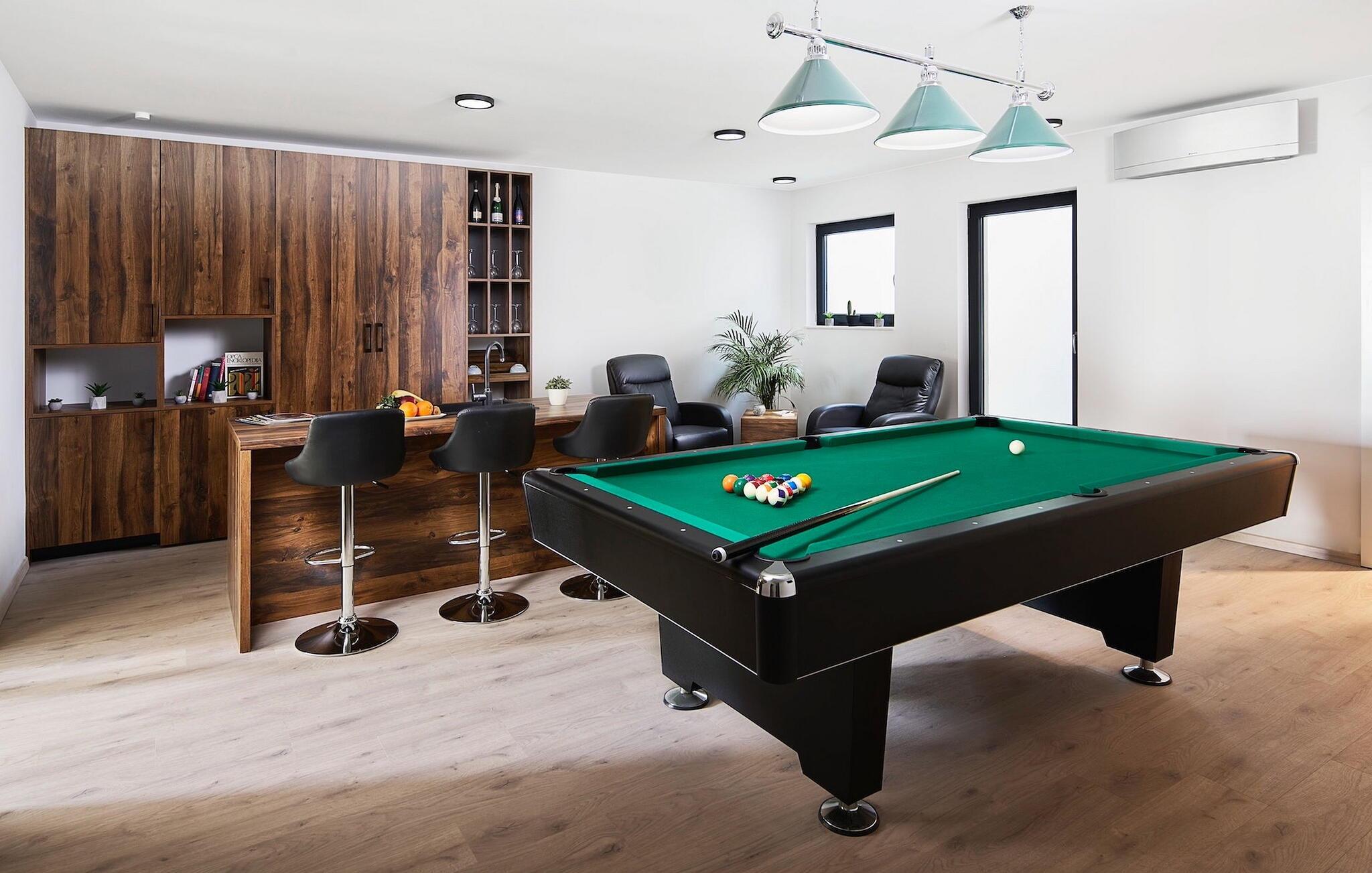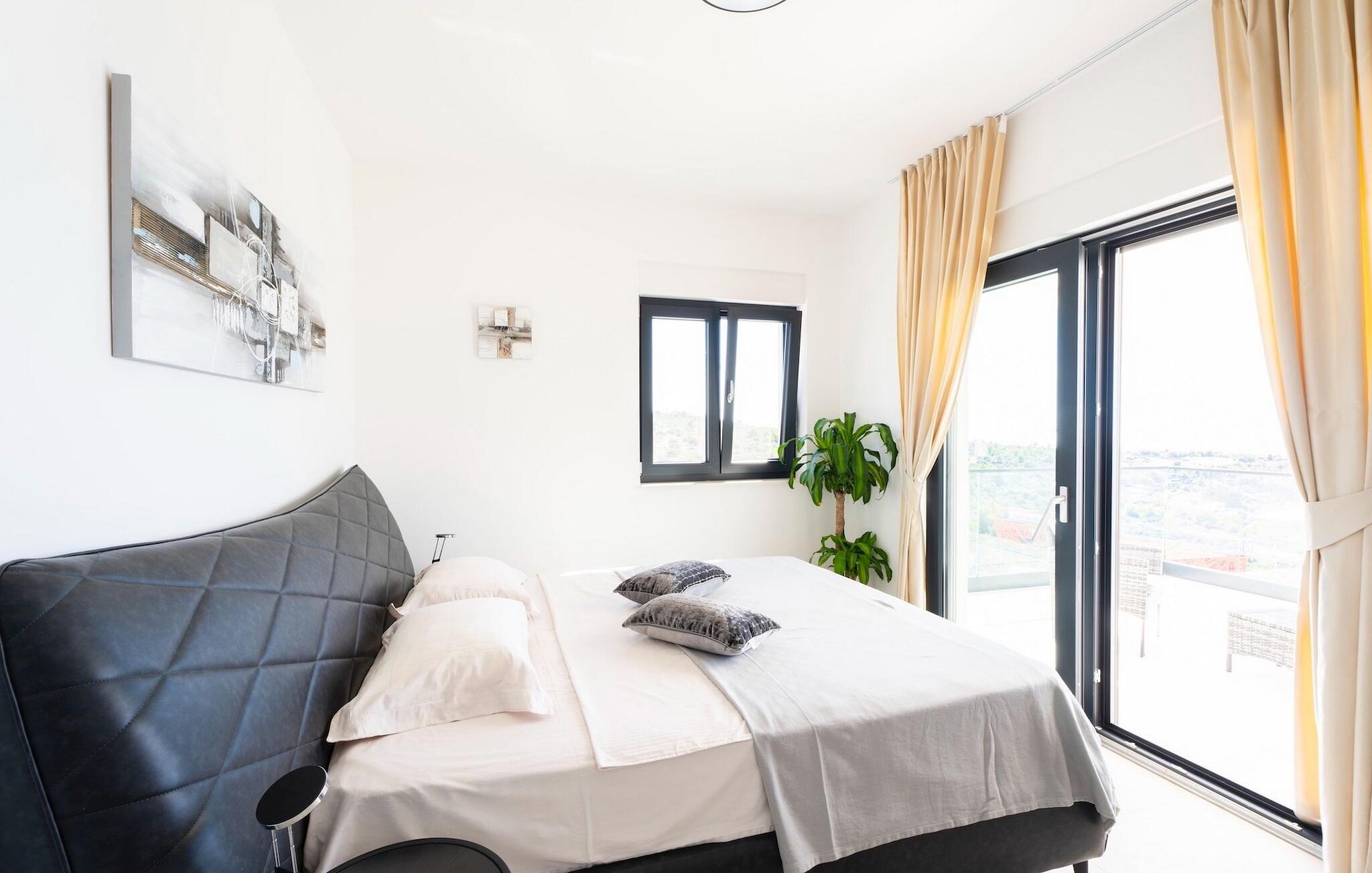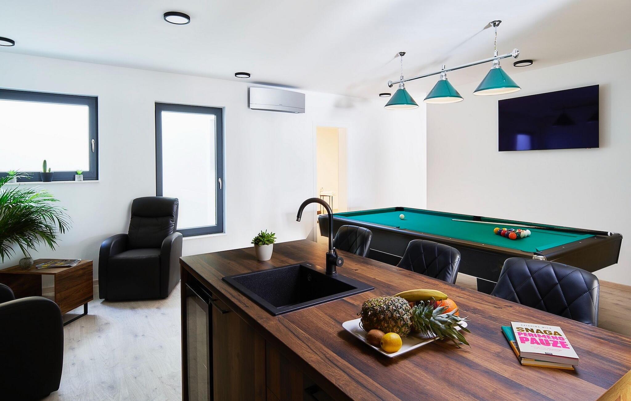 Zu der weiteren Ausstattung, die Sie erwarten können, gehören eine Sauna mit Whirlpool, ein Billardzimmer mit Bar und Fernseher und ein privater Fitnessbereich. Eines der komfortablen, elegant gestalteten Doppelzimmer befindet sich im Erdgeschoss, die anderen 3 befinden sich im Obergeschoss. Hier finden Sie einen großen Balkon, auf dem Sie Ihren Morgenkaffee mit Blick auf das schimmernde Meer genießen können.