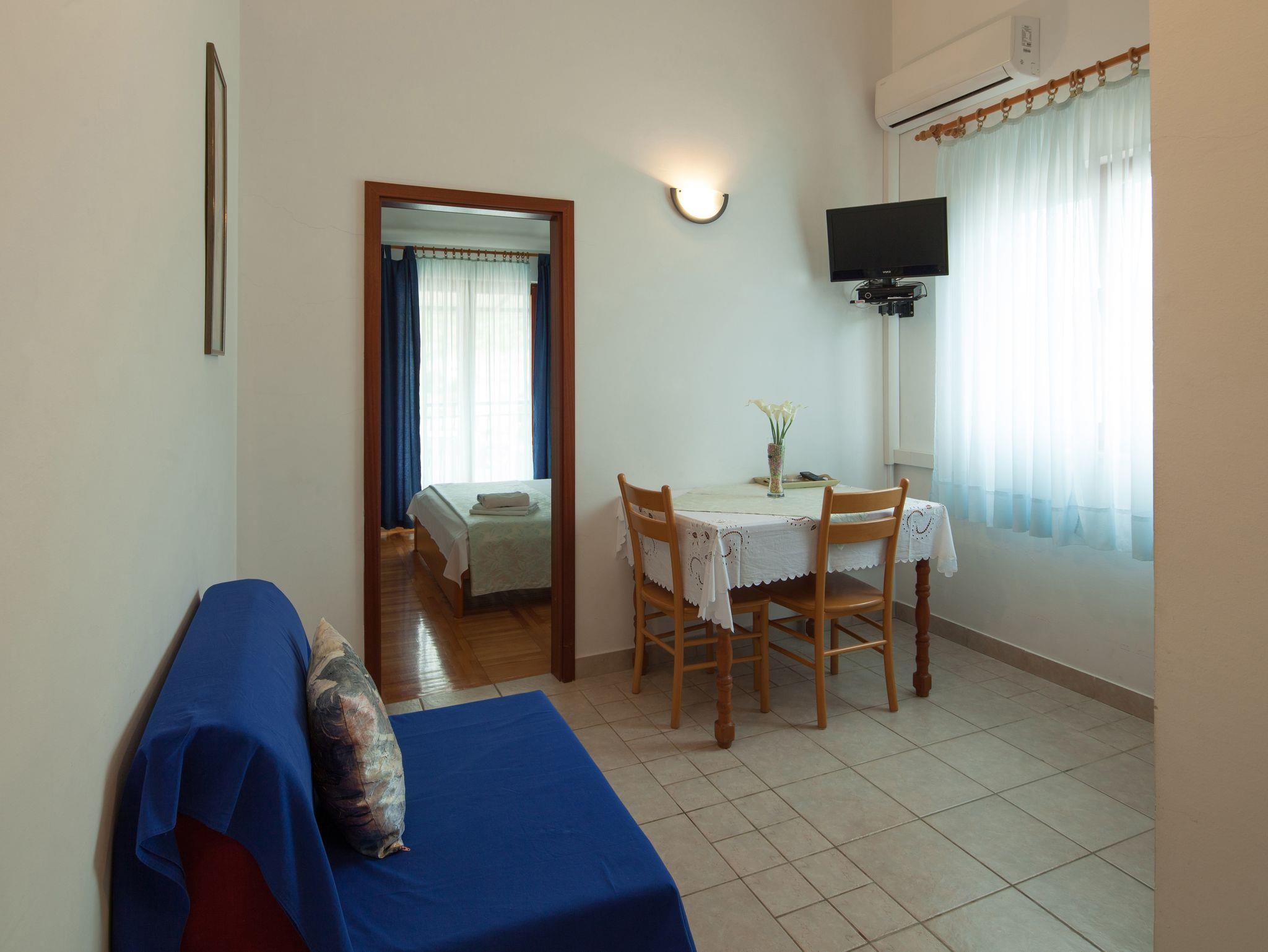 Ferienwohnung bietet Platz für 3 Gäste. Die Betten sind in Schlafzimmern, die es 1 gibt, und in Esszimmer, innerhalb einer Gesamtfläche von 26m2, angeordnet. Die Gäste haben eine eigene Terrasse zur Verfügung, auf der sie in warmen Sommernächten genießen können. Das Apartment bietet Meerblick. Es ist erlaubt, Speisen auf dem Gemeinschafts-Grill vorzubereiten. In der Unterkunftseinheit besteht die Möglichkeit des Mitbringens von Haustieren gegen Aufpreis. IM PREIS INBEGRIFFEN: Kurtaxe, Endreinigung, Parkplatz, Garage, Internet, Kinderbett, Bügeleisen, Bügelbrett, Föhn, Liegestühle. VERBINDLICHE ZUSÄTZLICHE KOSTEN: Aufzahlung für Kurzaufenthalte (prozentualer Zuschlag pro Nächtigungsanzahl: 30% - 1, 20% - 2, 10% - 3). UNVERBINDLICHE ZUSÄTZLICHE KOSTEN: Frühstück (10,00 €, 50% Nachlass für Kinder zwischen 4 und 12 Jahren, Kinder bis 4 Jahre sind frei.), Klimatisierung (7,00 € pro Nacht), Wäschewaschen (5,00 € Waschen), Haustiere (7,00 € pro Nacht). Die Verfügbarkeit zusätzlicher Dienstleistungen in Ihrem reservierten Termin und die Preise derselben (falls nicht aufgeführt) müssen im Voraus überprüft werden. Zusätzliche Dienstleistungen die in der Zahlungsaufforderung nicht aufgeführt sind werden direkt beim Vermieter bezahlt, angenommen der Gast nutzt auch diese.