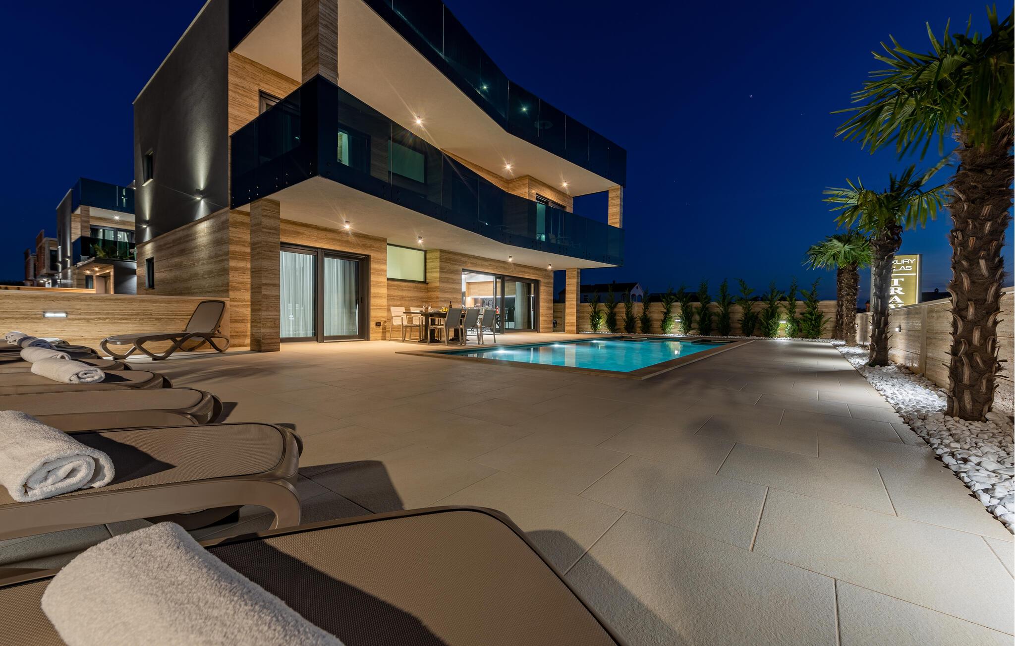 Genießen Sie herrliche Stunden im Außenbereich des Hauses, Sie haben die Wahl zwischen mehreren Terrassen. Nehmen Sie ein Sonnenbad im Liegestuhl, unterbrochen nur von einer kleinen Erfrischung im Pool, oder entspannen Sie genüsslich im Whirlpool und genießen Sie laue Sommerabende im Freien.