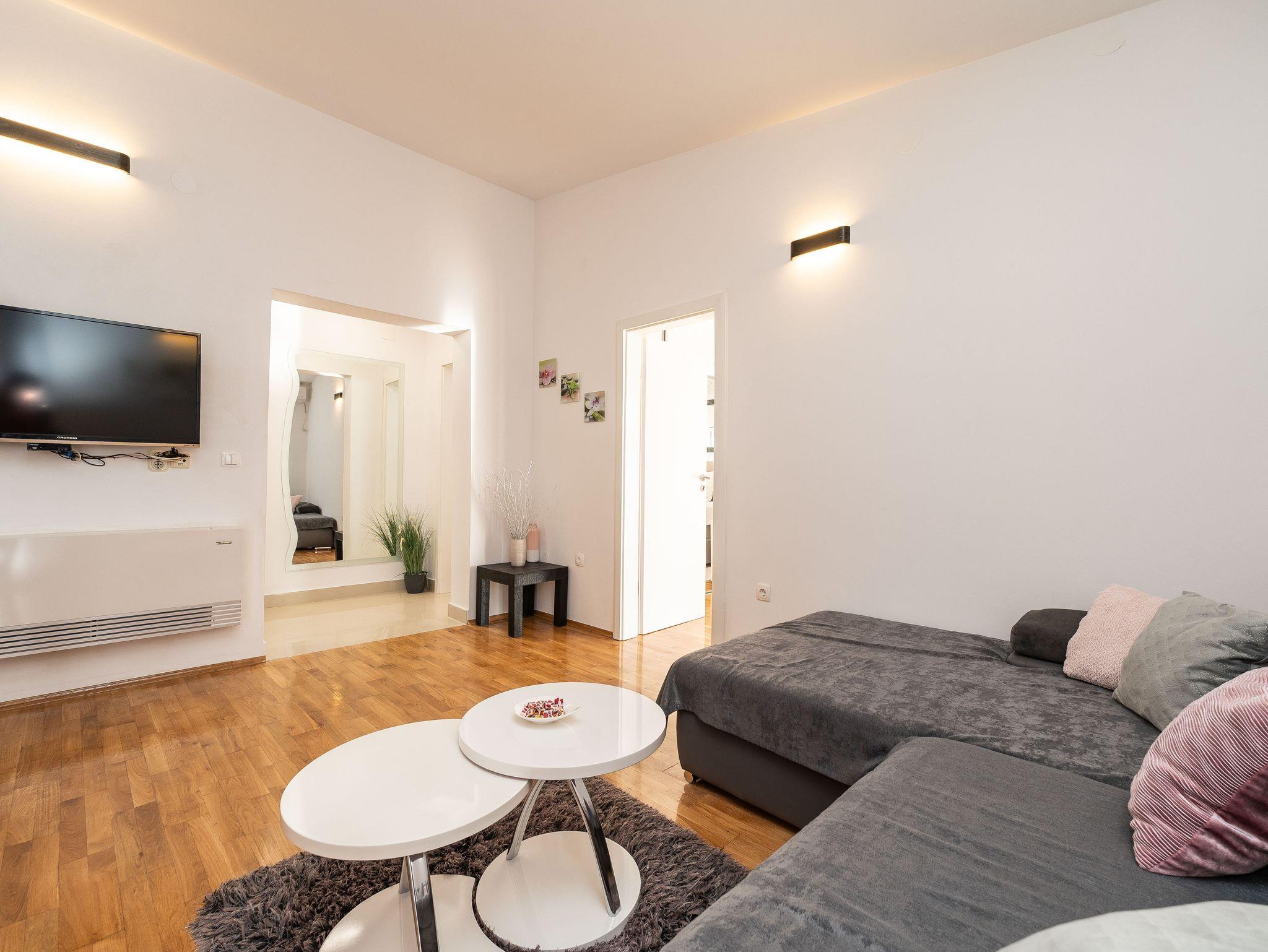 Ferienwohnung bietet Platz für 4 Gäste. Die Betten sind in Schlafzimmern, die es 2 gibt, innerhalb einer Gesamtfläche von 58m2, angeordnet. Die Gäste haben eine eigene Terrasse zur Verfügung, auf der sie in warmen Sommernächten genießen können. Das Apartment bietet Meerblick. Es ist erlaubt, Speisen auf dem Gemeinschafts-Grill vorzubereiten. IM PREIS INBEGRIFFEN: Kurtaxe, Endreinigung, Klimatisierung, Parkplatz, Internet, Kinderbett, Föhn. VERBINDLICHE ZUSÄTZLICHE KOSTEN: Aufzahlung für Kurzaufenthalte (prozentualer Zuschlag pro Nächtigungsanzahl: 30% - 1, 20% - 2, 10% - 3). Die Verfügbarkeit zusätzlicher Dienstleistungen in Ihrem reservierten Termin und die Preise derselben (falls nicht aufgeführt) müssen im Voraus überprüft werden. Zusätzliche Dienstleistungen die in der Zahlungsaufforderung nicht aufgeführt sind werden direkt beim Vermieter bezahlt, angenommen der Gast nutzt auch diese.
