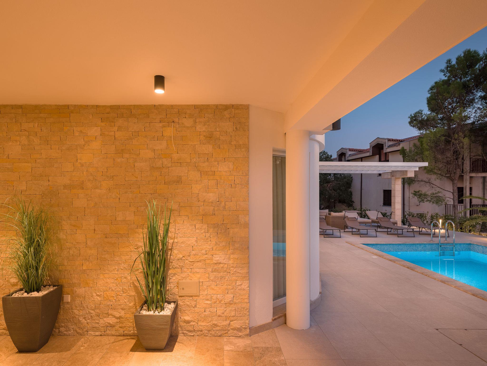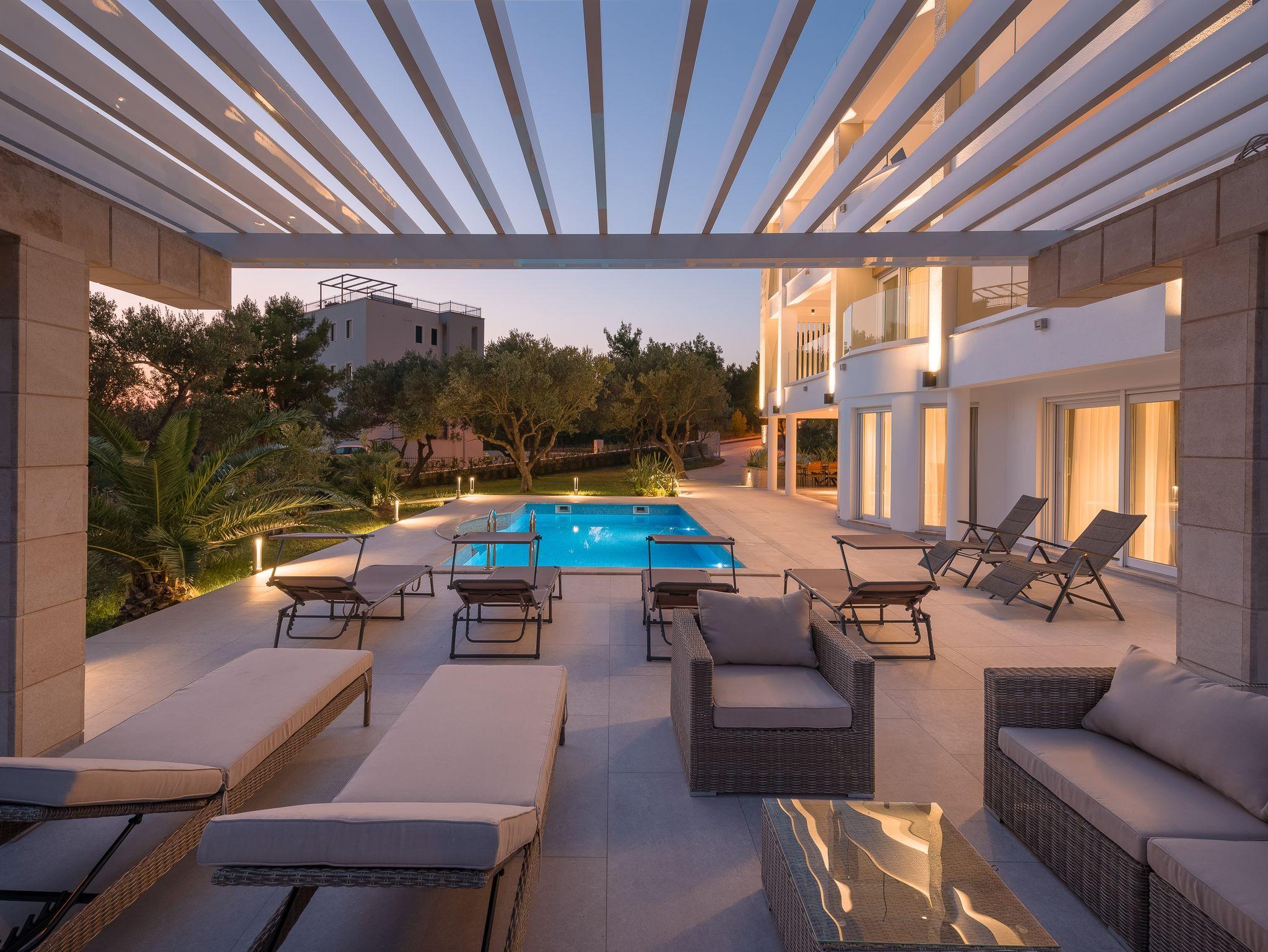 Hof (500m2, Kinderbereich, Sitzbereich), Parkplatz (Anzahl der Parkplätze: 5, Entfernung vom Objekt: im Hof), Pool: gemeinsam, Dimensionen: 8m x 4.3m x 1.5m, Wassertyp: Süßwasser, Heizung: Ja, Grill: gemeinsam, WiFi Internet, Föhn, Bügeleisen, Bügelbrett, Kinderbett