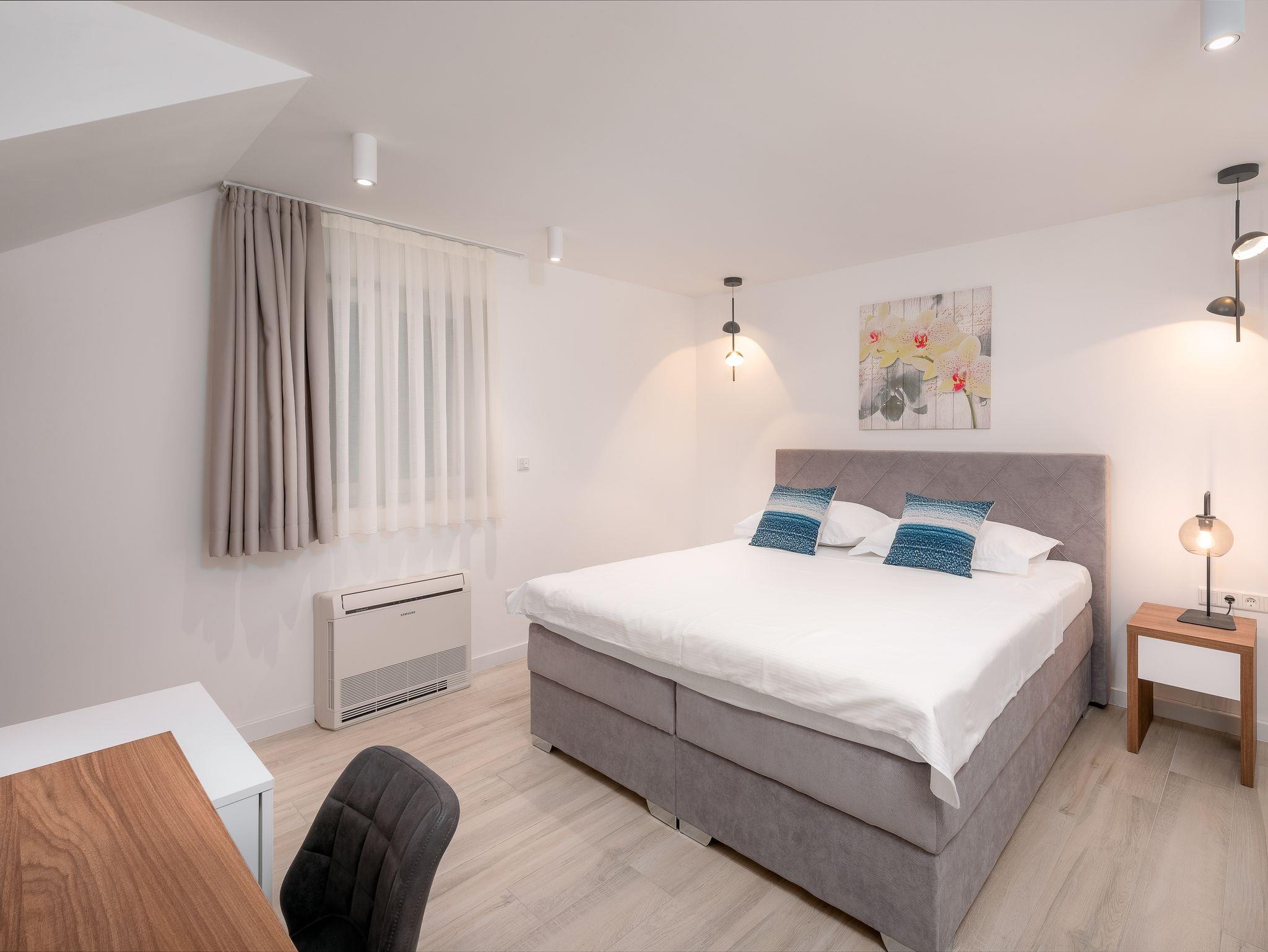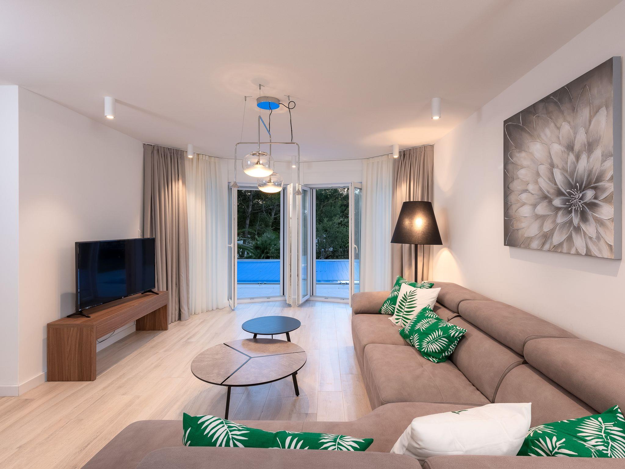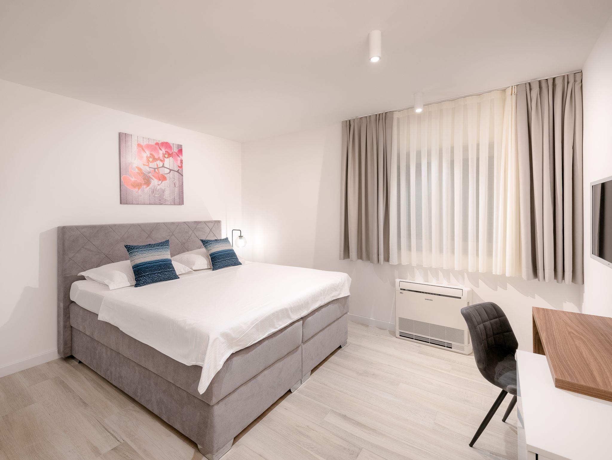 Ferienwohnung bietet Platz für 8 Gäste. Die Betten sind in Schlafzimmern, die es 3 gibt, und in Wohnzimmer, innerhalb einer Gesamtfläche von 84m2, angeordnet. Es ist erlaubt, Speisen auf dem Gemeinschafts-Grill vorzubereiten. Während ihres Aufenthalts können Gäste das gemeinsam zur Nutzung stehende Schwimmbad benutzen. Die reservierte Unterkunftseinheit hat keinen Balkon und keine Terrasse. IM PREIS INBEGRIFFEN: Kurtaxe, Endreinigung, Klimatisierung, Pool, Parkplatz, Internet, Kinderbett, Bügeleisen, Bügelbrett, Föhn. Die Verfügbarkeit zusätzlicher Dienstleistungen in Ihrem reservierten Termin und die Preise derselben (falls nicht aufgeführt) müssen im Voraus überprüft werden. Zusätzliche Dienstleistungen die in der Zahlungsaufforderung nicht aufgeführt sind werden direkt beim Vermieter bezahlt, angenommen der Gast nutzt auch diese.
