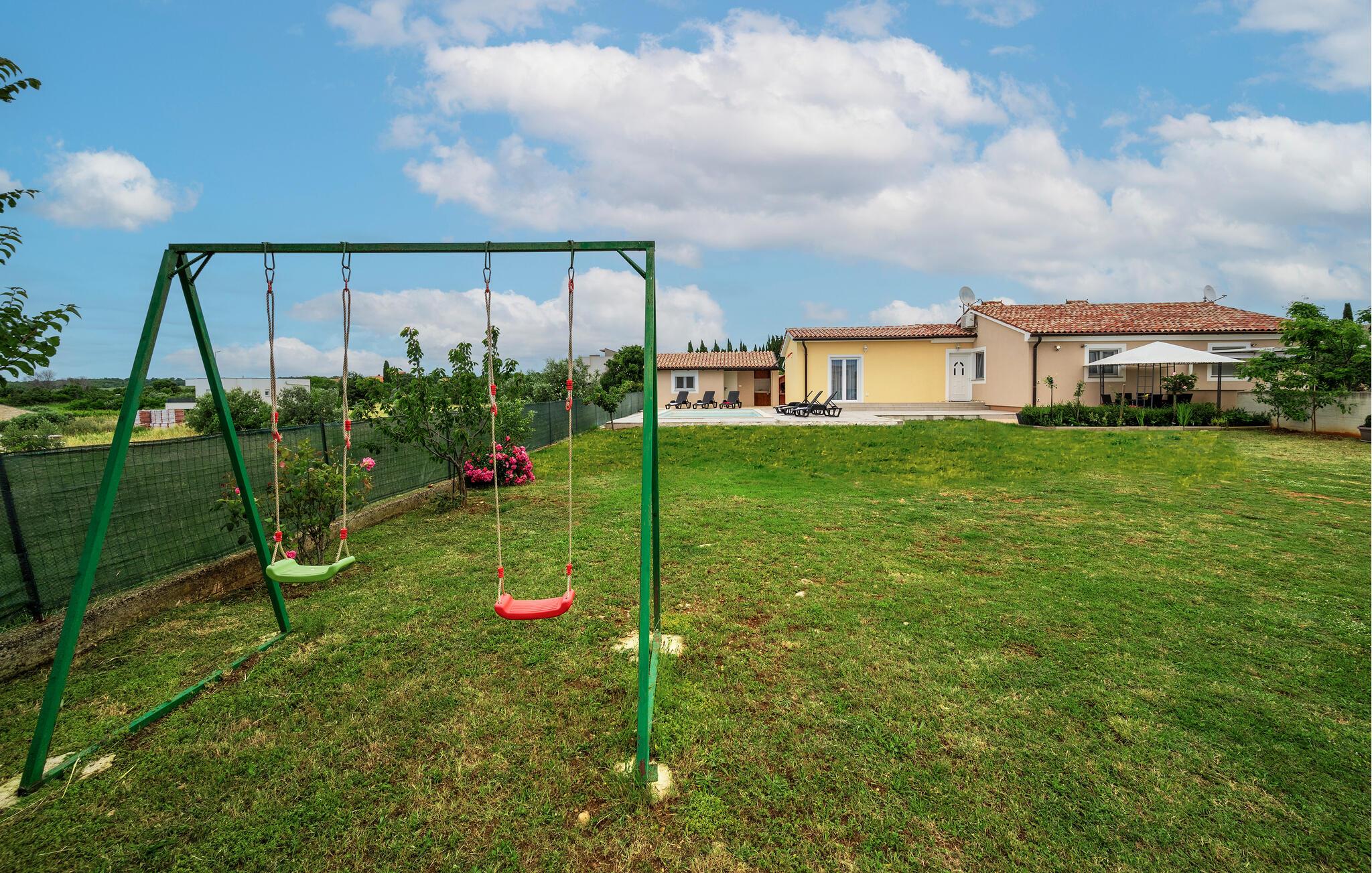Der große Garten bietet viel Platz zum Spielen und draußen sein. Während Sie auf einer der Terrassen entspannen, können die Kinder und das Haustier im Garten spielen und die Schaukel, das Trampolin und die Fußballtore nutzen. Lassen Sie den Tag mit einem Abendessen vom Grill ausklingen.