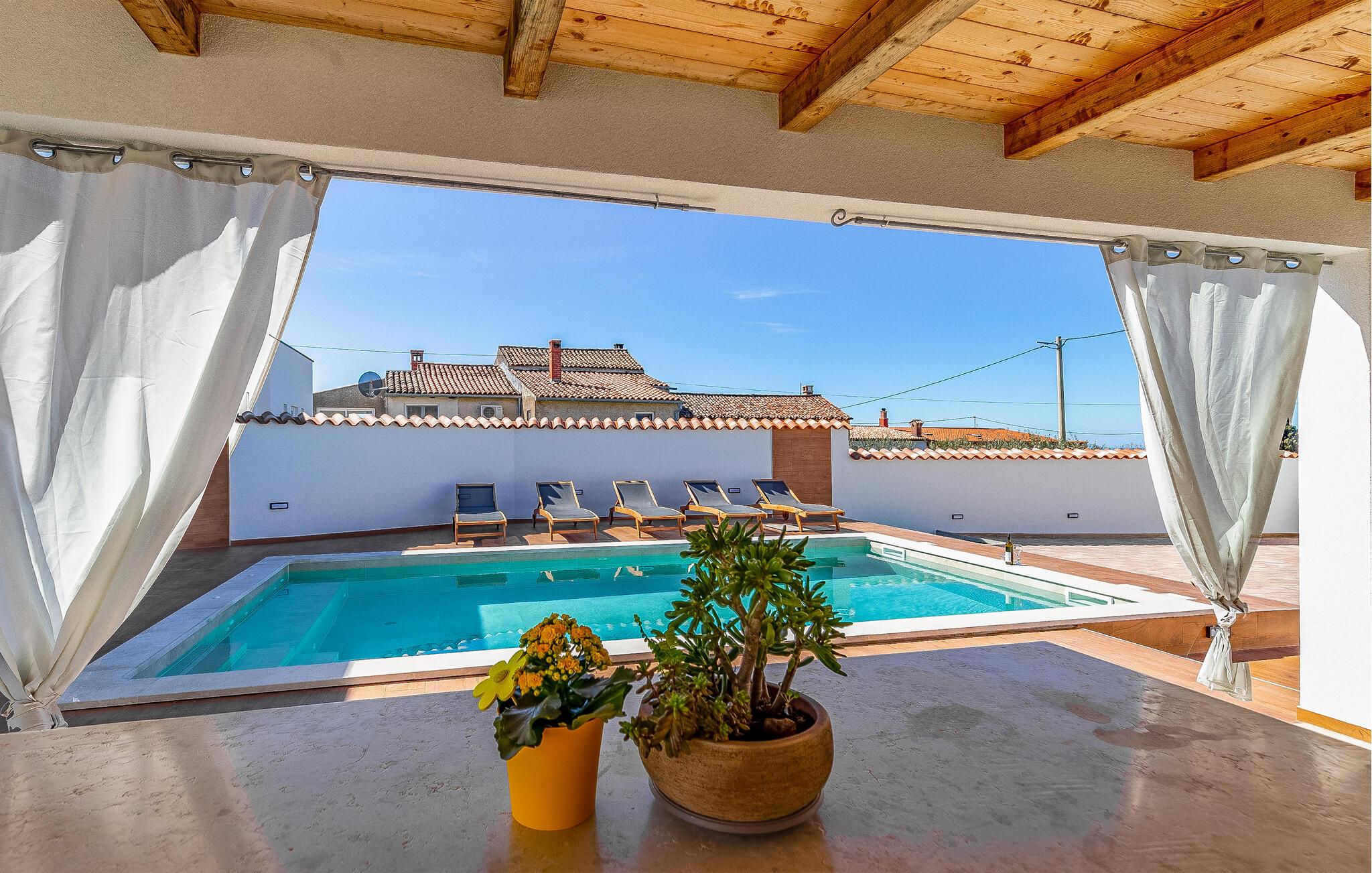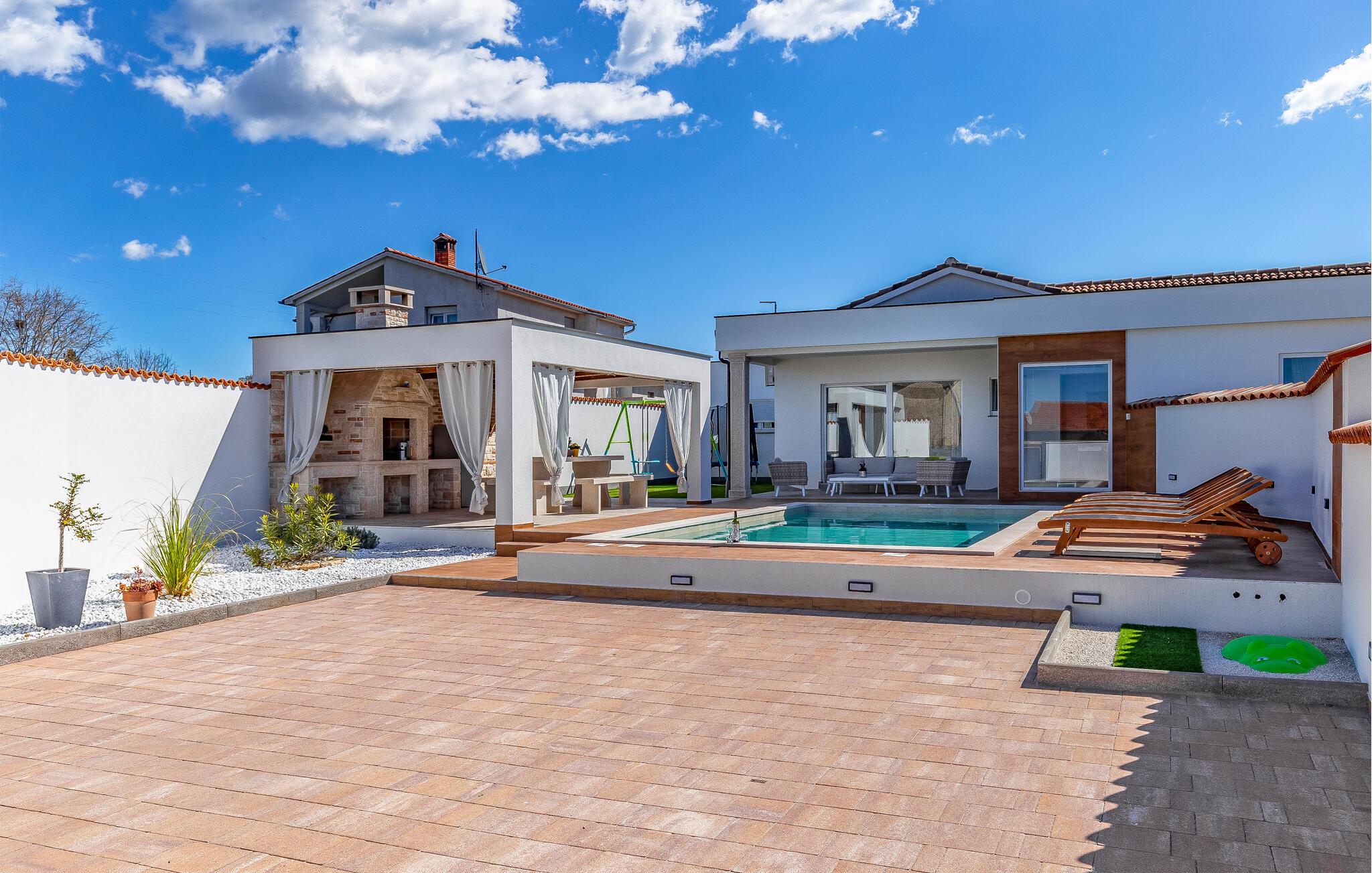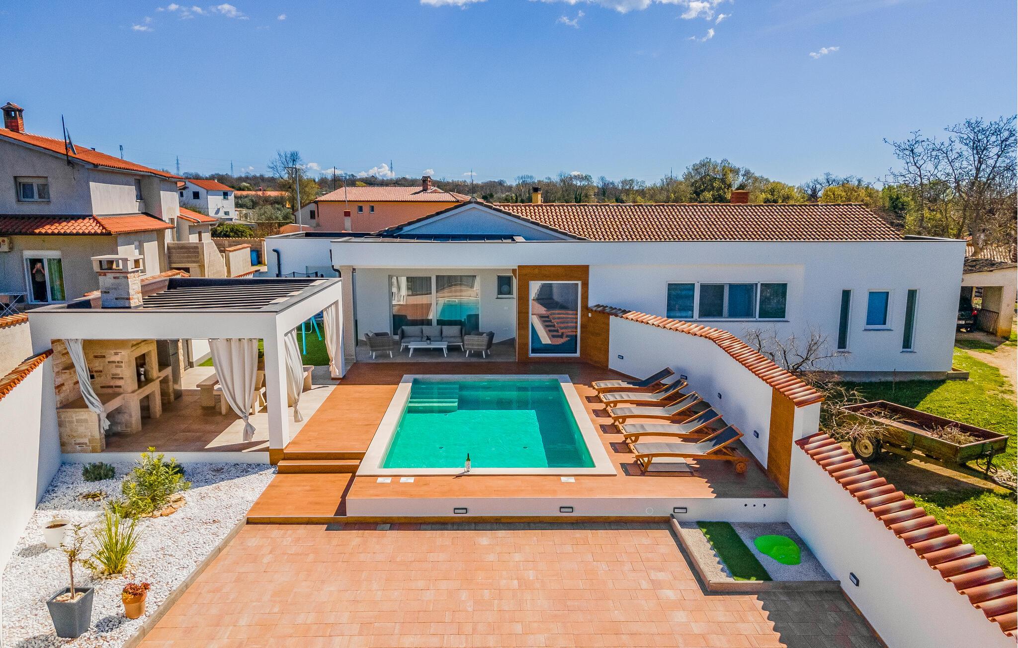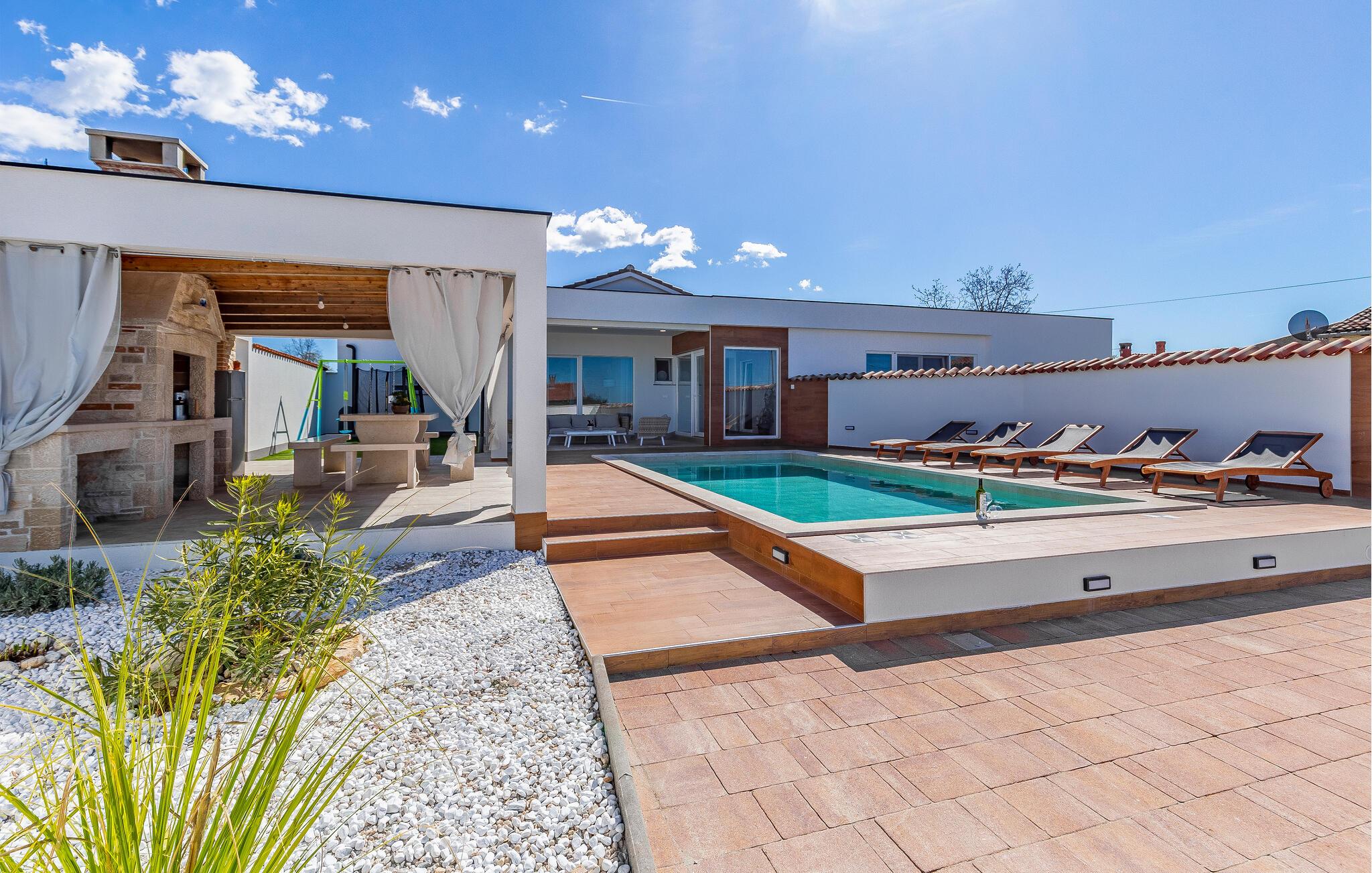 Nur wenige Kilometer nördlich von Pula gelegen, empfängt Sie dieses elegante Ferienhaus zu einem wundervollen Istrien-Urlaub. Genießen Sie das helle Ambiente, während Sie morgens das Familienfrühstück in der offenen Küche zubereiten und sich anschließend am Esstisch angeregt über die Pläne des Tages unterhalten. Später am Tag können Sie in der Küche gemeinsam kochen und dabei vielleicht auch regionale Zutaten zur Verwendung kommen lassen. Der Außenbereich bietet umfassende Möglichkeiten mit verschiedenen Bereichen zum Entspannen und Spielen. Unter der überdachten Terrasse lässt es sich gut grillen, während die Kinder auf dem Spielplatz nebenan toben können. Tauchen Sie ein in den Pool, der Abkühlung sowie Wasserspaß pur verspricht.