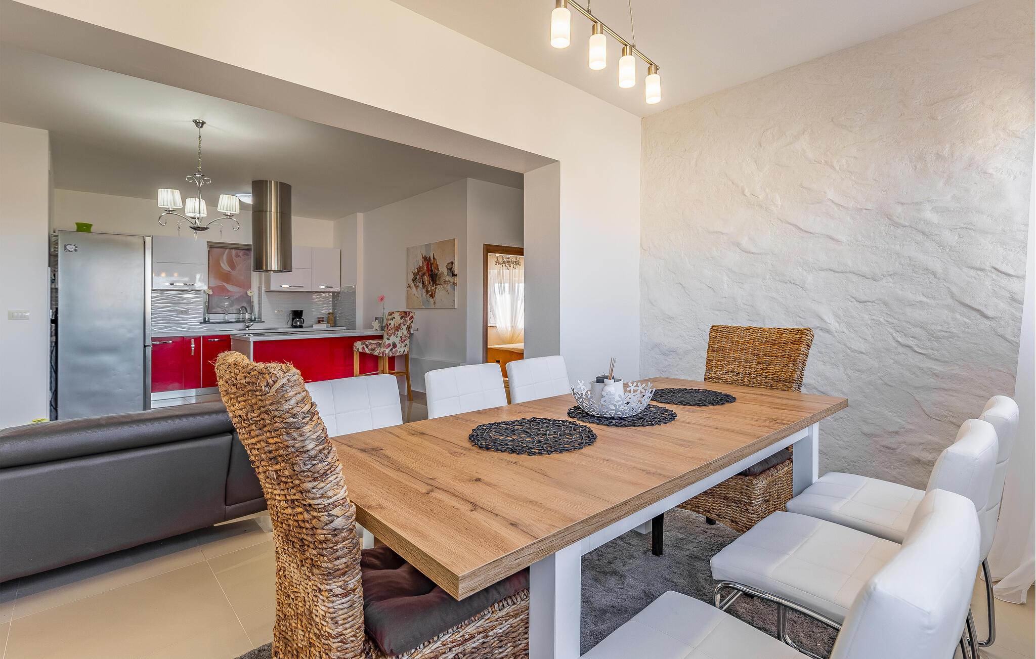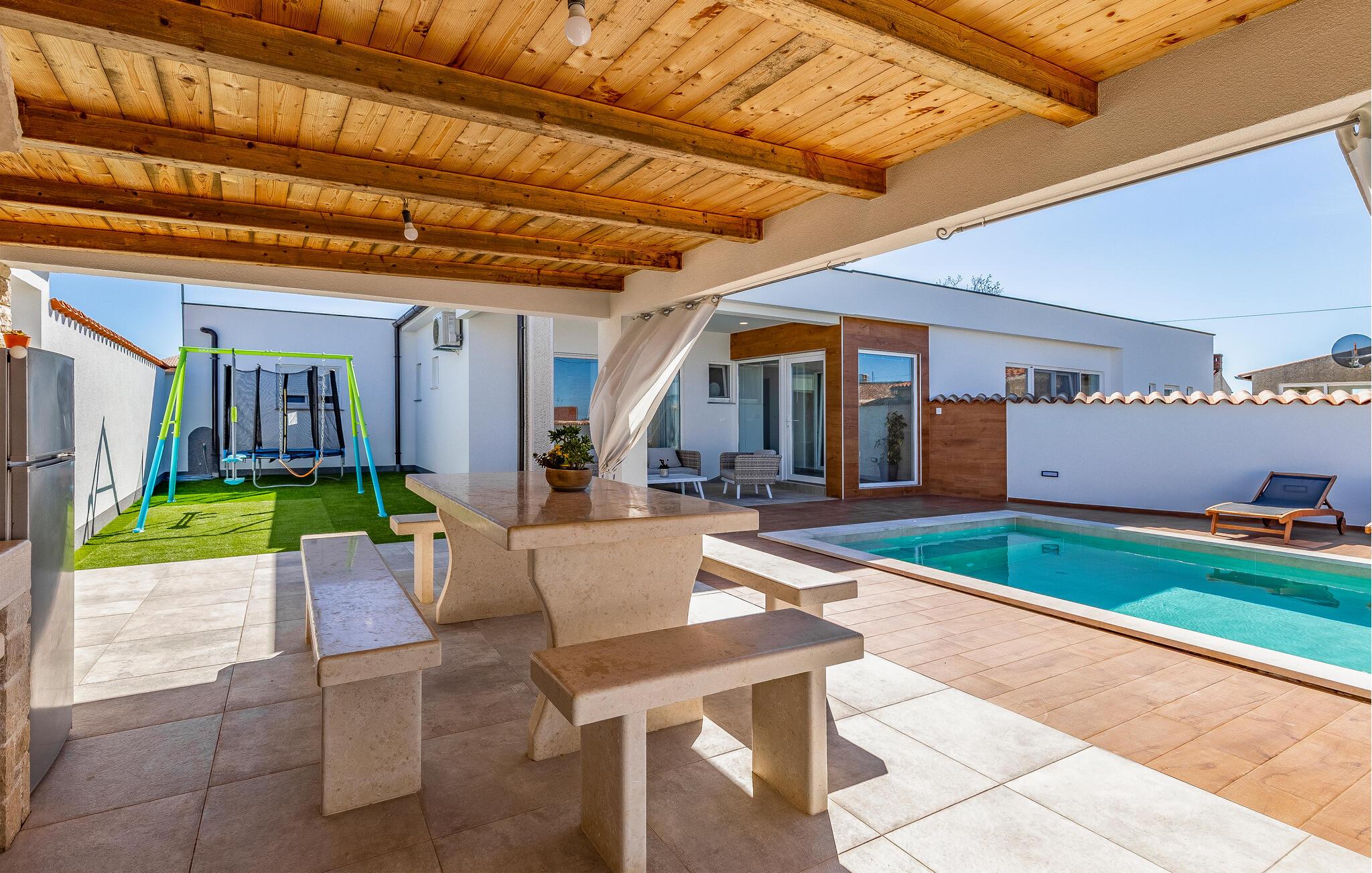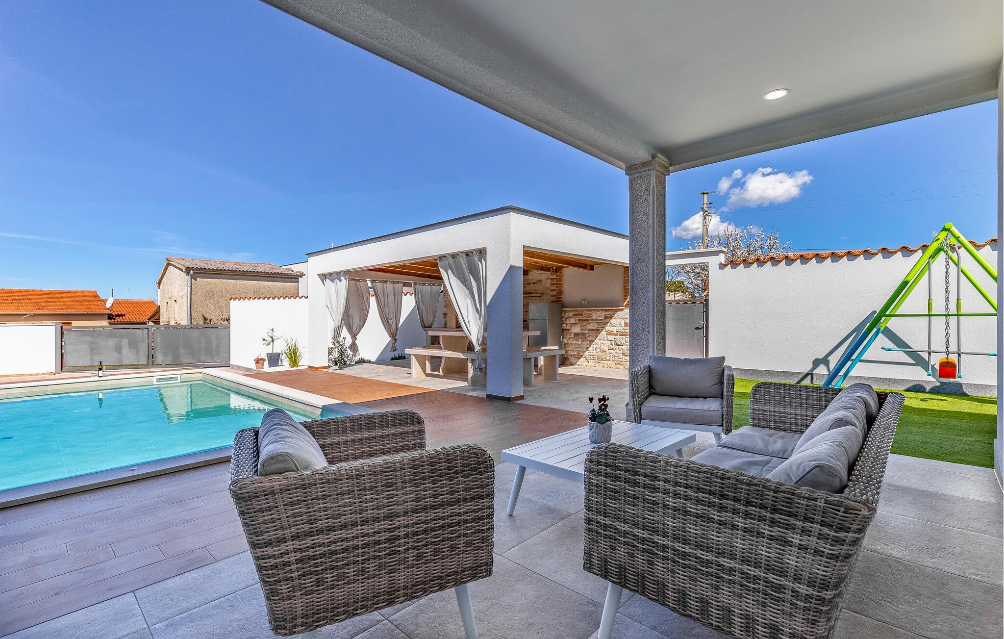 Nur wenige Kilometer nördlich von Pula gelegen, empfängt Sie dieses elegante Ferienhaus zu einem wundervollen Istrien-Urlaub. Genießen Sie das helle Ambiente, während Sie morgens das Familienfrühstück in der offenen Küche zubereiten und sich anschließend am Esstisch angeregt über die Pläne des Tages unterhalten. Später am Tag können Sie in der Küche gemeinsam kochen und dabei vielleicht auch regionale Zutaten zur Verwendung kommen lassen. Der Außenbereich bietet umfassende Möglichkeiten mit verschiedenen Bereichen zum Entspannen und Spielen. Unter der überdachten Terrasse lässt es sich gut grillen, während die Kinder auf dem Spielplatz nebenan toben können. Tauchen Sie ein in den Pool, der Abkühlung sowie Wasserspaß pur verspricht.