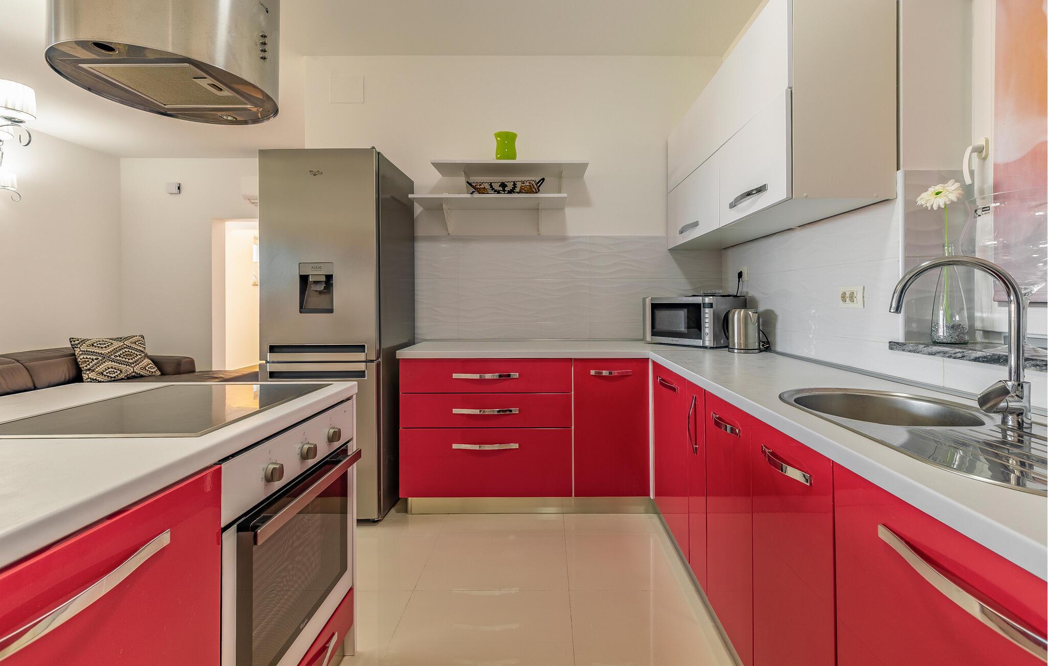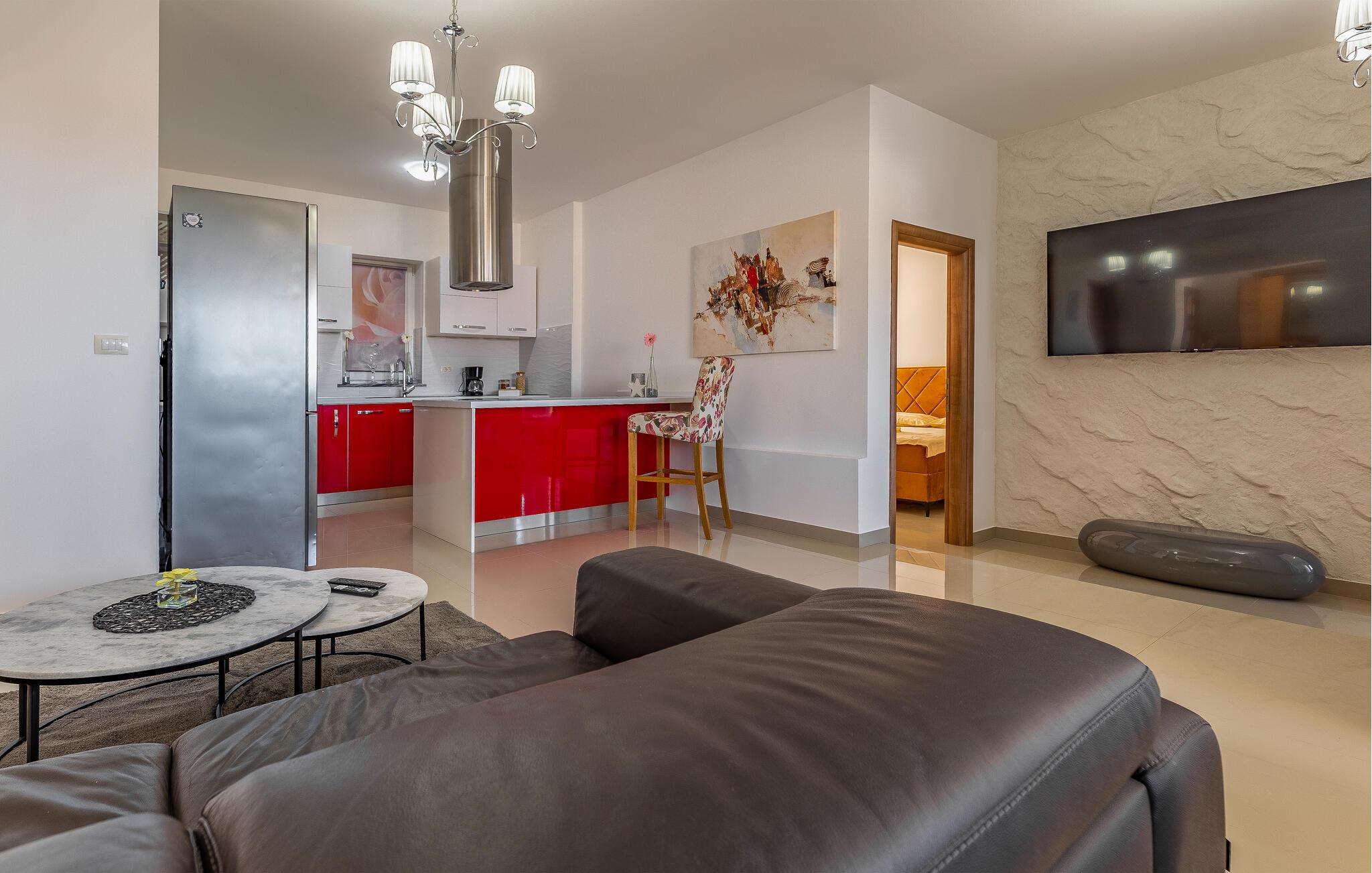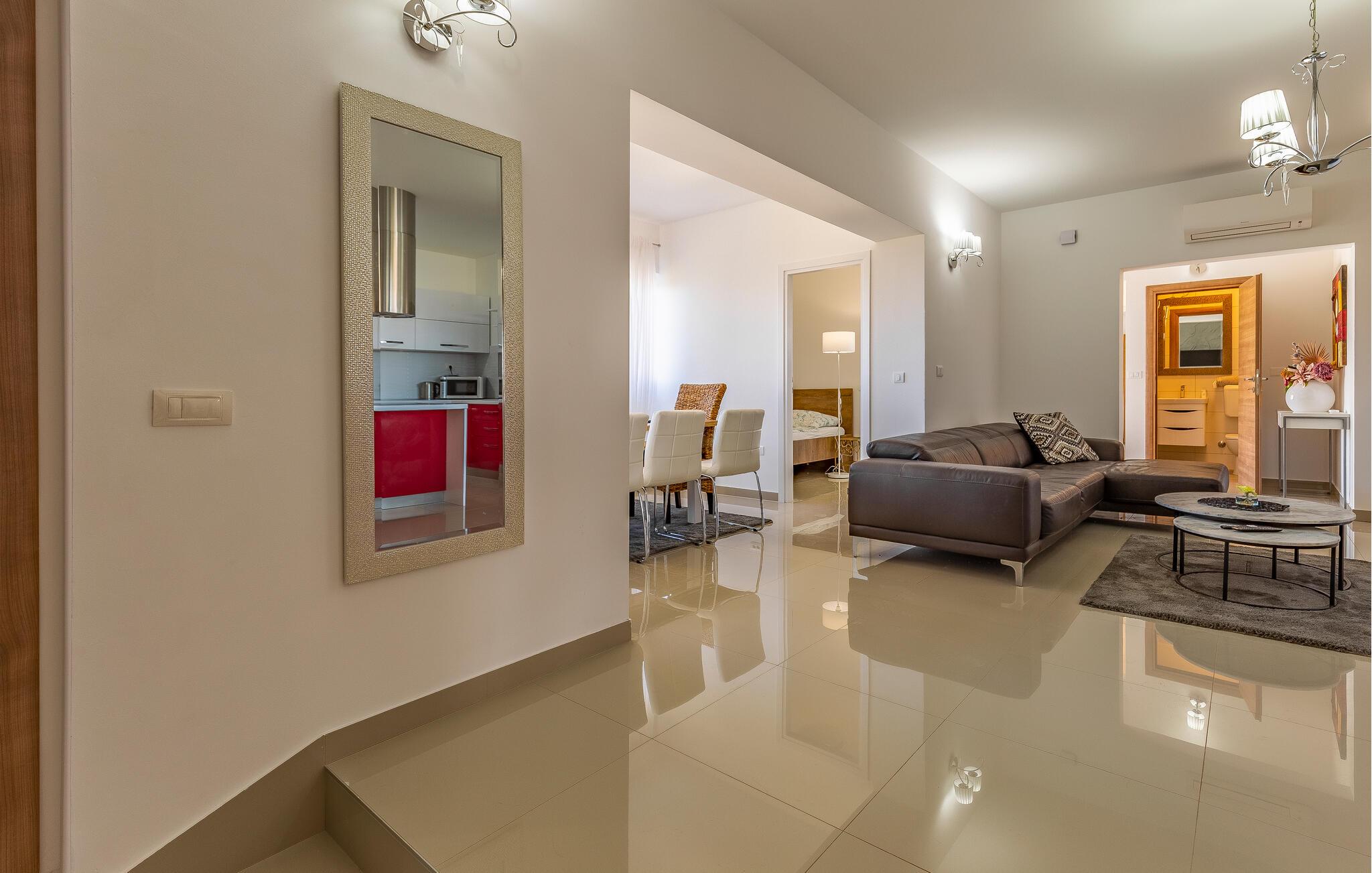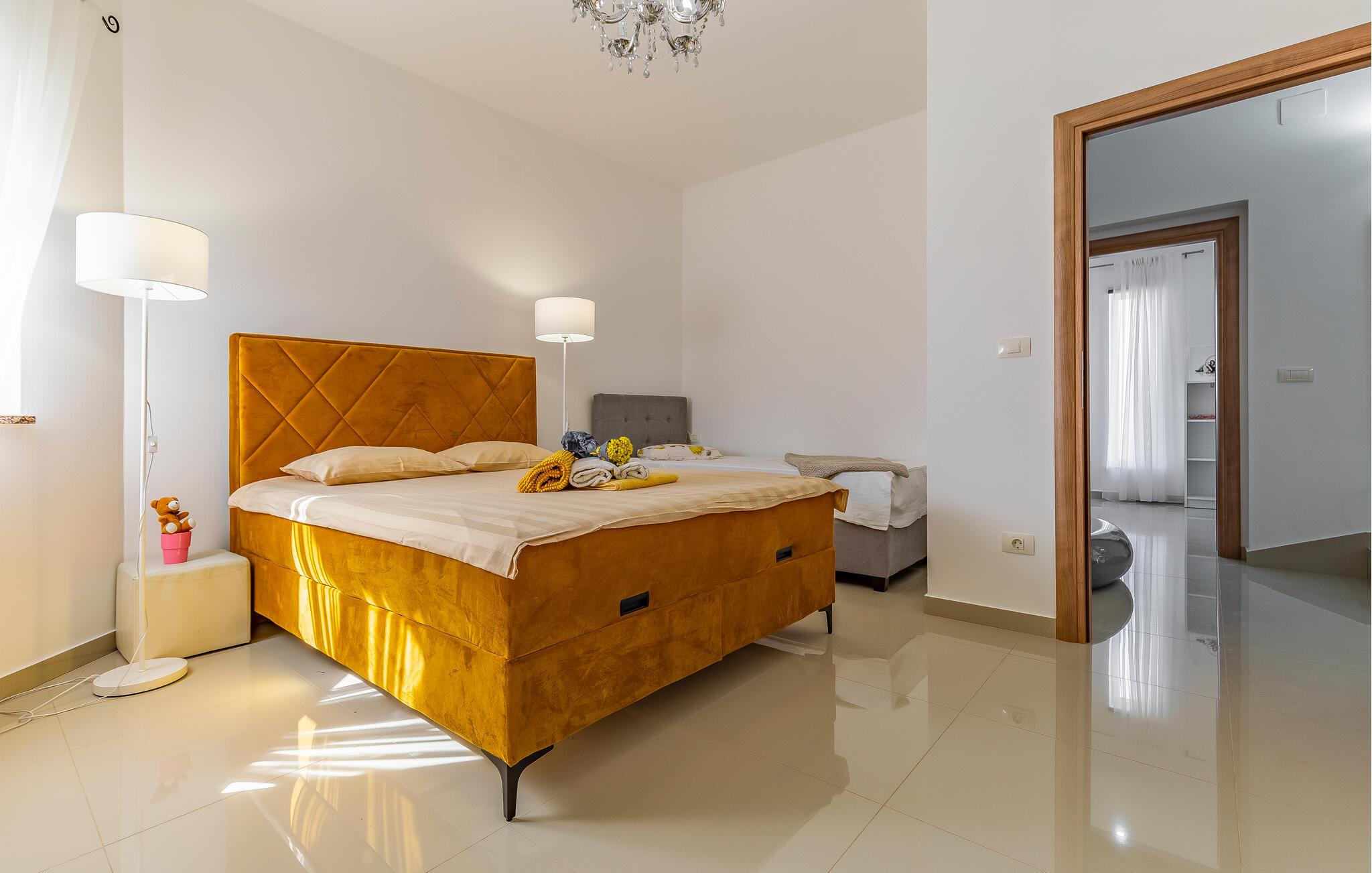 Nur wenige Kilometer nördlich von Pula gelegen, empfängt Sie dieses elegante Ferienhaus zu einem wundervollen Istrien-Urlaub. Genießen Sie das helle Ambiente, während Sie morgens das Familienfrühstück in der offenen Küche zubereiten und sich anschließend am Esstisch angeregt über die Pläne des Tages unterhalten. Später am Tag können Sie in der Küche gemeinsam kochen und dabei vielleicht auch regionale Zutaten zur Verwendung kommen lassen. Der Außenbereich bietet umfassende Möglichkeiten mit verschiedenen Bereichen zum Entspannen und Spielen. Unter der überdachten Terrasse lässt es sich gut grillen, während die Kinder auf dem Spielplatz nebenan toben können. Tauchen Sie ein in den Pool, der Abkühlung sowie Wasserspaß pur verspricht.