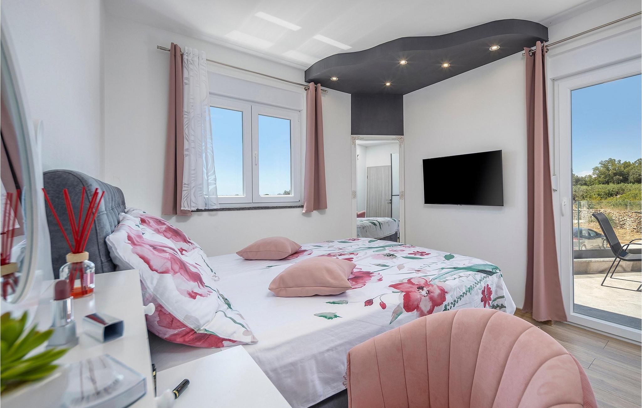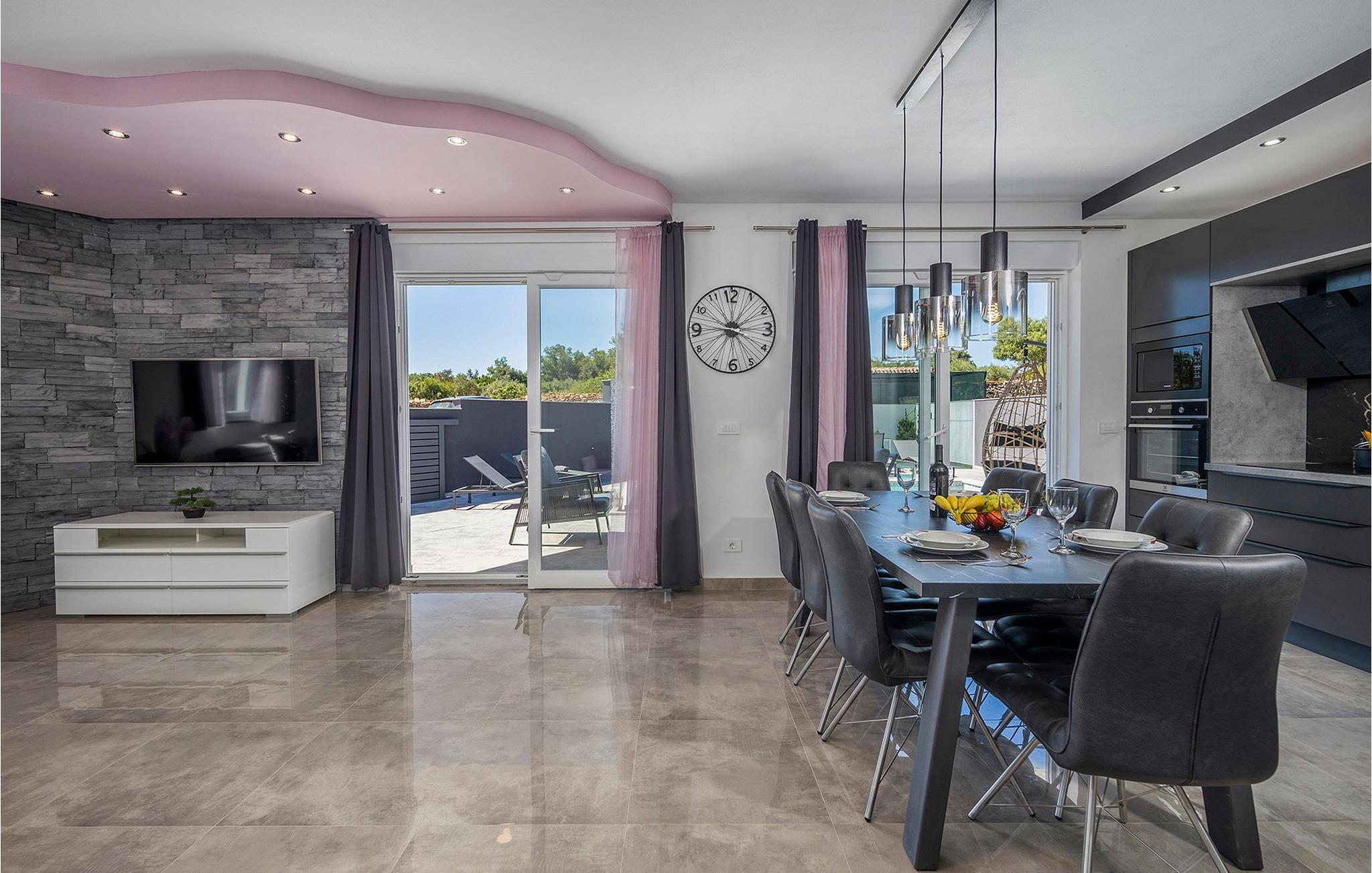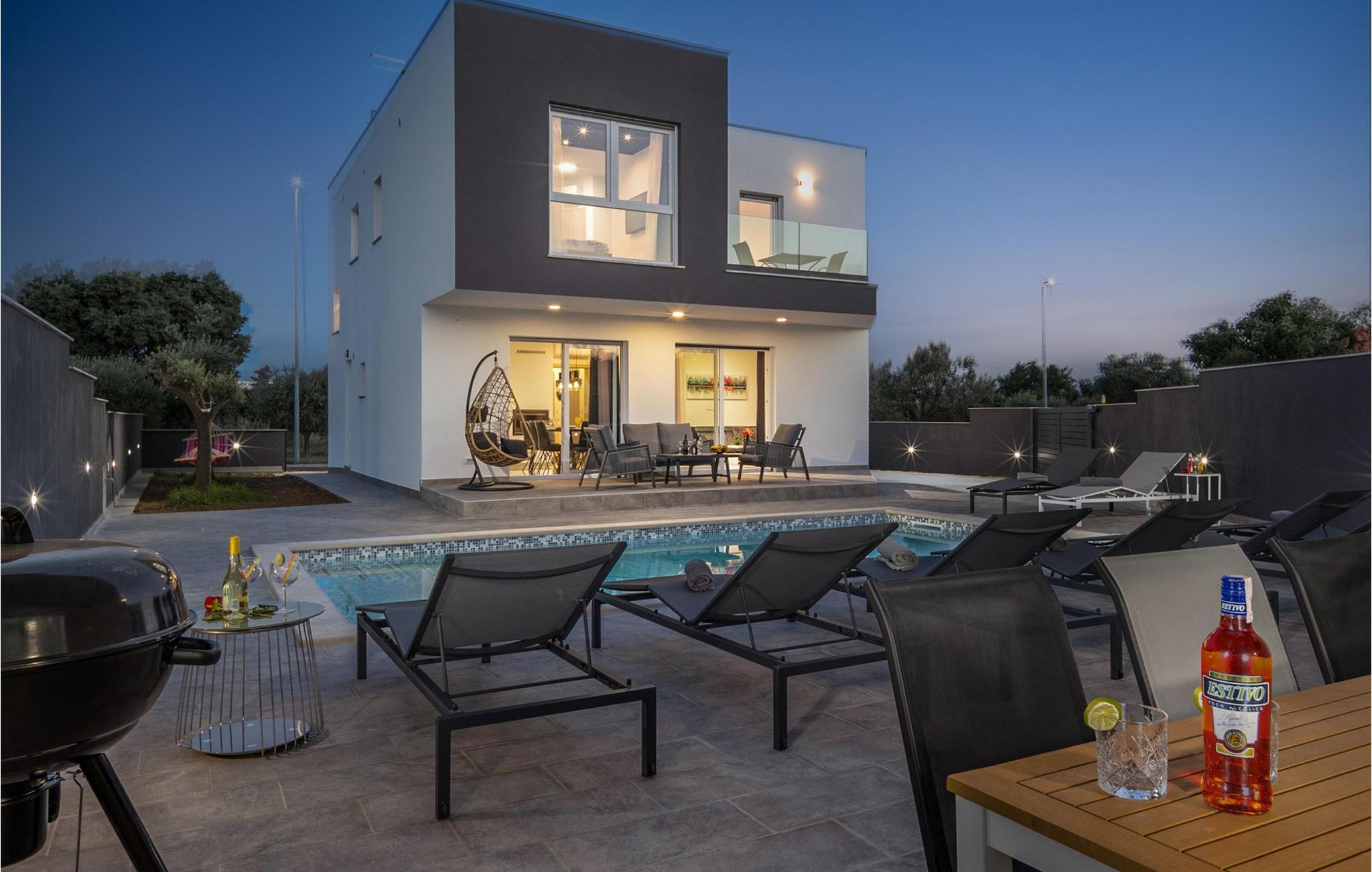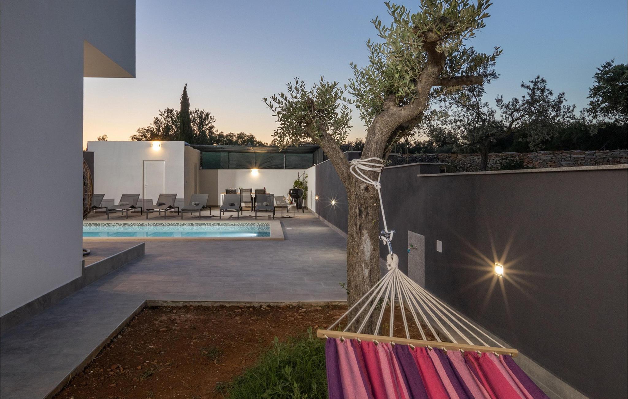 Die wunderschöne Villa Valentina Galižana befindet sich in Istrien, in einem kleinen Dorf Galižana, das an der alten Straße liegt, die Pula und Vodnjan verbindet. Während der Zeit der alten Römer war dieser Ort als landwirtschaftliche Siedlung äußerst wichtig und zeichnet sich heute durch seine kreisförmigen Grundrisse mit Steinplatten aus. Villa Valentina Galižana ist modern gebaut, voll klimatisiert, bietet mit ihrer Fläche von 200 m2 Platz für maximal 8 Gäste und ist ideal für einen erholsamen Urlaub in Gesellschaft von Freunden oder der Familie. Mit seinem wunderschön dekorierten Äußeren zieht es alle Fans des modernen und zeitgenössischen Baustils an. Im Erdgeschoss dieser Villa finden Sie ein Wohnzimmer mit Ecksofa, Couchtisch und Fernseher, daneben gibt es einen Ausgang zur Außenterrasse. In der Nähe des Wohnzimmers befindet sich eine moderne und voll ausgestattete Küche und ein Esszimmer mit Tisch für 8 Gäste. Es gibt auch einen separaten Raum, in dem Sie eine Waschmaschine, einen Trockner und ein Bügeleisen nutzen können. Ein Schlafzimmer befindet sich ebenfalls im Erdgeschoss, während sich die restlichen drei im Obergeschoss befinden. Alle Zimmer verfügen über ein eigenes Bad und die Villa selbst verfügt über 2 separate Toiletten. Sie können in völliger Privatsphäre im 28 m² großen Pool schwimmen, der von 8 Sonnenliegen umgeben ist. Auf der Terrasse gibt es einen Esstisch im Freien mit einem Holzkohle-/Holzgrill. Für alle, die einen aktiven Urlaub verbringen möchten, gibt es auch einen Raum mit der Ausrüstung zum Training. Außerhalb des Hofes stehen Ihnen 4 Parkplätze zur Verfügung. Die Lage der modernen Villa Valentina Galižana bietet Ihnen die dringend benötigte Ruhe und wird Sie mit ihrer Einfachheit, Eleganz und dem Gefühl von Frieden und Ruhe auf jeden Fall verführen. Sie werden sich wie in Ihrem eigenen Paradies fühlen, umgeben von endlosem mediterranen Grün. Nur 5 km von der Villa entfernt liegt die Stadt Pula, die dank Pulas Architektur und Fremdsprachen, vor allem Italienisch, das die Einwohner Istriens aufgrund der Nähe zu Italien sprechen, reich an interessanter Geschichte ist. In Pula gibt es zwei Museen: das Archäologische Museum Istriens und das Historische Museum Istriens. Die Stadt ist bekannt für ihre erhaltenen römischen Gebäude wie das Amphitheater aus dem 1. Jahrhundert, das auch Arena genannt wird, und das Herkulestor, das älteste erhaltene Denkmal römischer Architektur in Pula. Sie werden den Inhalt sicherlich nicht verpassen und wunderschöne Fotos aus dem herrlichen Istrien mitnehmen! Besuchen Sie Istrien, entdecken Sie seine verborgenen Schönheiten, erkunden Sie die Strände und probieren Sie köstliche traditionelle Gerichte. Willkommen in der Villa Valentina Galižana!