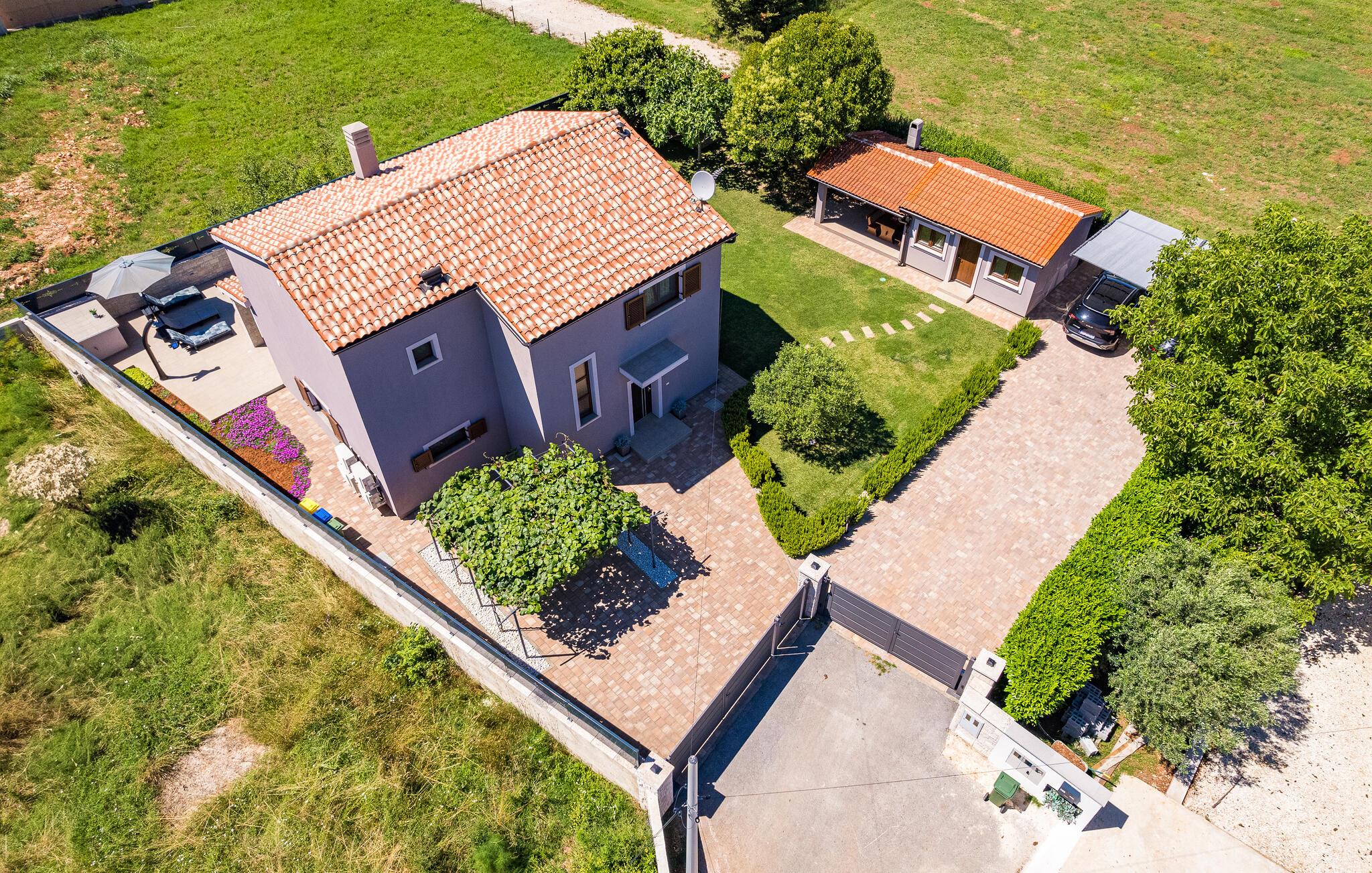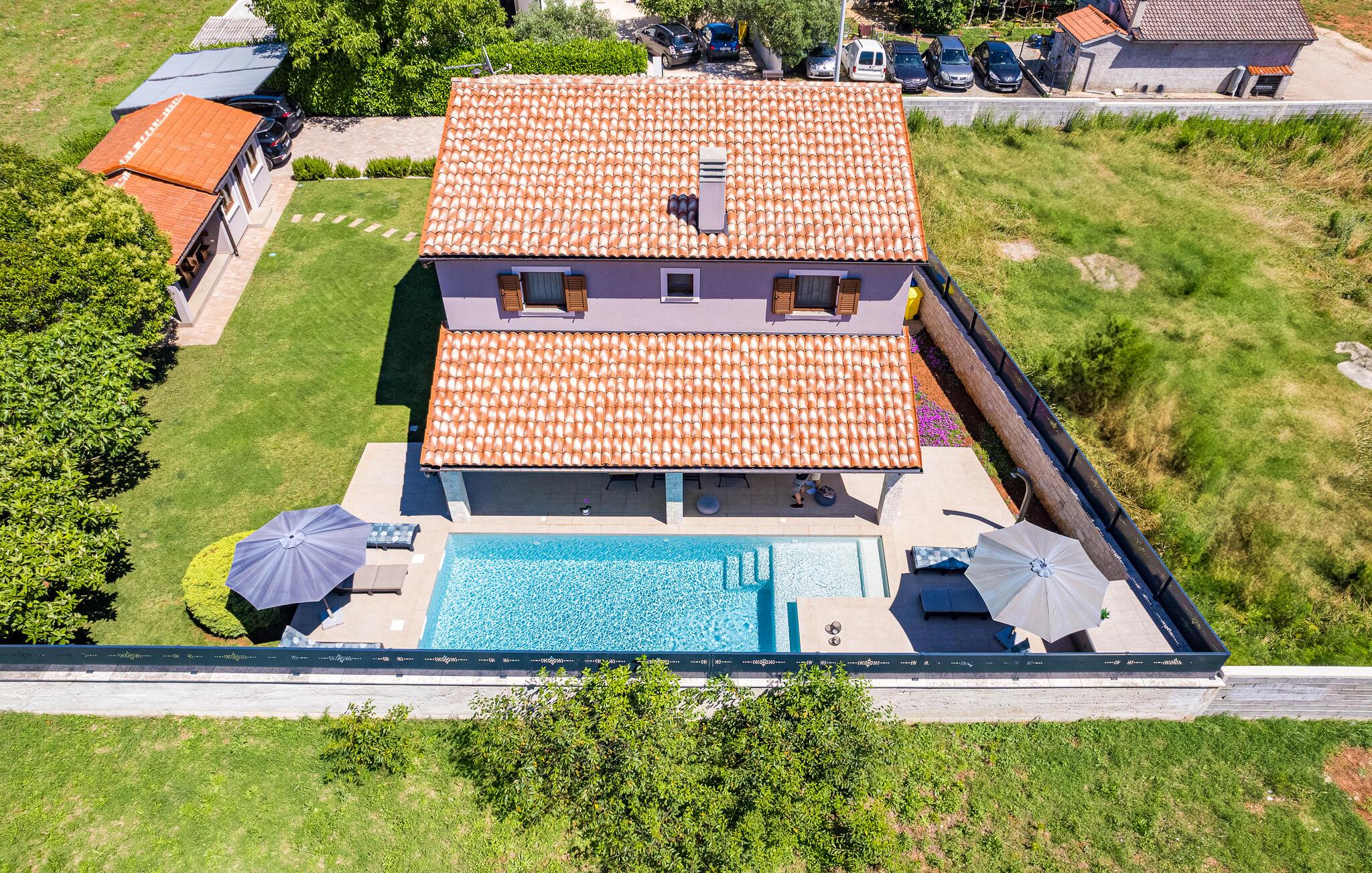 Die Villa Roma befindet sich im südlichem Teil der istrischen Halbinsel und bietet Unterkunft für 6 Personen. Die Villa besteht aus 3 stilvoll eingerichteten und gemütlichen Schlafzimmern, die jeweils klimatisiert sind und über ein eigenes Badezimmer verfügen, sodass alle Gäste während ihres Aufenthalts maximalen Komfort genießen können. Alle Schlafzimmer befinden sich im Obergeschoss. Im Erdgeschoss können sich alle im geräumigen Wohnzimmer mit Kamin und Sat-TV versammeln oder Mahlzeiten in der Küche zubereiten, die mit allem ausgestattet ist, was Sie während Ihres Aufenthalts benötigen. Es gibt auch einen Holzkohlegrill und einen gemütlichen überdachten Essbereich, wenn Sie lieber im Freien essen. Der einladende Pool ist nur wenige Schritte vom Wohnzimmer entfernt und bietet zu jeder Tageszeit Erfrischung. Das nächste Geschäft und Cafe sind nur einen kurzen Spaziergang von der Villa entfernt und befinden sich im Zentrum des Dorfes. Wenn Sie den Tag am Strand verbringen möchten, gibt es in der Umgebung zahlreiche Möglichkeiten, da der südliche Teil Istriens eine sehr abwechslungsreiche Küste hat. Die Villa ist klimatisiert, haustierfreundlich und verfügt über 2 private Parkplätze und einen komplett umzäunten Garten - die perfekte Wahl für einen erholsamen Urlaub.Villa Roma befindet sich in der kleinen Ortschaft Jadreski nur ca. 7 km entfernt von Pula. Pula ist die größte Stadt der istrischen Halbinsel und eine der wichtigsten touristischen Städten mit zahlreichen zu sehen und zu erkunden. Pula wurde von Römern erbaut in 46 b.c. Obwohl Pula wie ein antikes Museum im Offenen ist, müssen Sie unbedingt auch das größte Denkmal, das berühmte Amphitheater aus dem 1. Jahrhundert besuchen, es befindet sich nah an der Innenstadt. Hier finden viele Veranstaltungen statt, von Konzerten und Filmvorführungen bis zu Sportveranstaltungen. In der Altstadt befindet sich das Forum mit dem Augusttempel. Hier können Sie auch das historische Museum Istriens und das archäologische Museum Istriens besuchen. In der Umgebung können Sie schöne kleine istrische Städtchen besichtigen, Naturstrände erkunden und wandern, Rad fahren oder tauchen gehen. Probieren Sie auch köstliche istrische Spezialitäten während Ihres Aufenthalts.