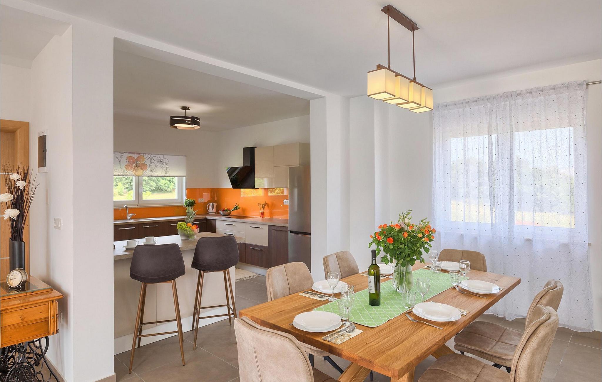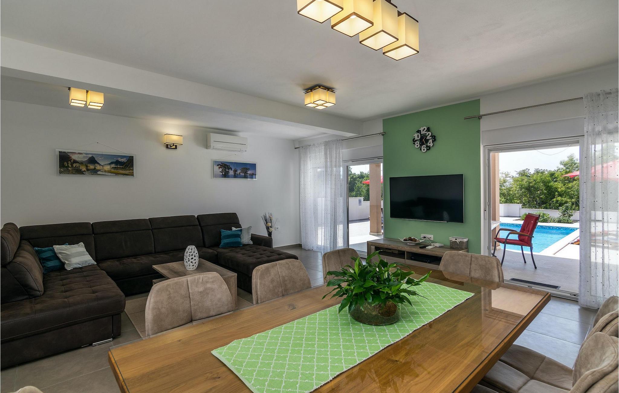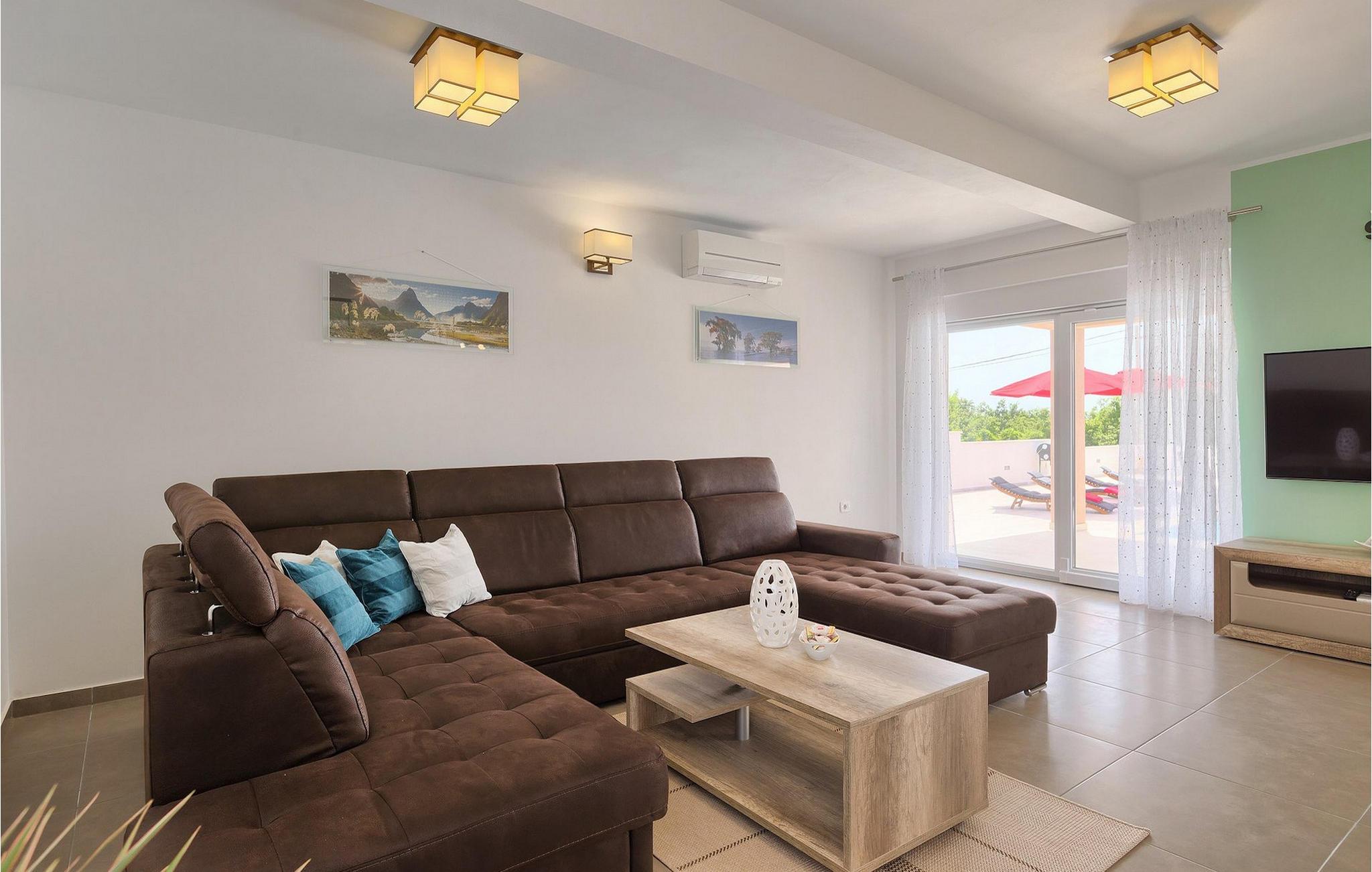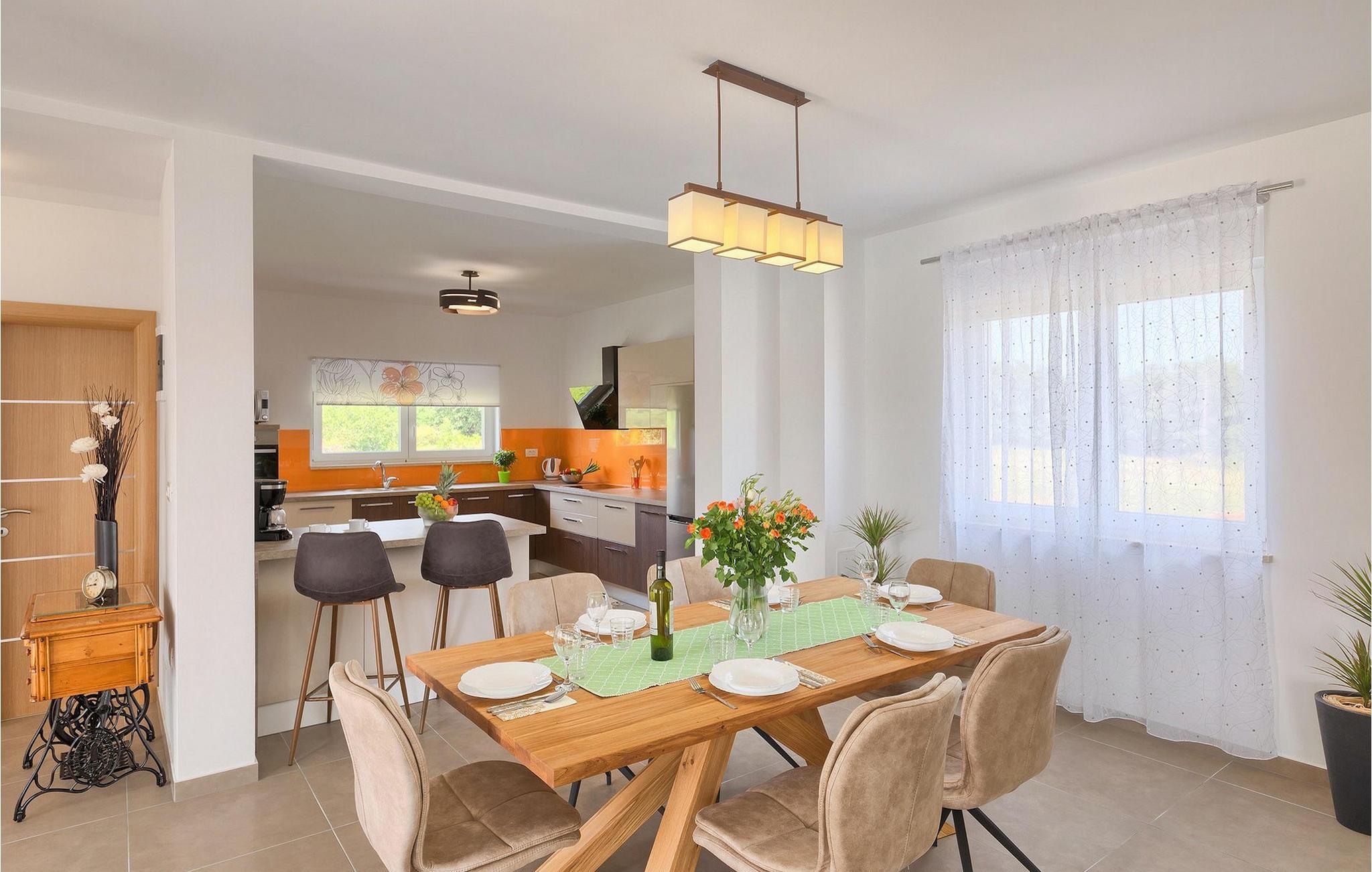 Villa Lena ist eine ideale Wahl für all diejenigen, die ihren Urlaub in einer natürlichen Umgebung ohne viele Nachbarn verbringen möchten, so dass sie sich richtig entspannen können. Die Villa bietet kann bis zu 6 + 2 Personen in 3 Schlafzimmern beherbergen. Das Interieur wurde mit sanften Naturfarben dekoriert, so dass Sie sich, sobald Sie die Villa betreten, wie zu Hause fühlen können. Das Erdgeschoss besteht aus einem offenen Wohnbereich mit komfortabler Eckgarnitur und TV, einem Essbereich und einer völlig ausgestatteten Küche mit Frühstücksbar. Ein Doppelzimmer und ein Badezimmer befinden sich ebenfalls auf dieser Etage. Die anderen beiden Schlafzimmer mit eigenem Bad sowie eine überdachte Terrasse befinden sich auf der ersten Etage. Die Terrasse bietet einen schönen Ort, von dem aus Sie die Aussicht auf die Umgebung genießen können.