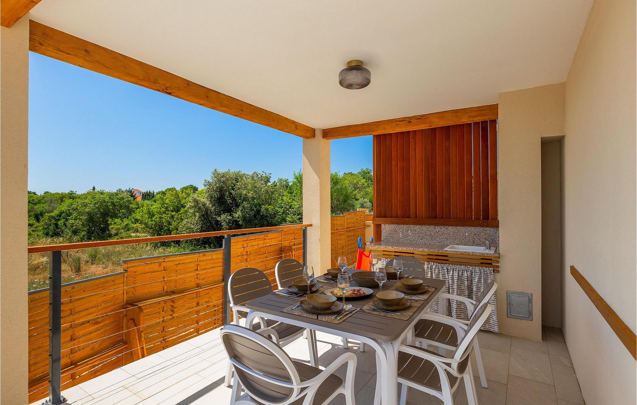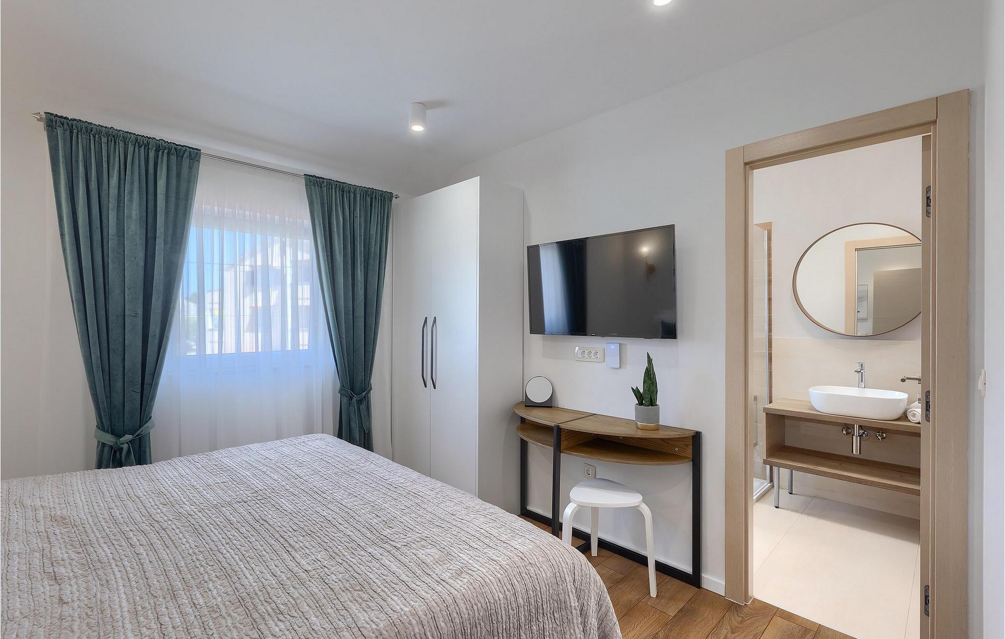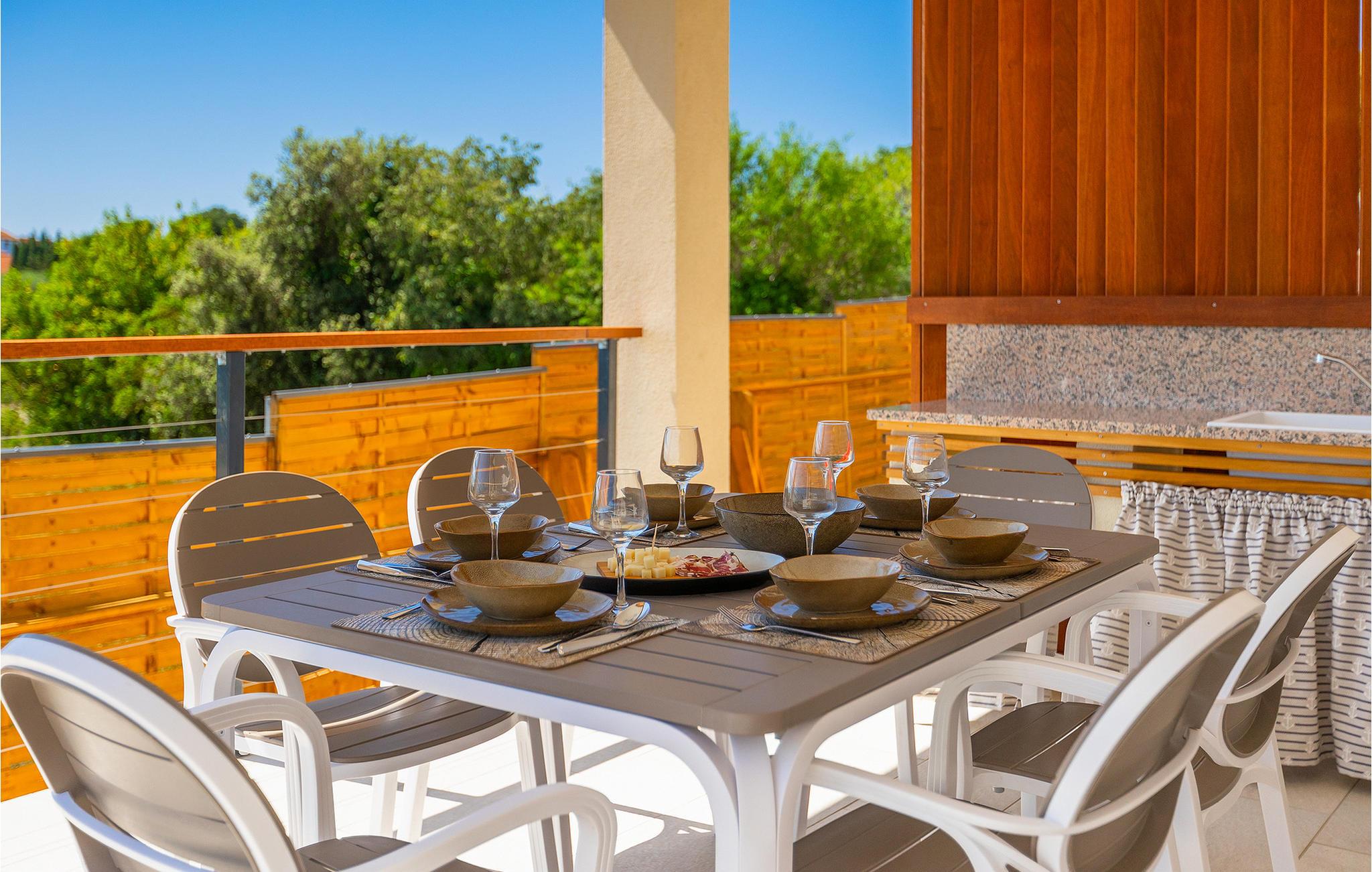 Die schöne Villa Veduta befindet sich im westlichen Teil von Istrien und ist ein ideales Haus für bis zu 6 Gäste. Die Villa besteht aus einem Innen- und einem umzäunten Außenbereich, einem privaten Pool und einer Terrasse mit herrlichem Blick auf die Küste und Natur. Genießen Sie die einzigartige Aussicht von der Terrasse aus, entfliehen Sie der Sommerhitze im privaten Pool oder genießen Sie einfach ein kühles Getränk, während Sie die Sonnenstrahlen auf den Liegestühlen fangen. Diese Villa bietet einen Grill wo sie Speisen vorbereiten können, eine Entspannungsecke im Schatten und einen Spielplatz mit Schaukel und Rutsche für Kinderspiele. Von der Terrasse aus hat man direkten Zugang zum Innenbereich, der aus einem geräumigen Wohnzimmer, einer voll ausgestatteten Küche und einem Esszimmer sowie einem Badezimmer besteht. Die Treppe führt in den ersten Stock des Hauses, wo sich 2 moderne Schlafzimmer mit Doppelbett und eigenem Badezimmer befinden, die klimatisiert sind und einen TV verfügen. Ein Freizeitraum mit Billard und Pikado sorgt für Spaß und Unterhaltung im Kreise Ihrer Liebsten. Buchen Sie die Villa Veduta und sorgen Sie für einen sorgenfreien Urlaub!Die Villa Veduta befindet sich in einer ruhigen Lage, aber in der Nähe der größeren Städten in dieser Region: Pula, Labin und Rabac. Pula ist die größte Stadt in Istrien und bietet eine große Auswahl von Bars, Restaurants und Sehenswürdigkeiten. Ein Besuch des berühmten Amphitheaters aus dem 1. Jahrhundert ist eine unvergessliche Erfahrung. Es befindet sich im Stadtzentrum und wir empfehlen eine Besichtigung, um mehr über das imposante Gebäude von großem historischen Wert zu erfahren. Hier finden zahlreiche Veranstaltungen statt, z. B. Konzerte, Filmvorführungen und Sportereignisse. Die Umgebung bietet zahlreiche Möglichkeiten zur Freizeitgestaltung: Radfahren, Reiten, Joggen, Wandern und vieles mehr. Naturliebhabern empfehlen wir einen Ausflug in den nahe gelegenen Nationalpark Brijuni oder zum Kap Kamenjak, wo Sie unberührte Naturschönheiten und natürliche Besonderheiten genießen können. Nicht weit entfernt liegen Labin und Rabac, die für ihre schönen Kieselstrände mit kristallklarem Meer bekannt sind. Machen Sie einen Spaziergang entlang der Küste und probieren Sie istrische Spezialitäten wie Nudeln mit Trüffeln oder Prosciutto, natürlich mit einem Glas des berühmten istrischen Malvasia. Diese mittelalterlichen Städte sind bekannt als die Stadt der Künstler, so dass Kunstliebhaber die Ateliers und Galerien mit Kunstwerken in den Steinstraßen besuchen können.